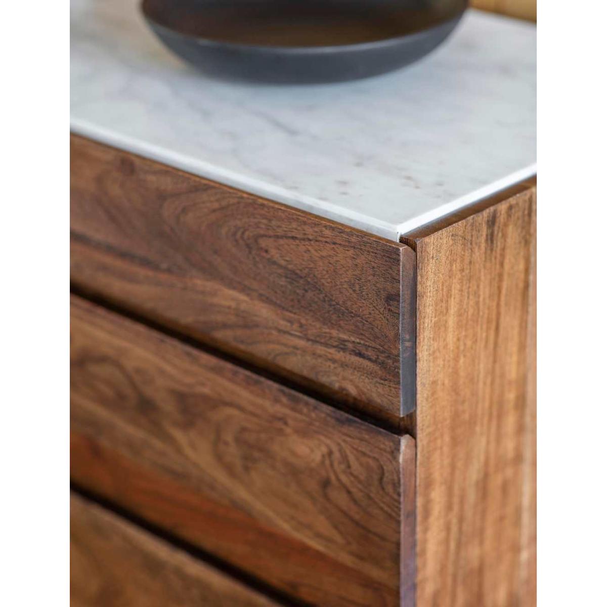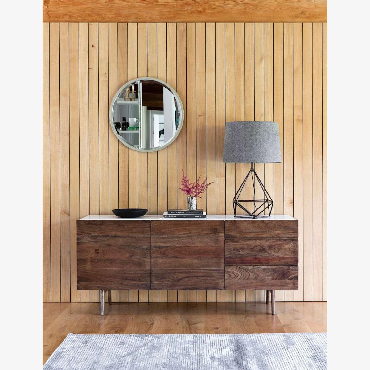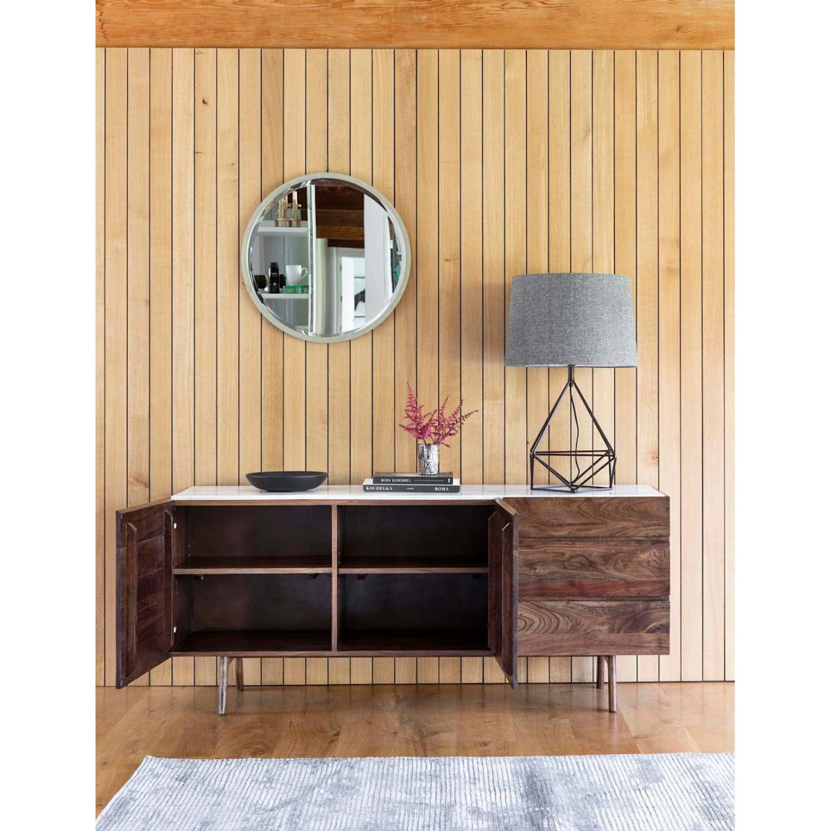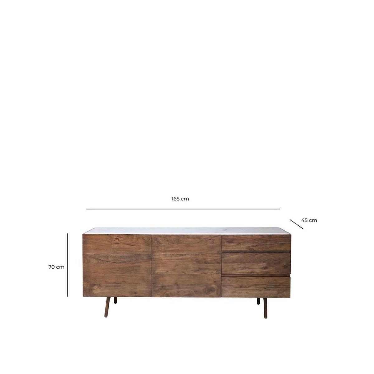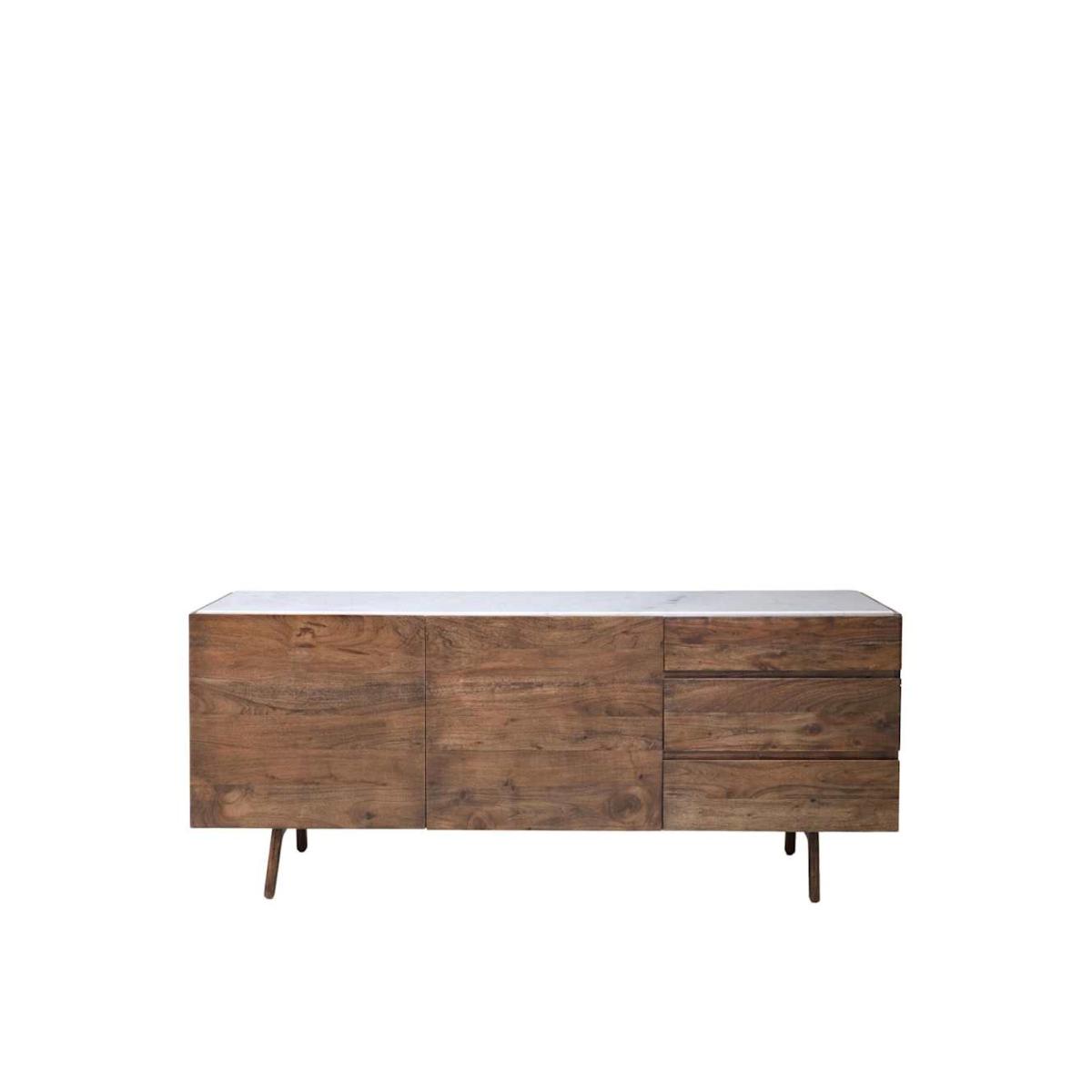 The Barcelona sideboard from Gallery Direct combines luxurious materials with functional design. Its inlaid white marble top provides a striking contrast against the acacia finish, showcasing a beautiful wood texture. Sleek, modern lines and high spindle legs create a sophisticated silhouette, while three drawers and two cupboard doors offer generous storage.