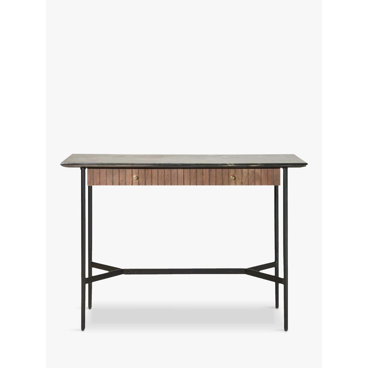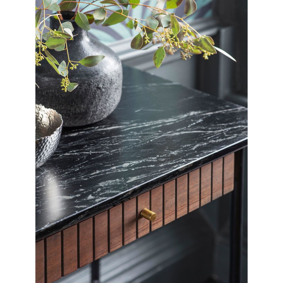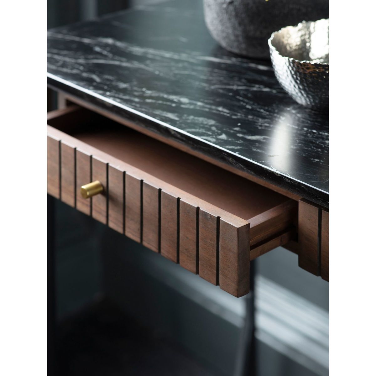 Made from a combination of Acacia wood and Black Indian marble, this sturdy console table from Gallery Direct will bring a statement feel to your space. Its luxe design captures the style of a New York apartment, with its minimalist metal frame and ribbed drawer front. The marble is accented with a white vein throughout for an authentic finish. Want to see it first?. You may want to see and get a feel for the furniture in one of our shops before ordering. If you do plan on doing this we recommend giving us a call on 03452 661805 as not all our ranges are on display in our shops. We'll be able to tell you where the range you'd like to view is on display.