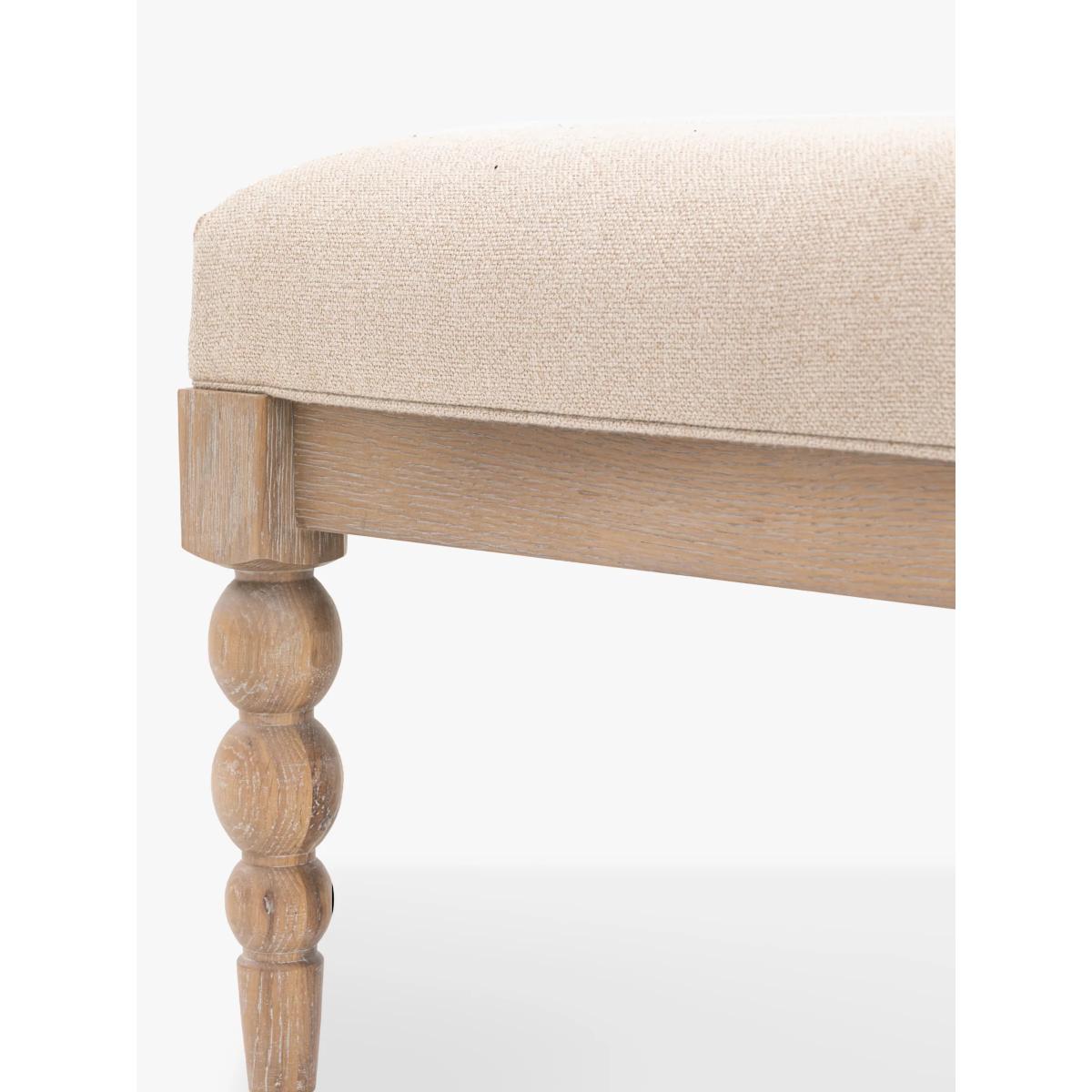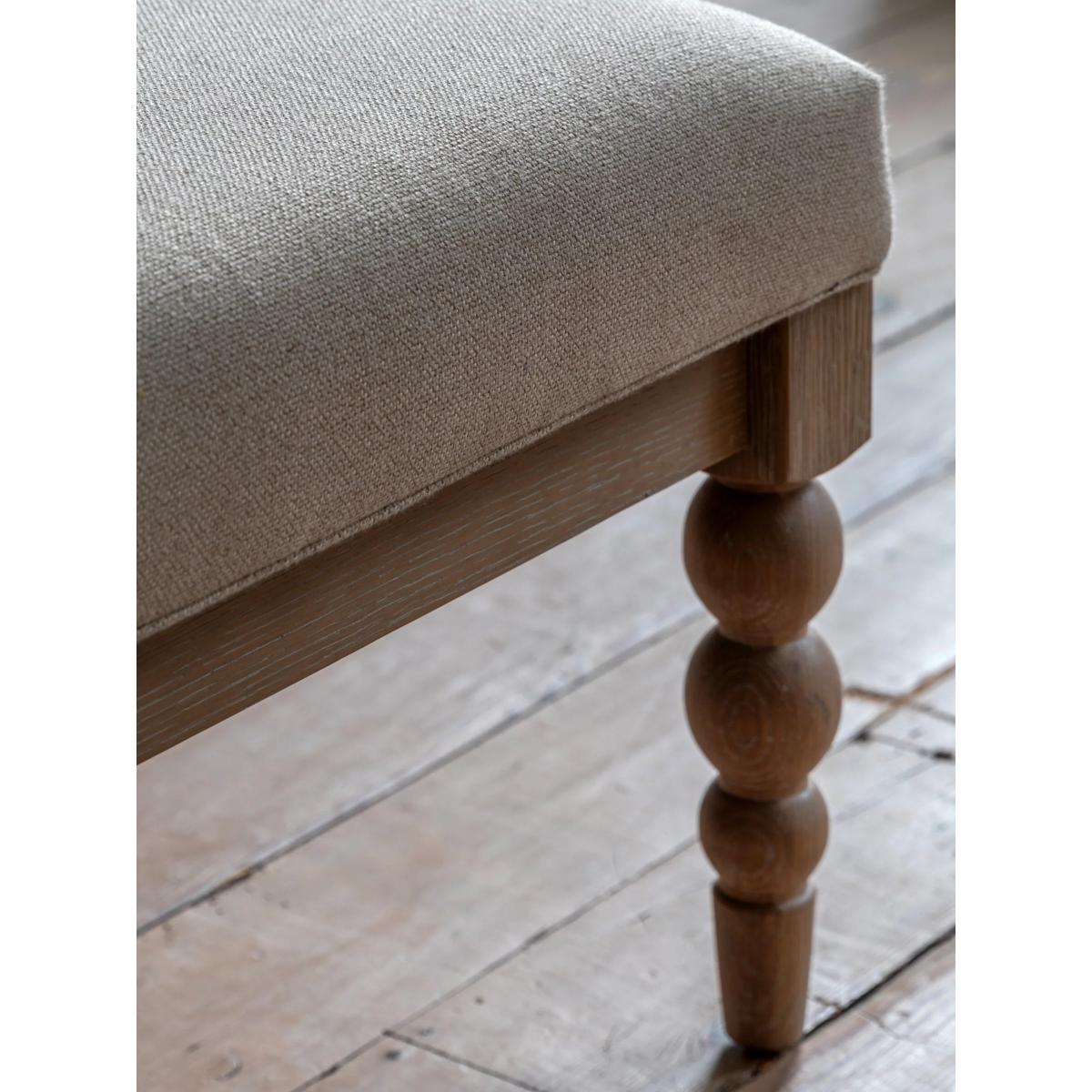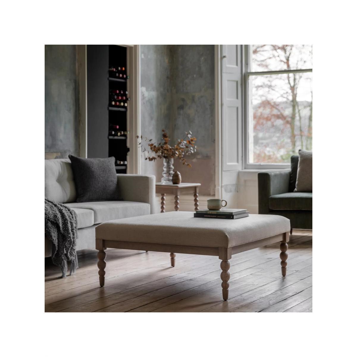 The eye-catching legs on this beautiful coffee table feature hand-crafted "bobbing" detail which is created by turning the wood on a lathe, a task carried out by the finest craftsmen. The table is made from oak with a very subtle lime wash tone to the finish, which is soft and mellow, paired with biscuit-coloured fabric for the upholstered seat. Matching pieces are available. Matching pieces are available. Want to see it first? You may want to see and get a feel for the furniture in one of our shops before ordering. We'll be able to tell you where the range you'd like to view is on display.