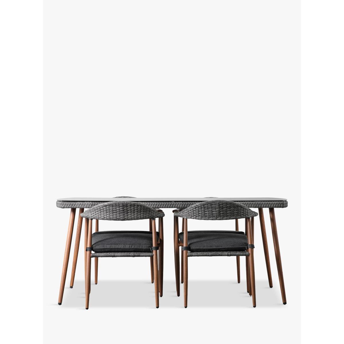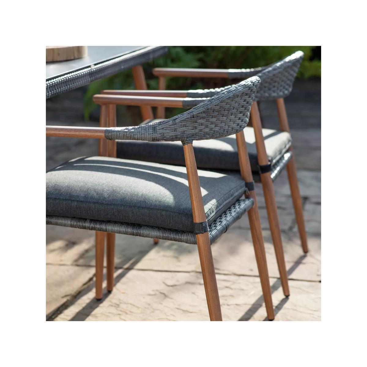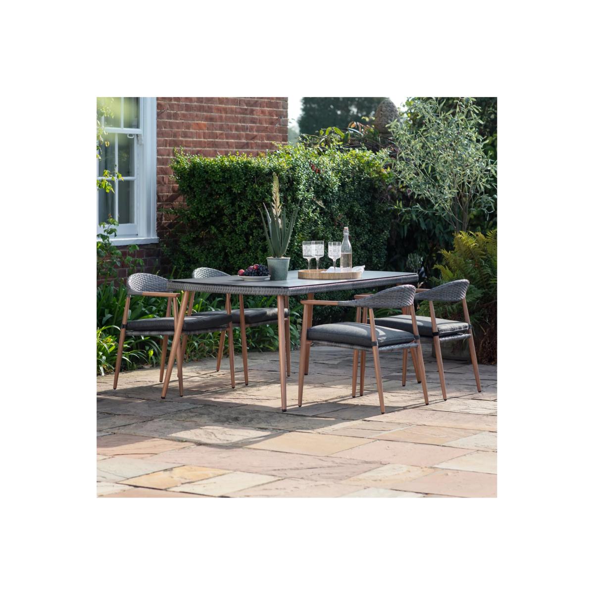 A contemporary Scandinavian-inspired dining set from Gallery Direct, this style combines wood-effect frames with braided backrests and seats in a stylish double-ribbed half-round weave. The set includes four armchairs plus a rectangular dining table with a frosted glass top. The set comes with seat cushions that are resistant to light rainfall and are foam-filled for comfort. Key features: Four armchairs and a rectangular dining table Wood-effect vinyl-wrapped aluminium frames All-weather woven polyrattan seating and backrests Shower-resistant seat cushions Seat height: 49cm Want to see it first? You may want to see and get a feel for the product in one of our shops before ordering. We'll be able to tell you where the range you'd like to view is on display.