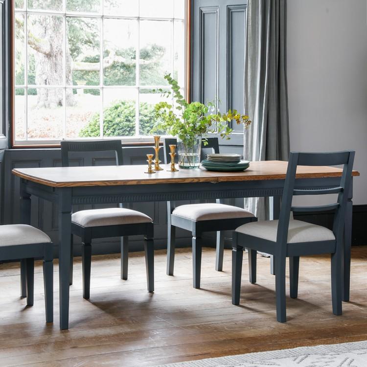Bronte Extendable Dining Table in Storm Blue, from Olivia's. Add a beautiful centrepiece to your dining area with the rectangular Bronte Extendable Dining Table. The perfect addition to bring a rustic-meets-modern touch to your interior decor, with the room to entertain. This traditionally styled table has a warming appeal. Finished with a contrasting wood top, the beautiful shade of Storm Blue stands out, creating a subtle statement piece to your home. Its large surface area and extendable potential give this dining table all the practicality you need as well as style, allowing it to work beautifully with any interior style, modern or traditional.