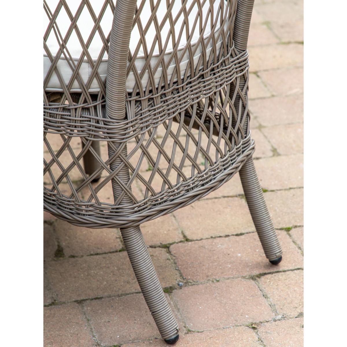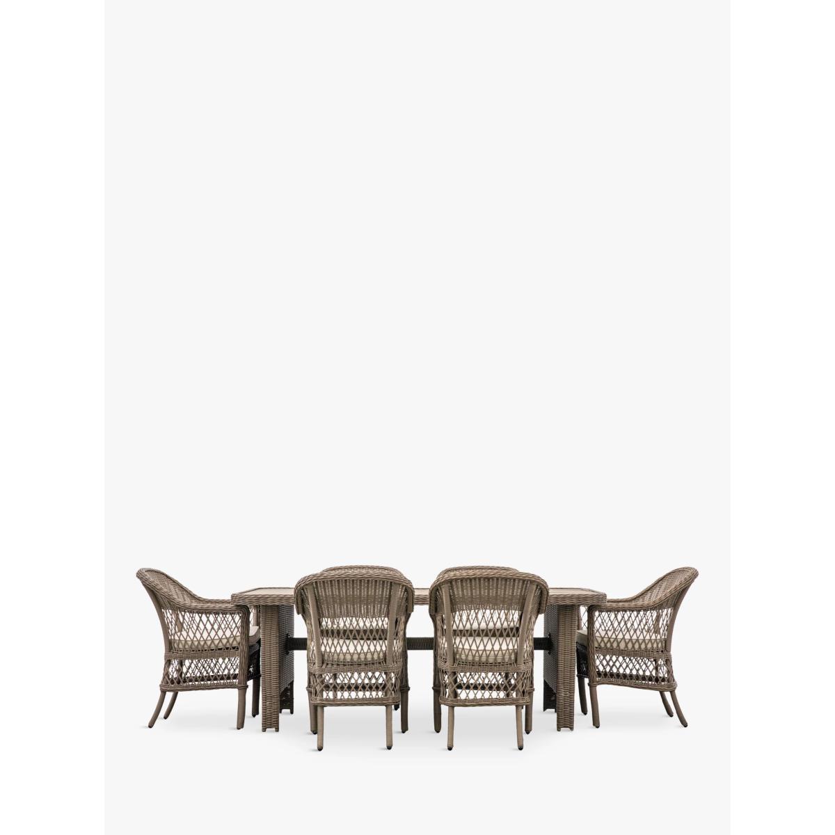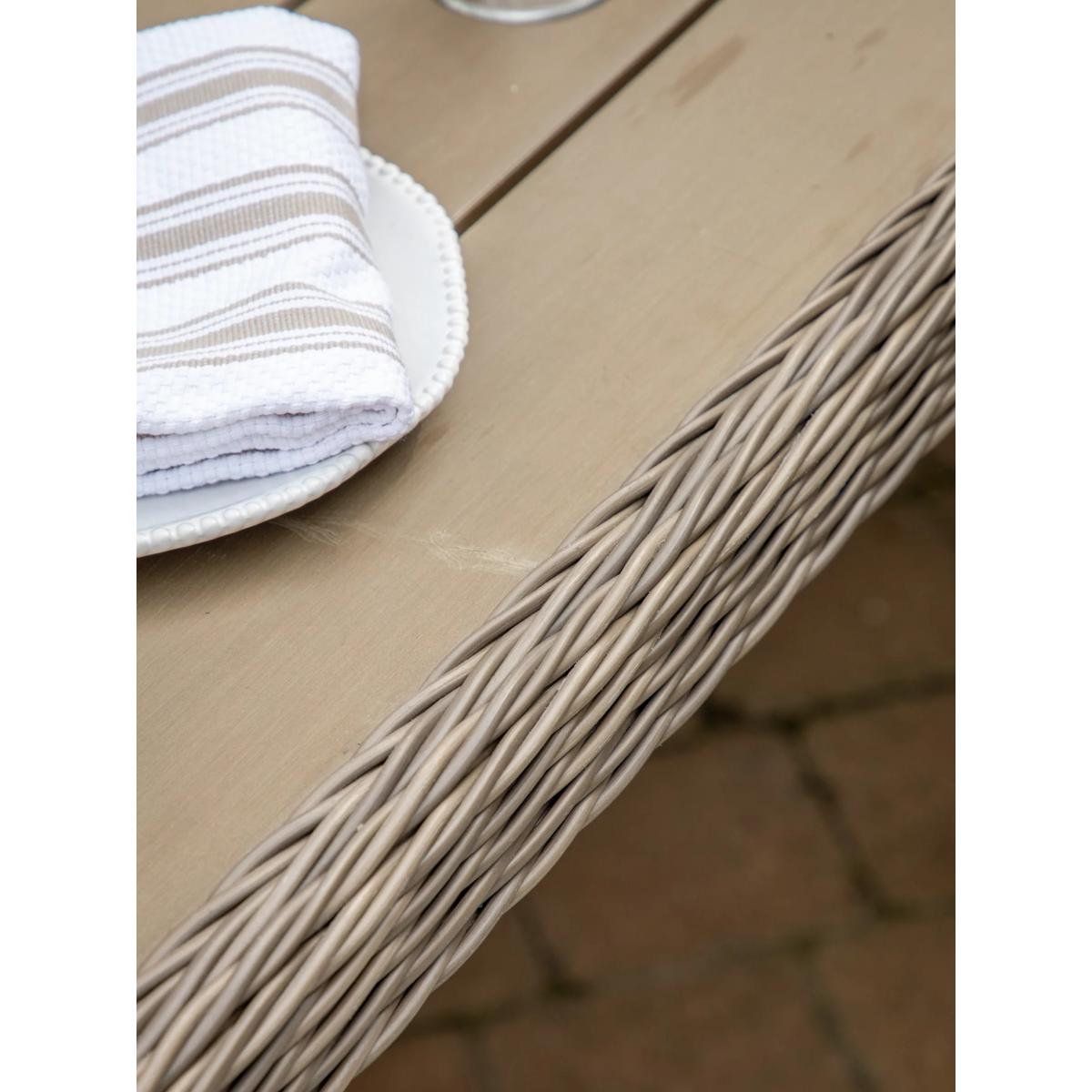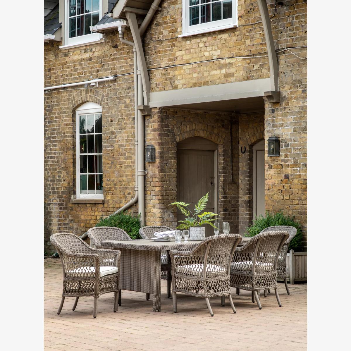 This elegant garden dining set from Gallery Direct features stylish design and a lovely combination of open and close full-rounded weave in synthetic rattan patterns. It includes a dining table and six dining armchairs. All the pieces have robust aluminium frames, the seating has showerproof cushions and the table has a polywood plank top, making the furniture set weather-resistant. Key features: Rectangular garden dining table with polywood plank top and six armchairs Aluminium frames Weather-resistant synthetic rattan in full-rounded weave Showerproof seat cushions Matches furniture in the Cady range Choose the perfect outdoor furniture We have a vast selection of furniture for you to choose from which will suit the home or garden. The majority of our furniture ranges have been hand woven using a synthetic wicker. The thinner the weave, the longer it takes for the skilled workers to complete. All weave types are durable so they’ll last throughout the seasons All woven outdoor furniture is UV protected so it will not fade in direct sunlight All woven outdoor furniture is easy to maintain, simply wipe clean using warm water FlatA weave of various widths which offers incredible value for money Half roundMore detailed with a 3D effect, the half round is a round weave in half which displays a wicker appearance on the top and hollowed underside Double half roundA double strand of half round, this is a wider width of weave which achieves an expensive appearanceRound weaveA very tight weave which is available in various widths, from 2mm to 5mm RopeA selection of our ranges have been made using rope. The yarn is made up of 10,000 (approx) woven strands with a double core for extreme strength, does not attract mould even if wet for a long time and is UV resistant.