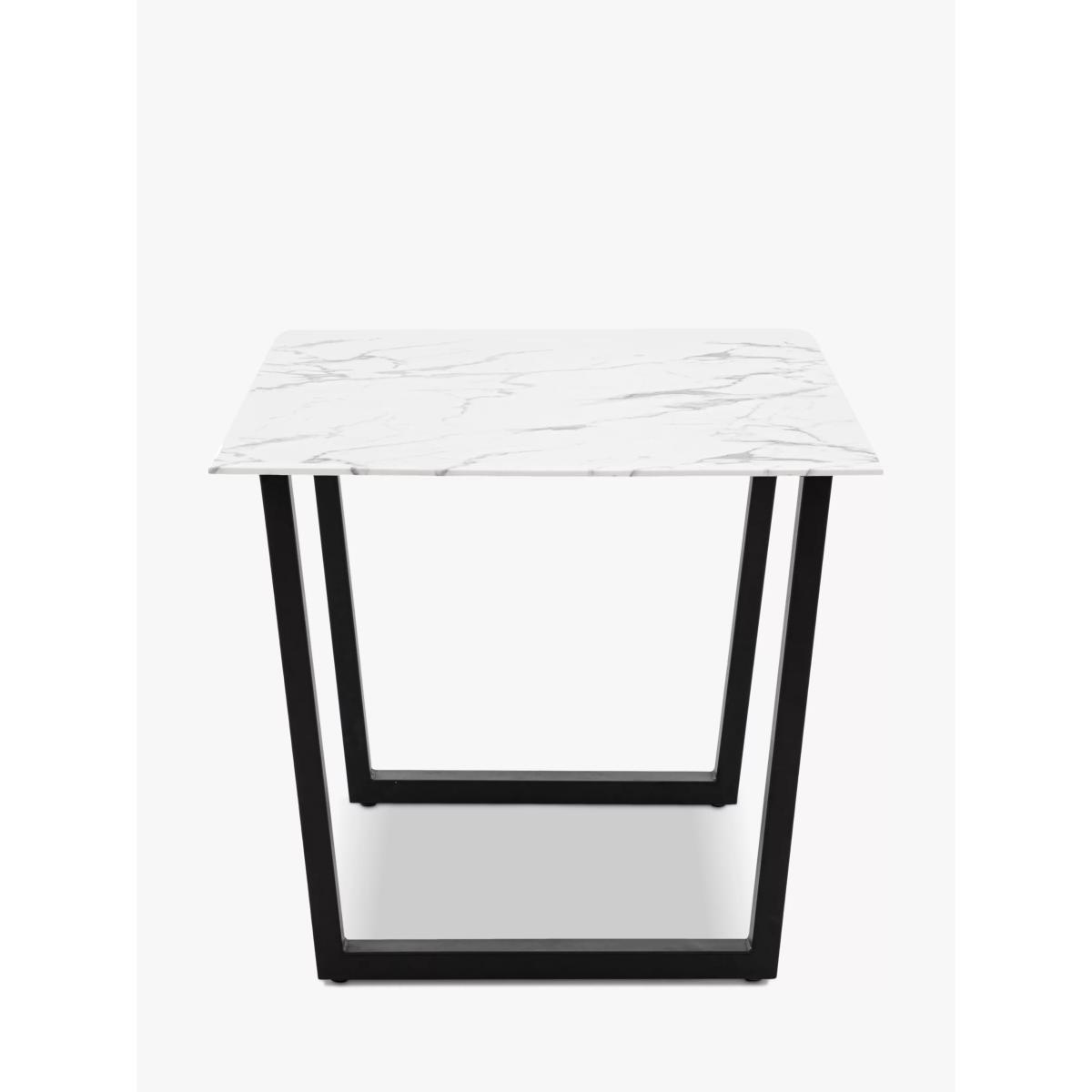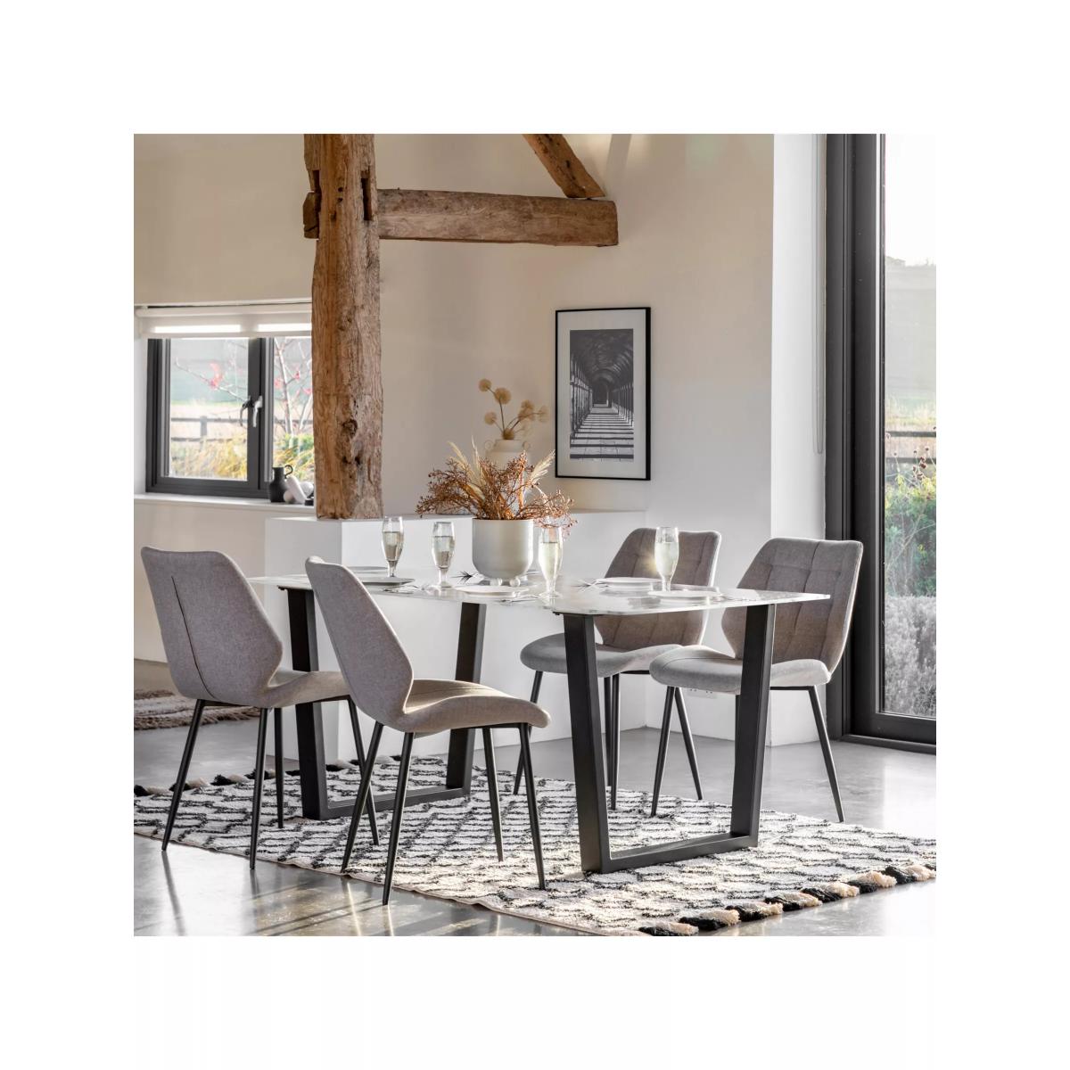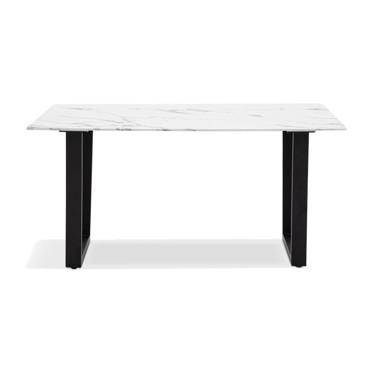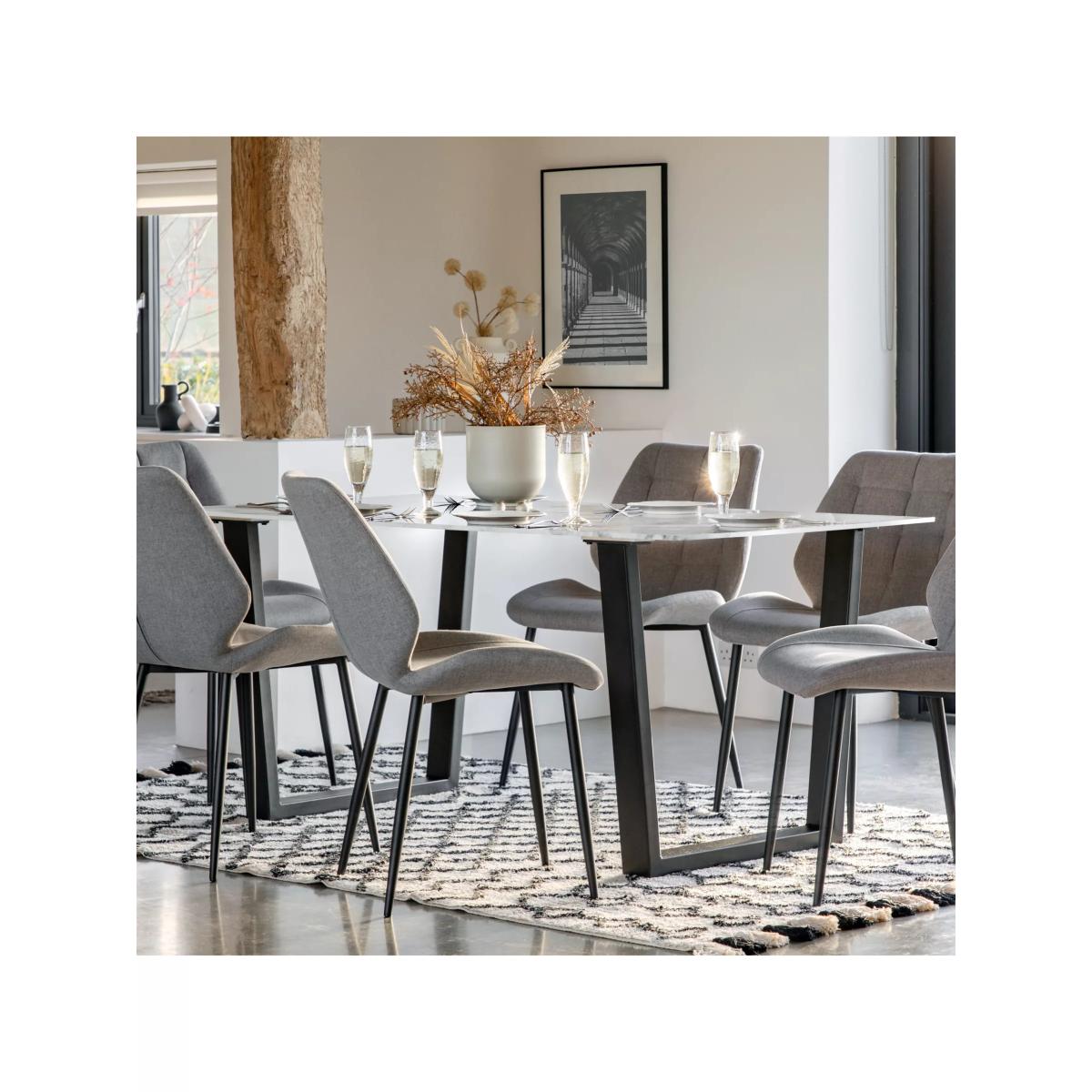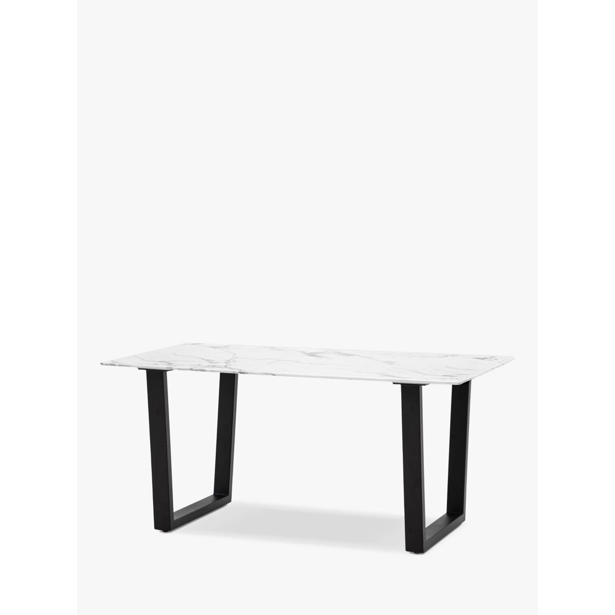 Statement dining table featuring a faux-marble glass top paired with a metal frame and distinctive angled legs, creating a sophisticated contemporary piece. Available in black with a matt black frame, or white with a matt black frame, it seats up to 6 people. Want to see it first? You may want to see and get a feel for the furniture in one of our shops before ordering. We'll be able to tell you where the range you'd like to view is on display.