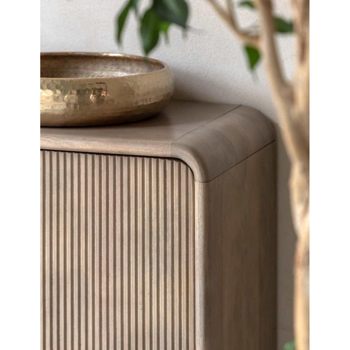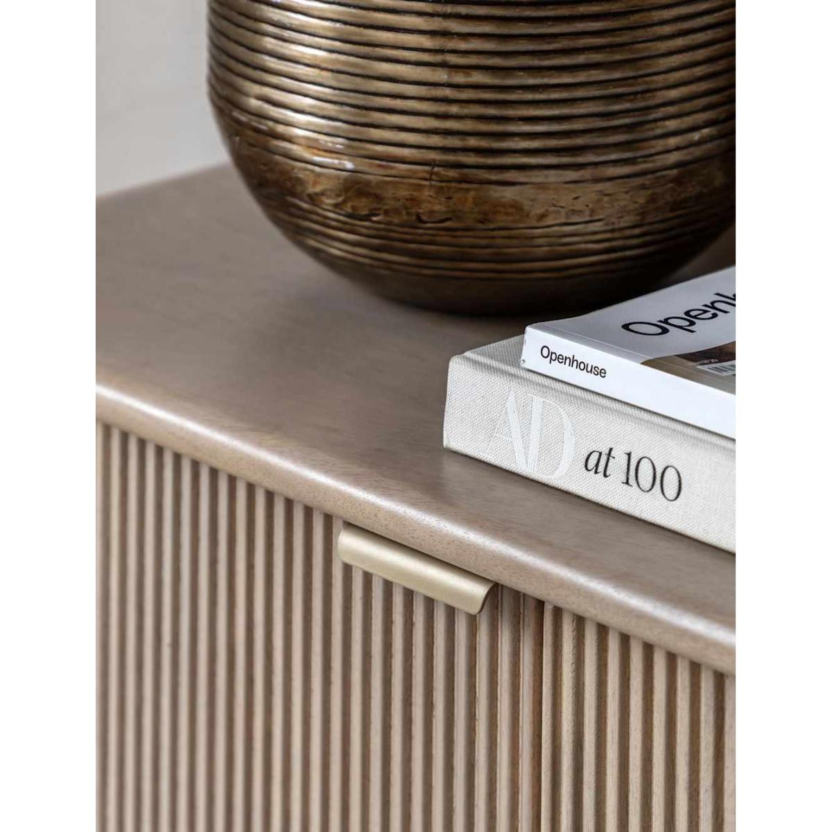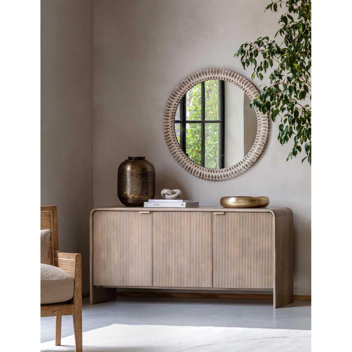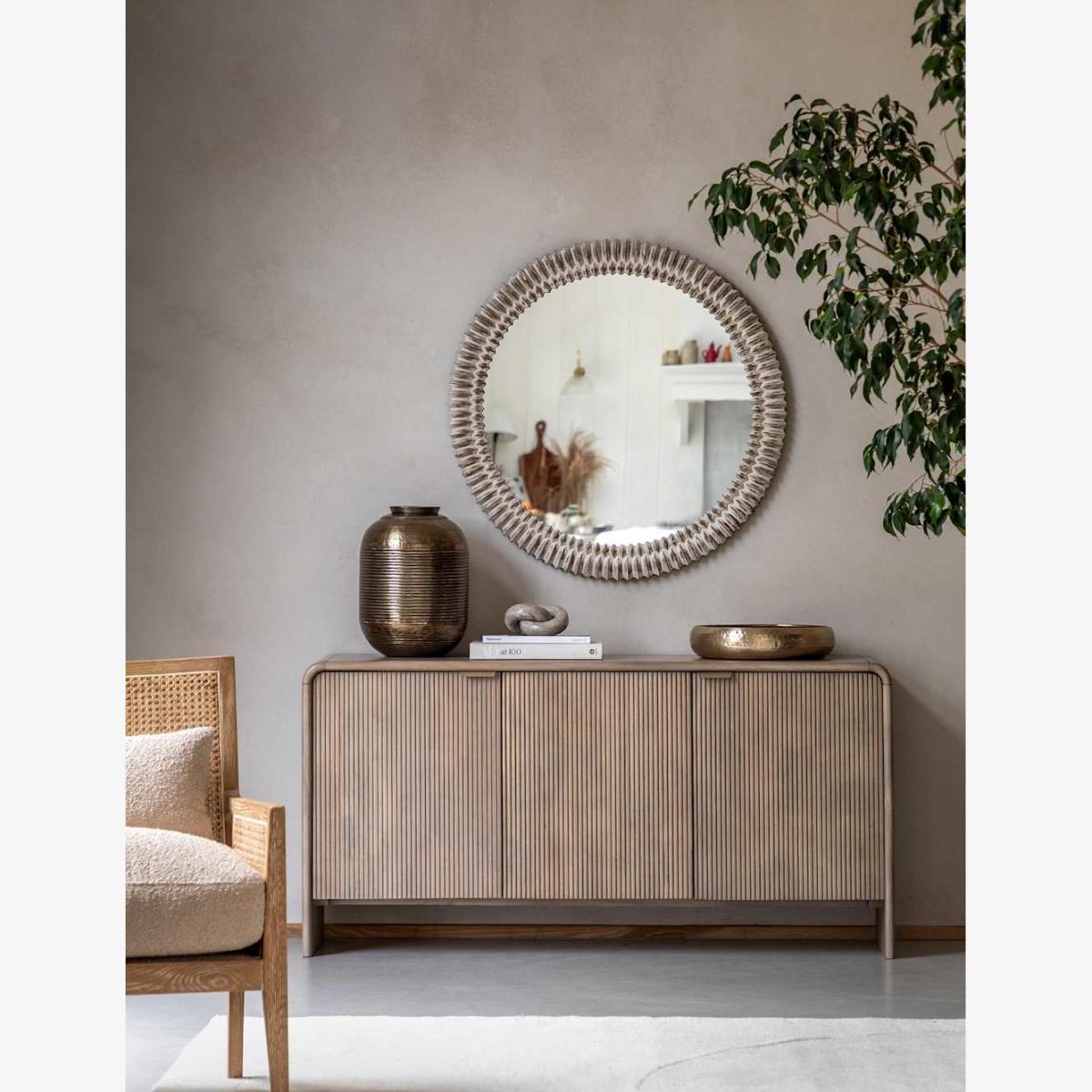 This large sideboard from Gallery Direct is a stylish storage solution for your living space. Crafted from a mango wood veneer, it has a spacious three-door design that can accommodate a TV up to 55 inches. Its curved lines are complemented by textured fluting and brass handles for an elegant, modern finish.