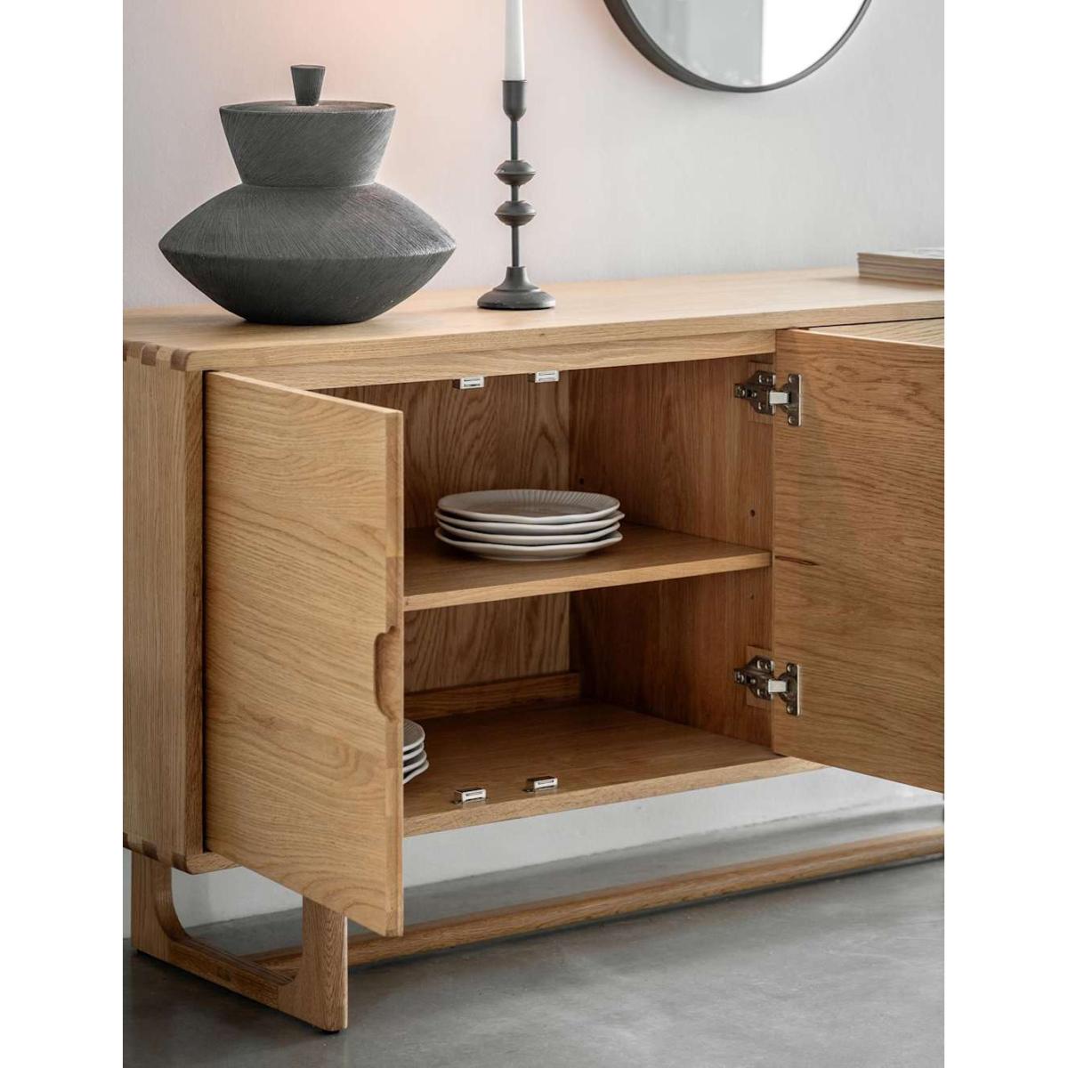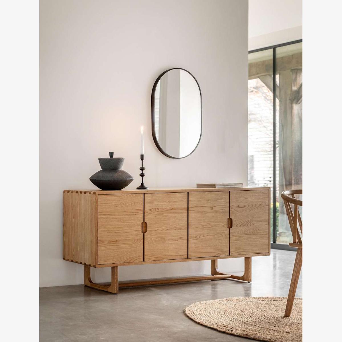 I love this craft sideboard for its crisp joinery detail and warm oak finish, which instantly lifts a neutral or Scandi-inspired interior. Its clean lines and recessed handles work equally well in Japandi, minimalist or even modern farmhouse schemes, thanks to the natural oak tone and subtle craftsmanship. To style it practically, use the top as a low display area - a round mirror above helps soften the rectilinear shape, while a mix of ceramics or a sculptural candleholder adds texture without clutter. Inside, it’s ideal for hiding away dining linens, board games or office supplies; keep the doors aligned and the surface clear to emphasise the piece’s refined simplicity.