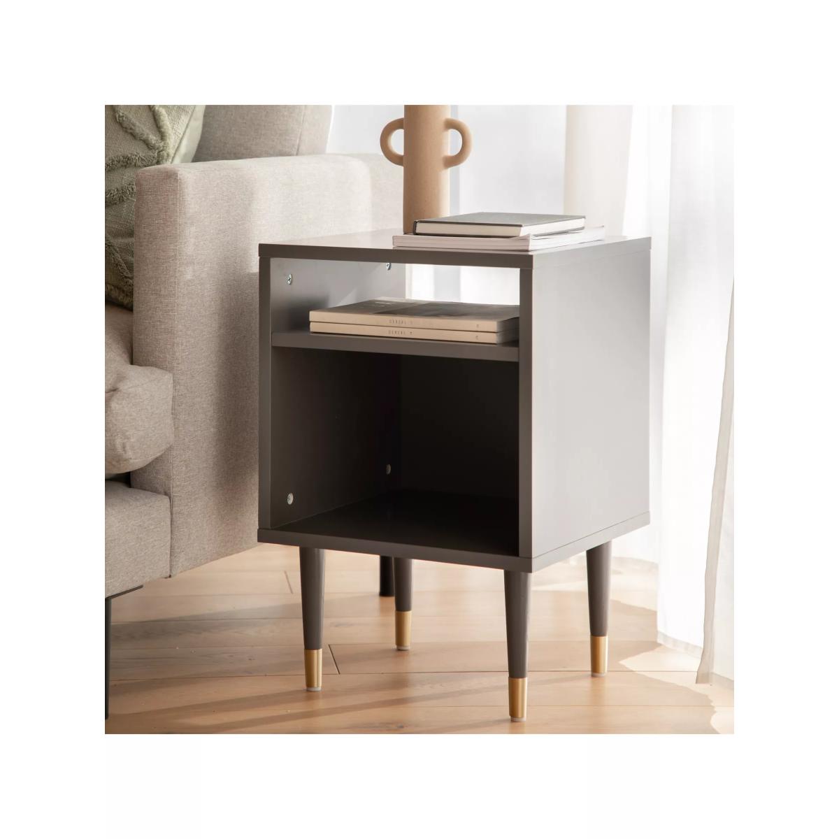 A practical side table for all your bits and bobs. Designed with an open shelf and lower storage section with a back panel, this table is made from robust timbers and it's available in a choice of painted finishes. Modern, with a hint of Art-Deco thanks to the brass tips on the tapered legs, it's supplied flat-packed but assembly is straightforward and all the tools you'll need are provided. Want to see it first? You may want to see and get a feel for the furniture in one of our shops before ordering. We'll be able to tell you where the range you'd like to view is on display.