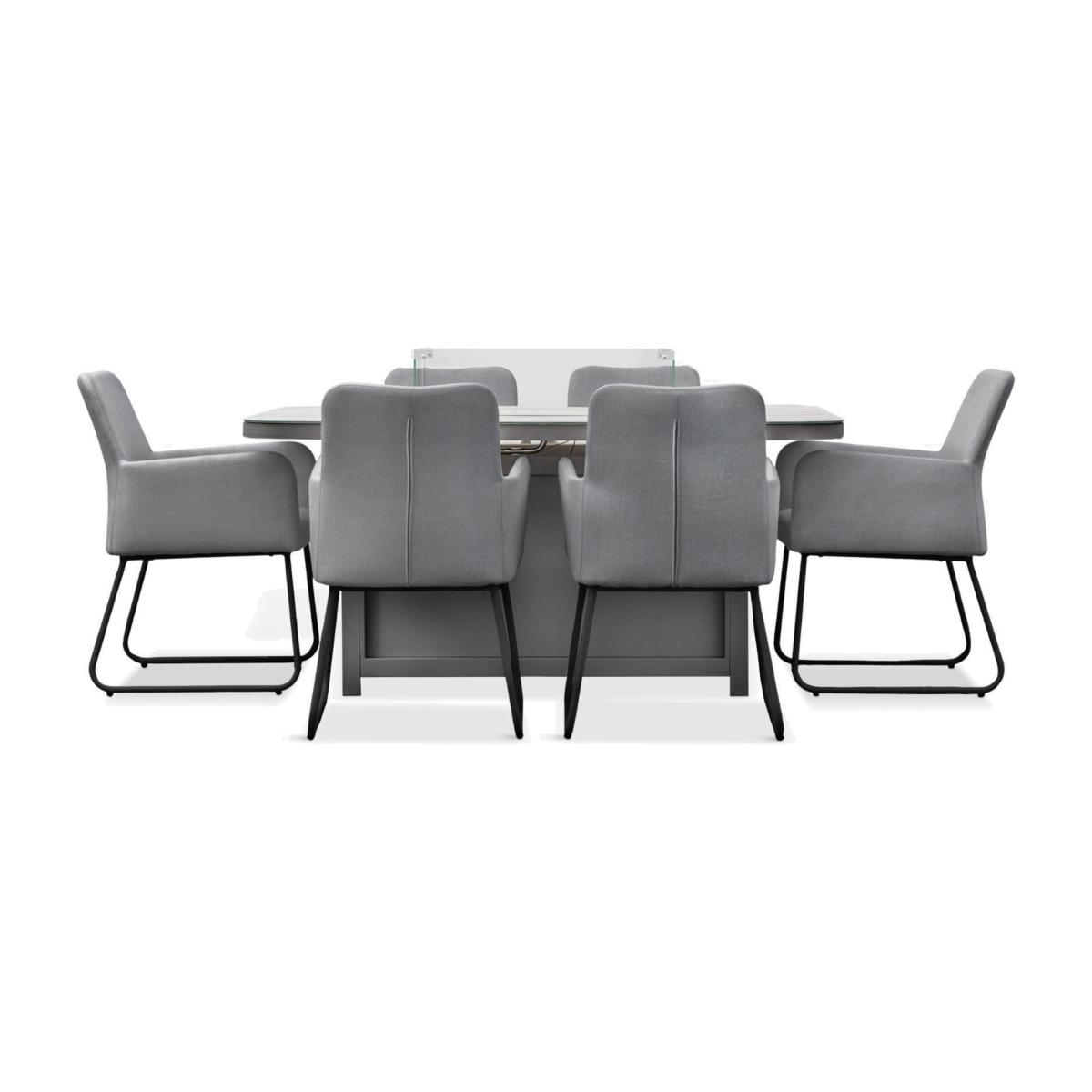 A stylish contemporary design, this six-seater Elba set from Gallery Direct features a rectangular table with a glass top and ceramic-effect finish and a bioethanol firepit to help keep you warm, so you can relax outdoors for longer. The central area underneath the table has a door on it, so it can be used for storage. The table and chairs all feature robust aluminium frames. The seats are fully upholstered in all-weather fabric, which is stain, mould and fade-resistant, and are padded with quick-drying foam for comfortable support. The set comes with covers for the seating, to help keep them clean.