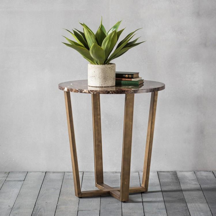 A contemporary round side table with a rich brown Spanish Emperor marble top featuring distinctive yet subtle natural brown and white tones in the grain and a brushed bronze angled metal base. This neo classical style will suit a multitude of interiors and can be used as a lounge or bedside table. *Moot Trading Ltd is not a lender and acts only as an introducer. The credit product is provided by Klarna Bank AB (publ). Credit is only available to permanent UK residents aged 18 and over, subject to status. Terms and conditions apply. Please note that the following products are not regulated by the FCA: Pay in 30 days and Pay in 3 instalments. Read More.