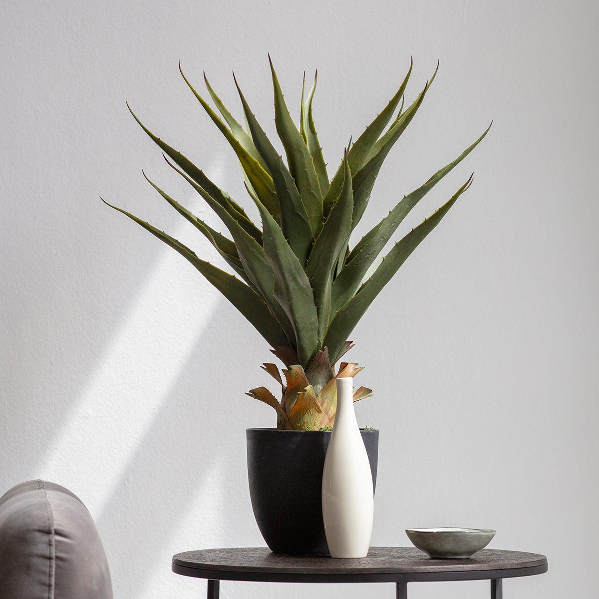 I love this faux maguey plant for its bold, architectural presence, making it an ideal statement piece in both contemporary and eclectic interiors. Its realistic texture and colour lend themselves well to urban homes, workspaces, or conservatories where natural greenery might be tricky to maintain. For styling, position it in a sleek, modern planter like the black pot pictured to emphasise its sculptural form. It works particularly well on side tables, shelves, or alongside other monochrome or natural décor, bringing a touch of desert-inspired minimalism without the upkeep of real plants. Practical tip: pair it with neutral or textured accessories to create a cohesive, stylish vignette.