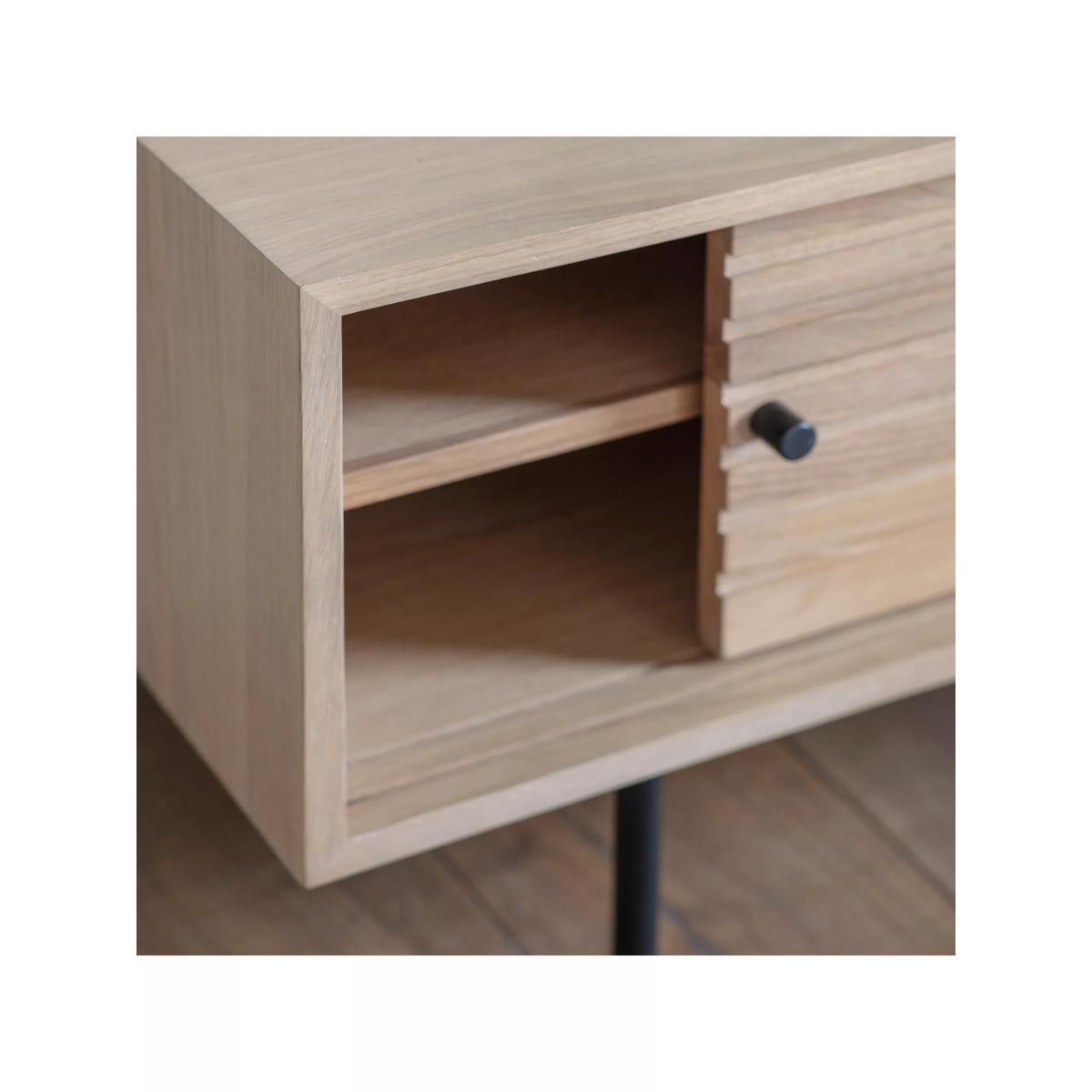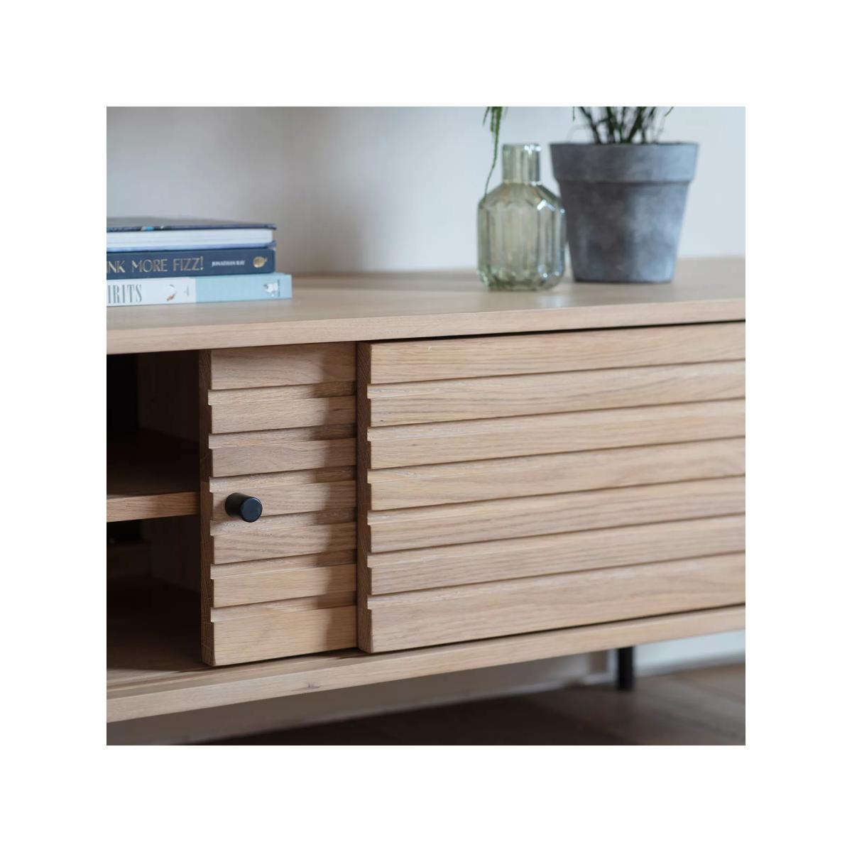 This TV stand celebrates the calming fusion of Japanese and Scandi style, shown through its use of natural materials and minimalist design. Perfect for creating a considered yet contemporary look in your living room, it's made from solid oak with slatted detail on the sliding doors and there's a useful amount of storage space for media consoles. Slim, black metal legs add a contrast design detail, with matching handles to complete the look. Want to see it first? You may want to see and get a feel for the furniture in one of our shops before ordering. We'll be able to tell you where the range you'd like to view is on display.