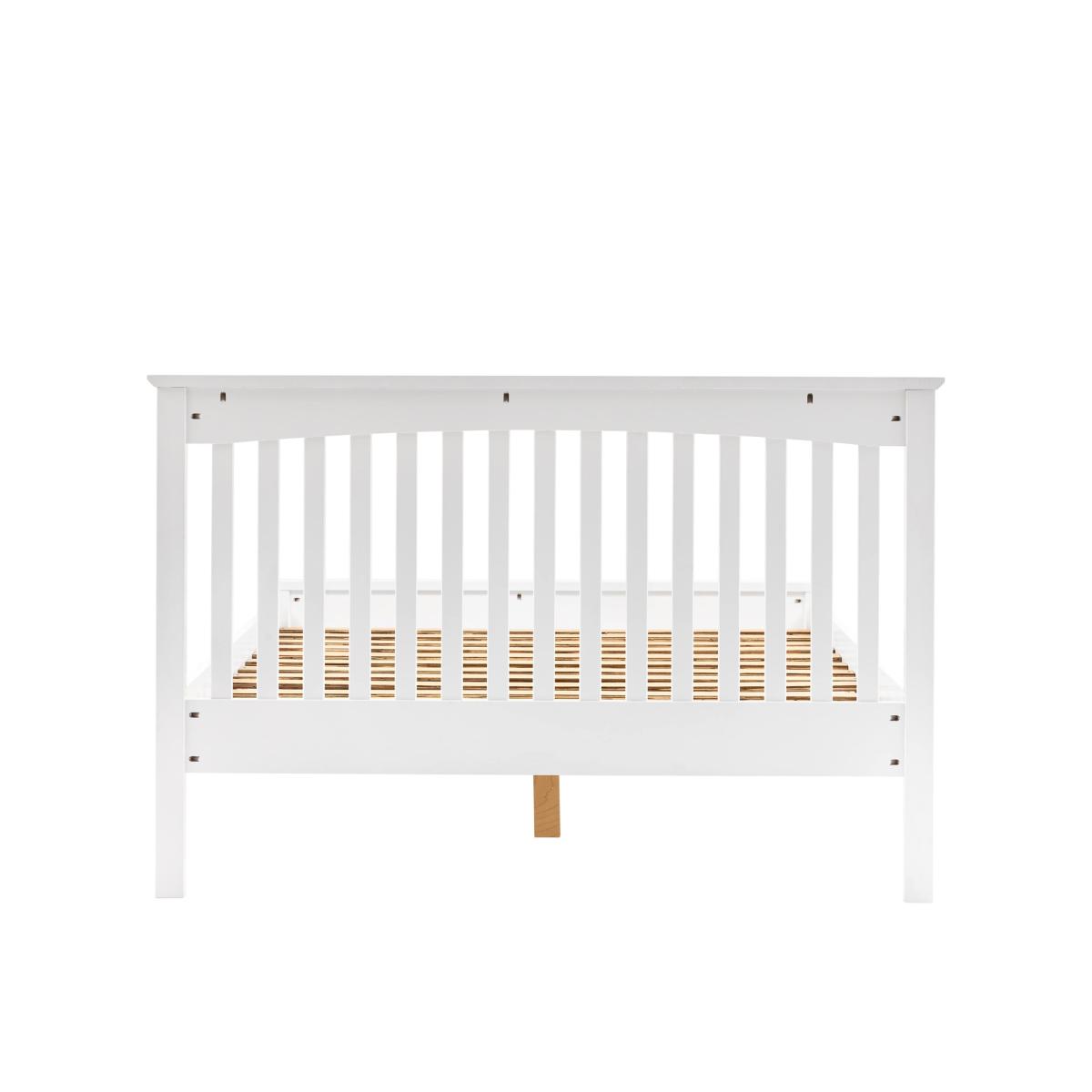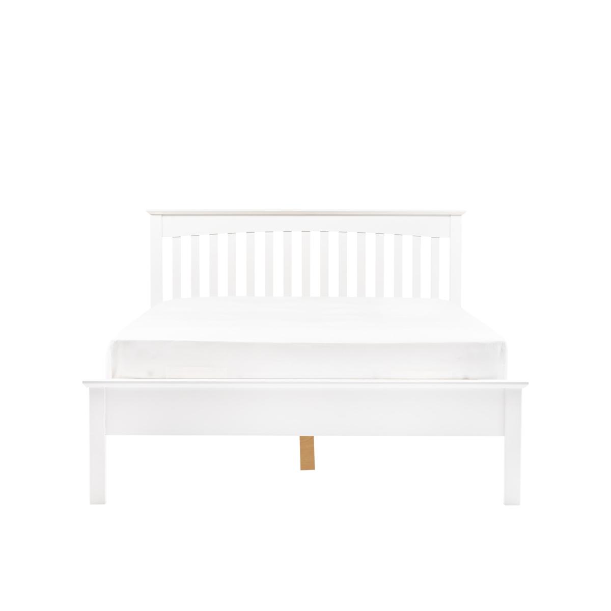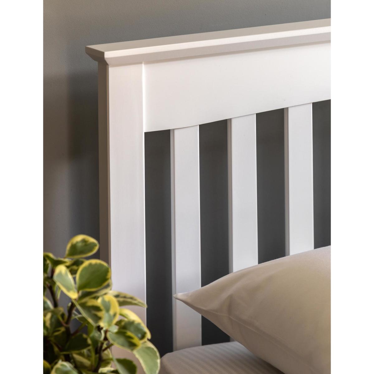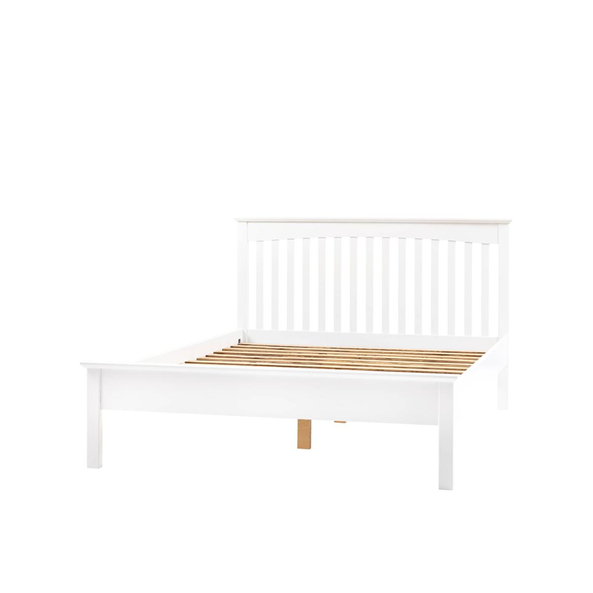 With its simple, elegant design, this bed from the Hastings collection is perfect for any room. Made from pine wood with a painted finish, the low profile helps create a spacious feeling in the bedroom while still providing some room under the bed. The slatted headboard brings a classic look. Mattress is not included with the bed frame. Includes 1 Year Guarantee