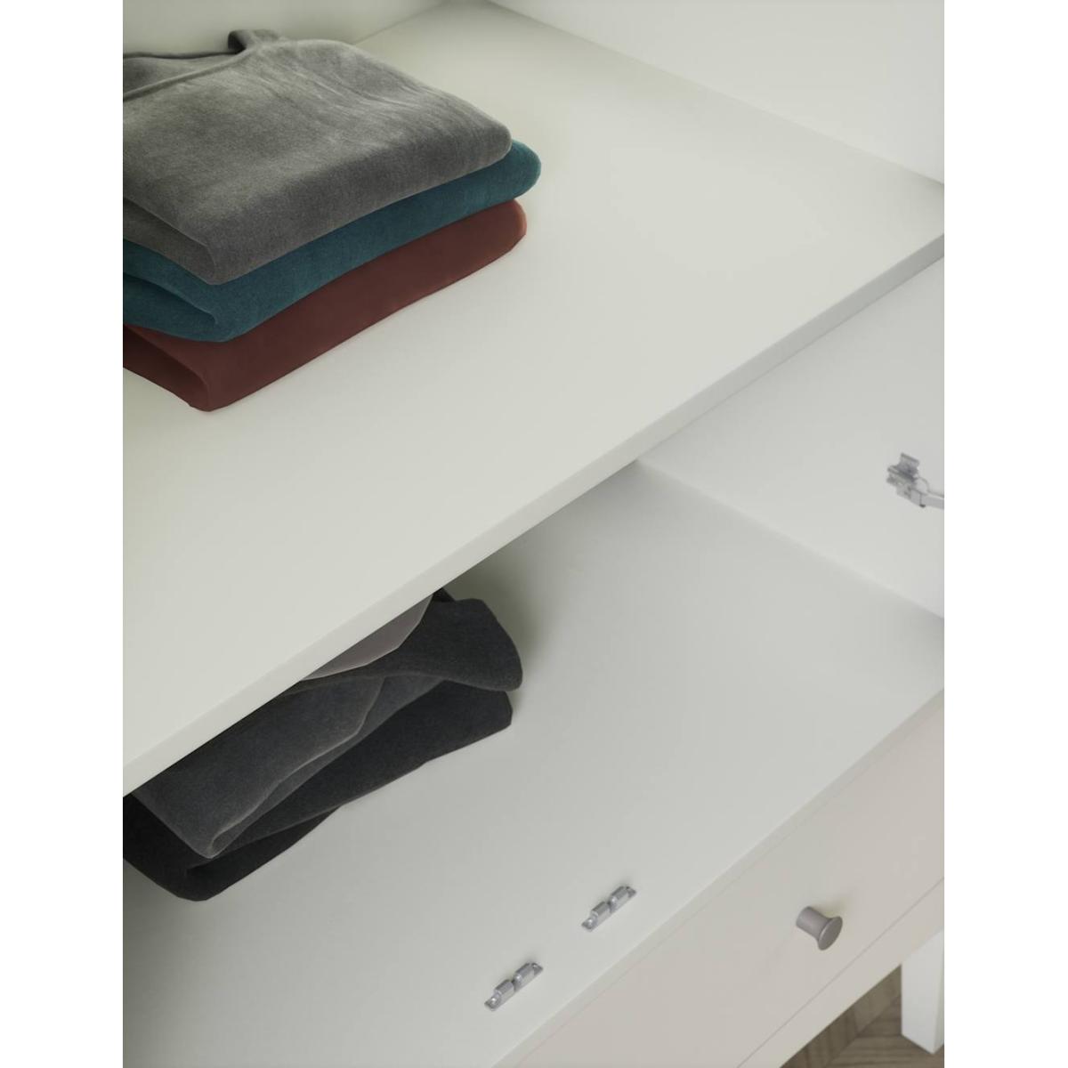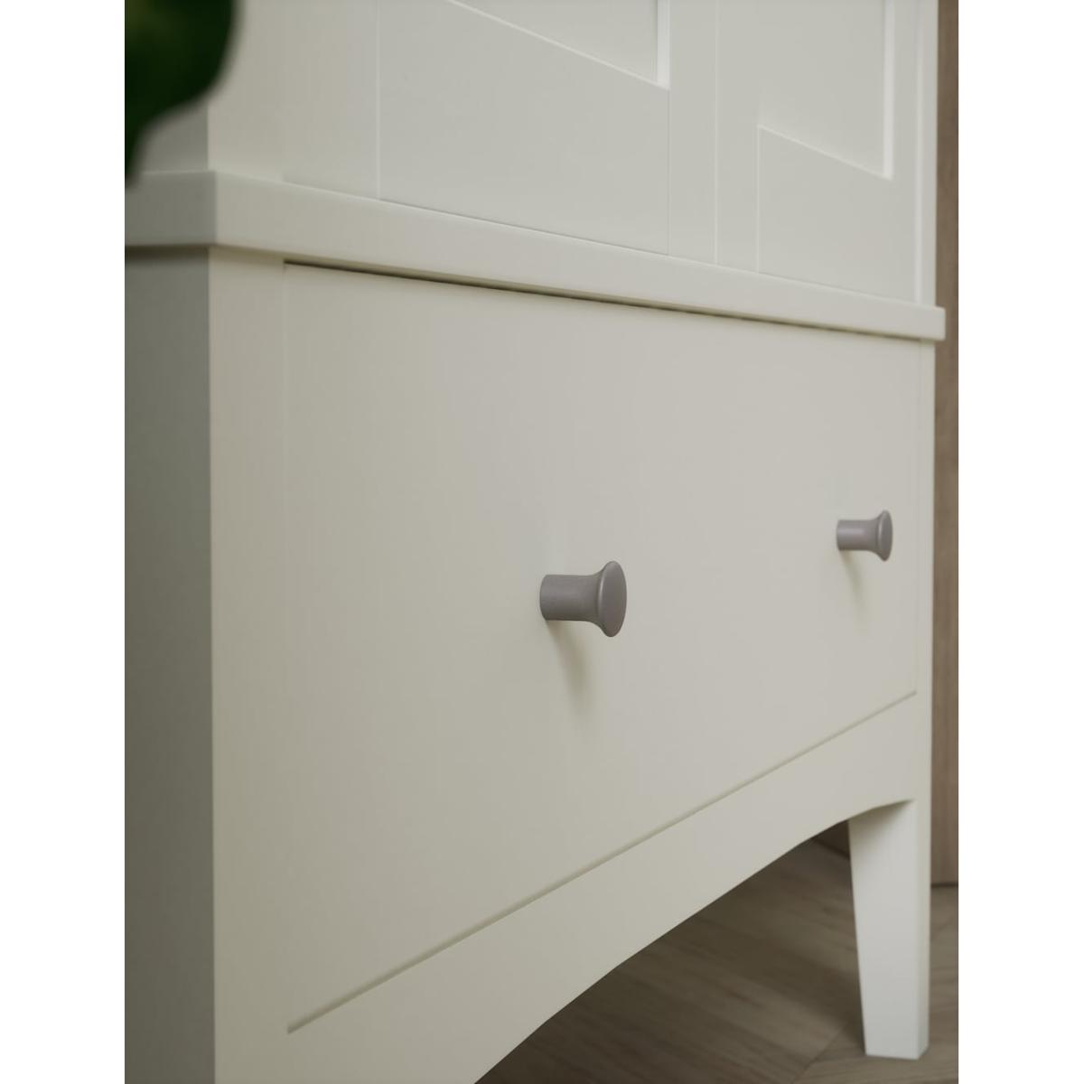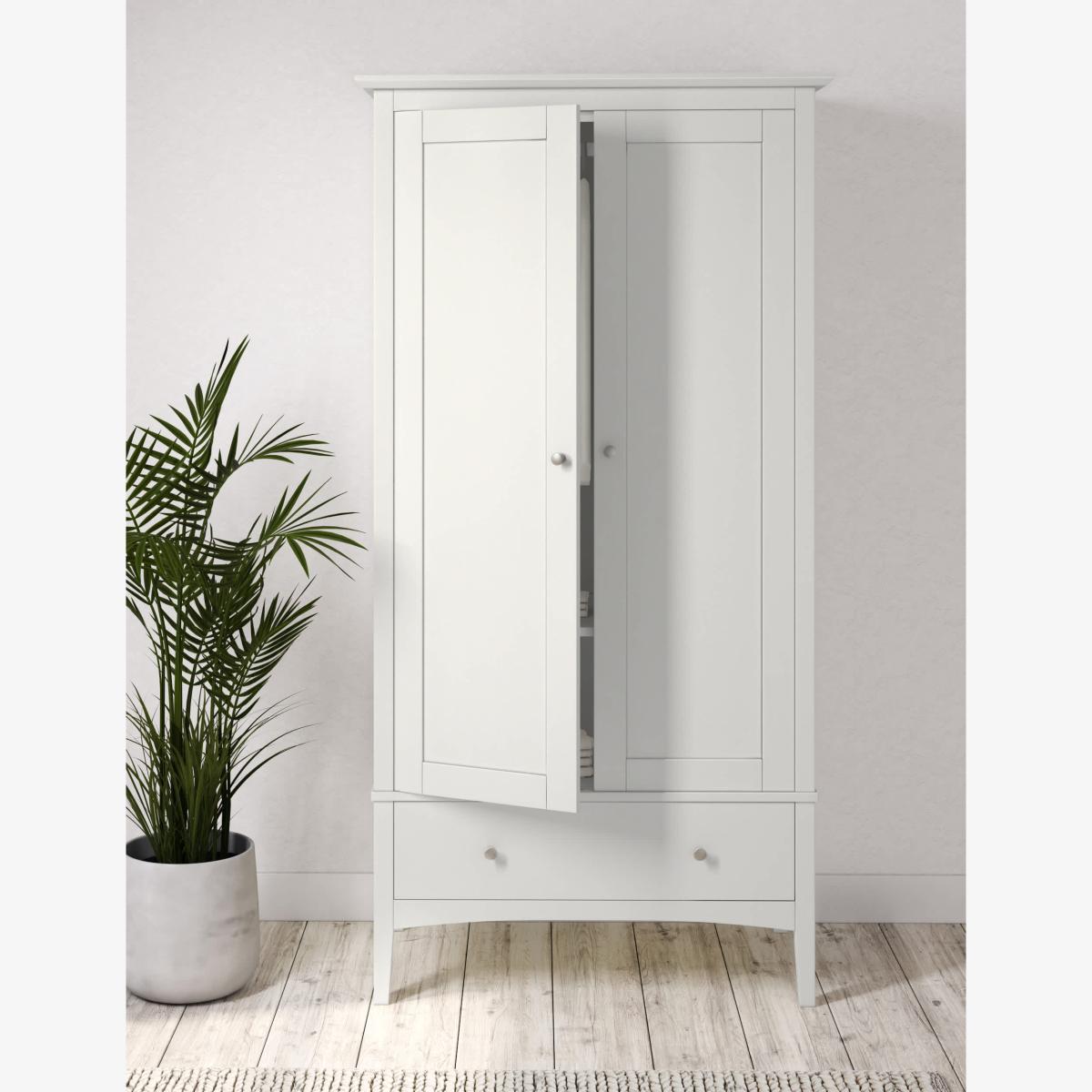 I’m a fan of the Hastings wardrobe in soft white for its clean lines and versatile finish. It suits coastal, Scandi or shabby-chic bedrooms equally well, adding a light, airy feel without overwhelming smaller spaces. For practical styling, use uniform woven baskets on the top shelf to keep bits organised, hang matching wooden or brass hangers to echo the knob detail, and fold jumpers or linens in the drawer below. A tall plant or slim mirror alongside will balance its height and keep the room feeling fresh.