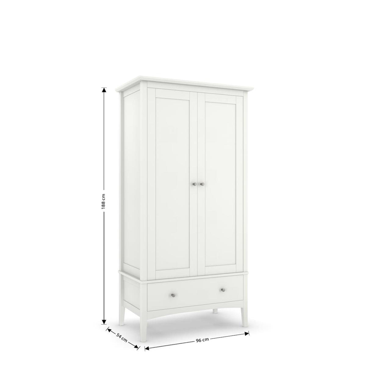 Part of our Hastings collection, this two door double wardrobe looks good on the outside and inside. Providing ample space for you to neatly store your clothes, with a full-width clothing rail in the hanging space plus an adjustable shelf and a large spacious drawer underneath. Expertly constructed from wood, this double wardrobe also features panel detailing on the doors, contrasting door knobs, and stylish cornices, all of which combine to add a touch of style. Includes 1 Year Guarantee
