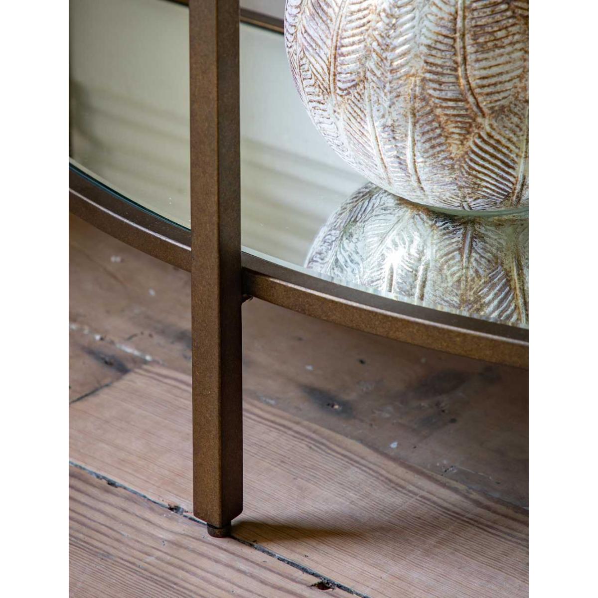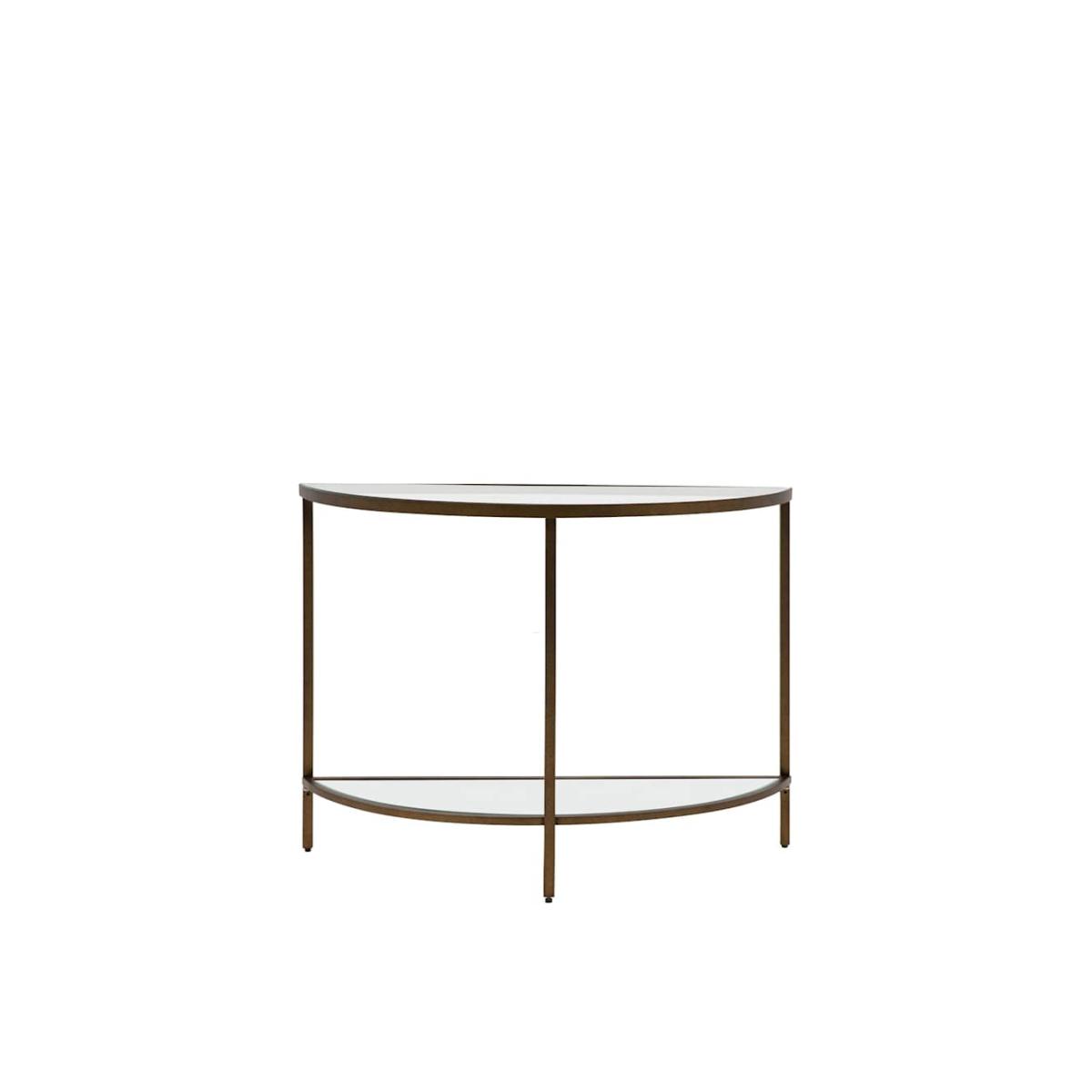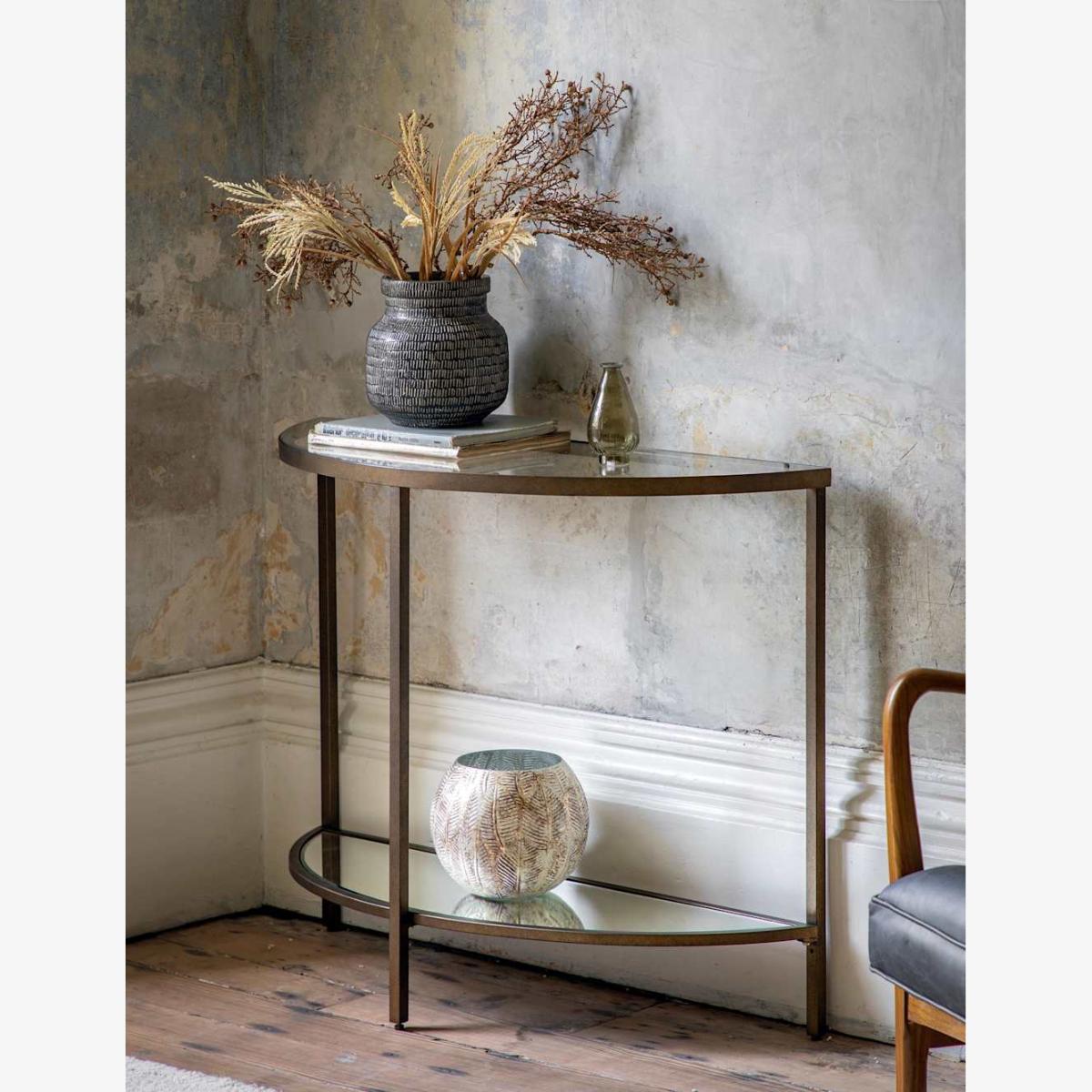 This console table from Gallery Direct will add extra elegance to your home. It's crafted with a vintage-style bronze-tone metal frame, a tempered glass top and a mirrored glass bottom shelf. Thanks to its space-saving semicircular shape, it fits easily against walls in narrow spaces.1 year warranty