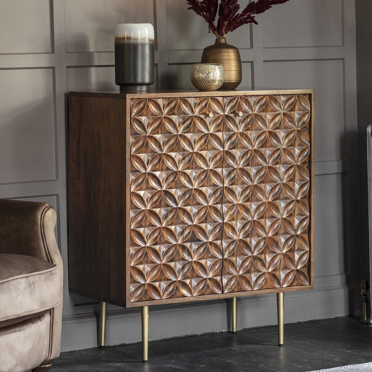 I love the Kerala cabinet for its striking, textured front that adds depth and visual interest without overwhelming a space. It's versatile enough to sit well in both contemporary and eclectic interiors, working particularly well in living rooms or dining areas as a statement piece. Practical styling tips include pairing it with minimalist accessories to highlight its design, or layering with metallics and ceramics to create a curated look. Its compact size and sleek legs make it a great option for smaller spaces, offering both form and function as a stylish drinks cabinet or storage piece.