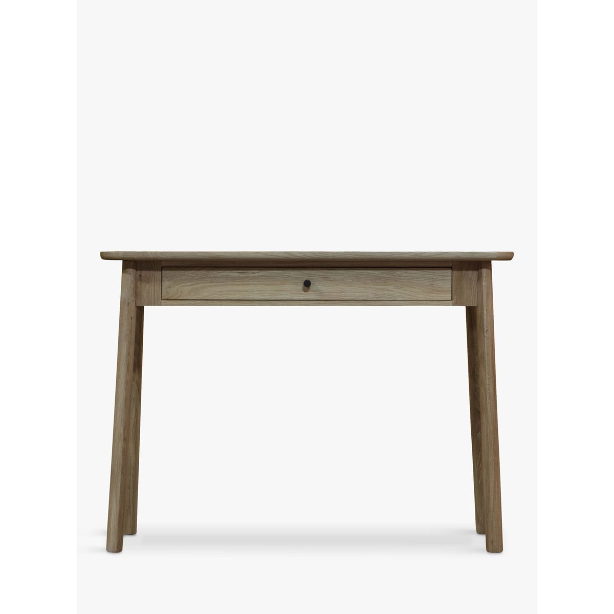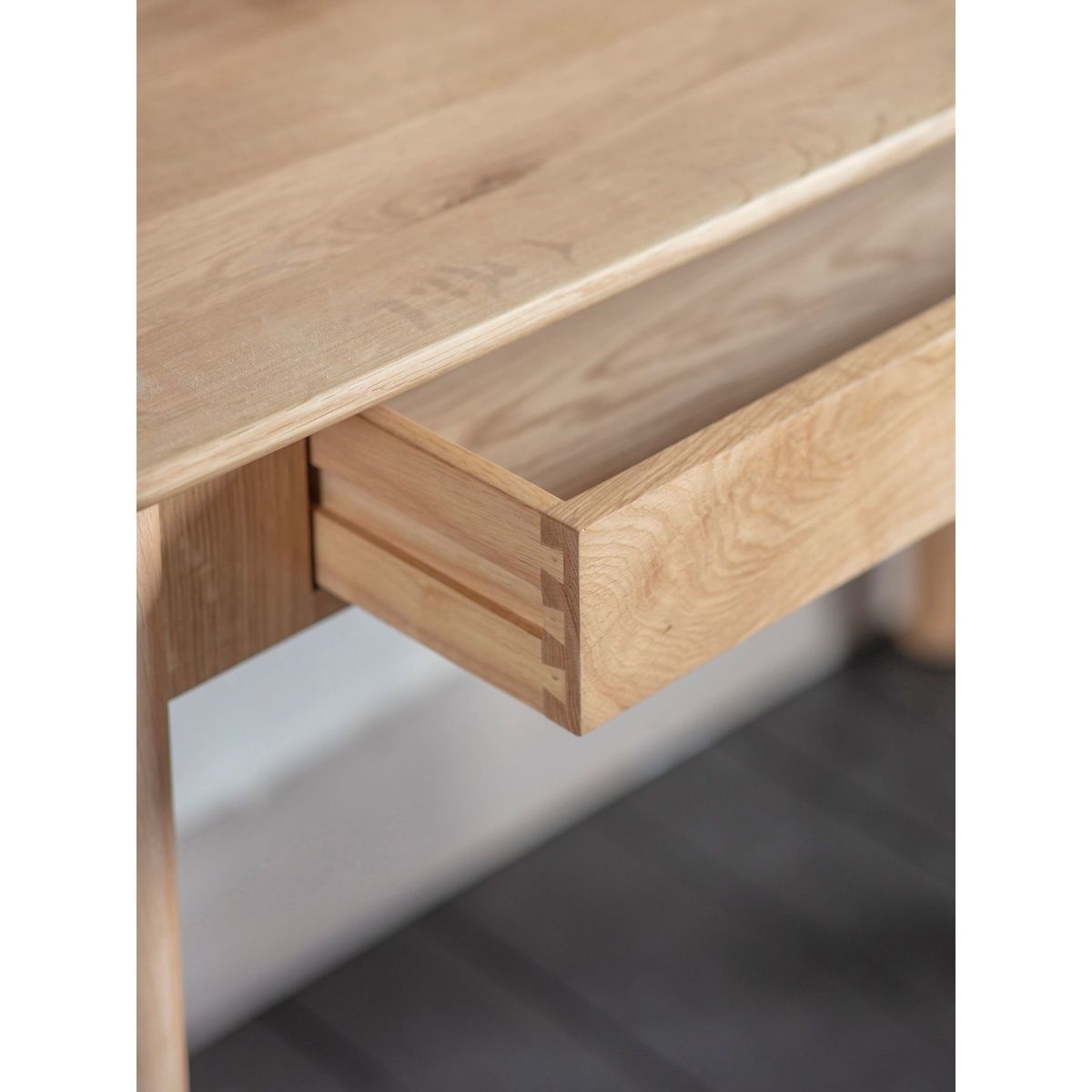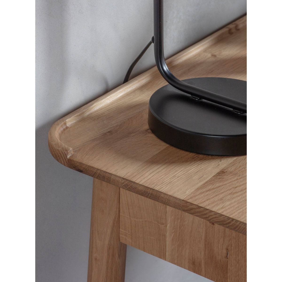This console table captures the style of Scandi-minimalism with a design that's well-suited in both modern and rustic-inspired interiors. It's made from solid European oak in a natural dry sheen finish that highlights the wood grain and it's built with dovetail joints for durability. The depth of the table makes it ideal for smaller spaces or hallways and its curved surface top has a slightly raised edge that lends a practical and softer design detail. Doubles up as a desk The robust build of this table means you can also use it as a desk. The drawer is useful for paperwork and other essentials. Want to see it first? You may want to see and get a feel for the furniture in one of our shops before ordering. We'll be able to tell you where the range you'd like to view is on display.