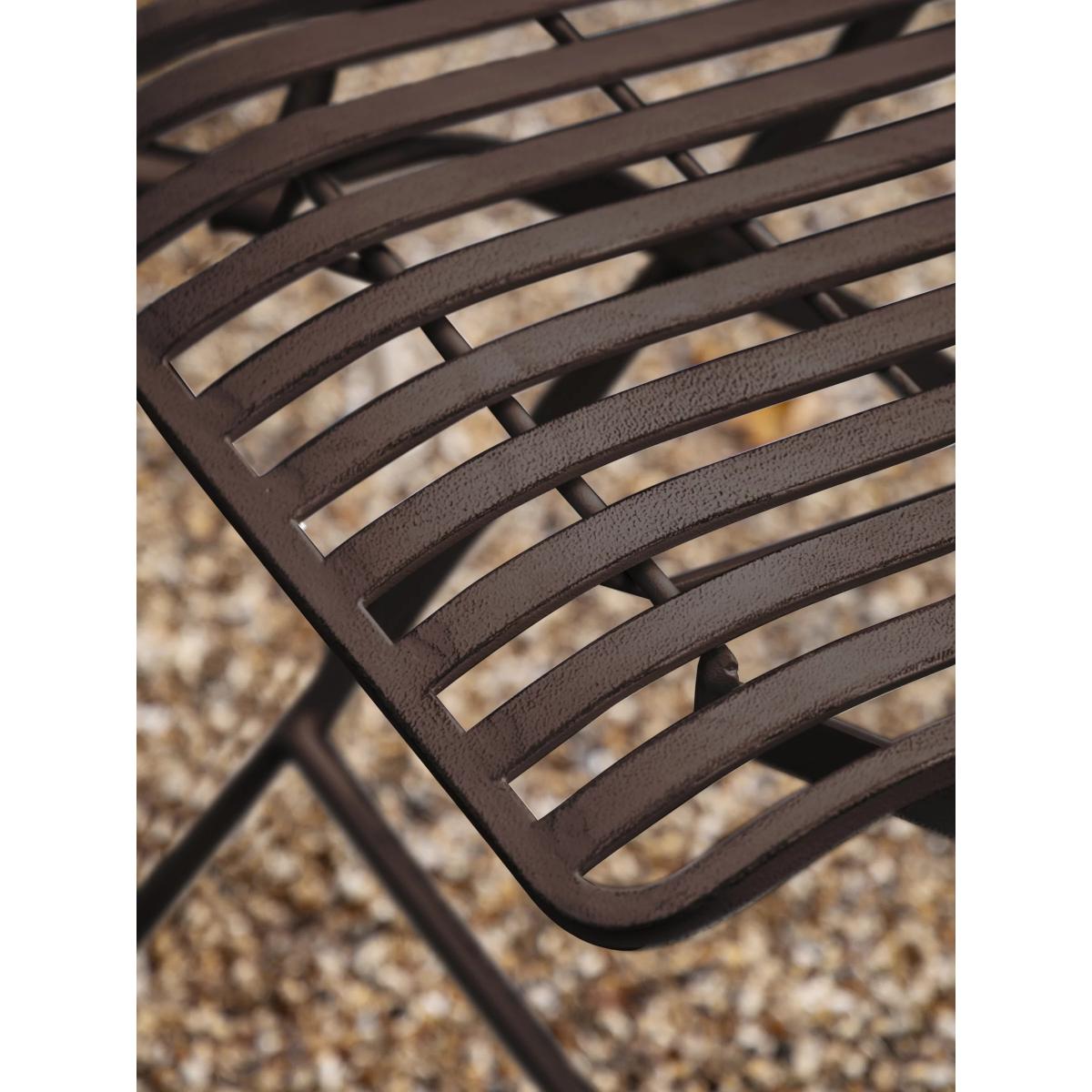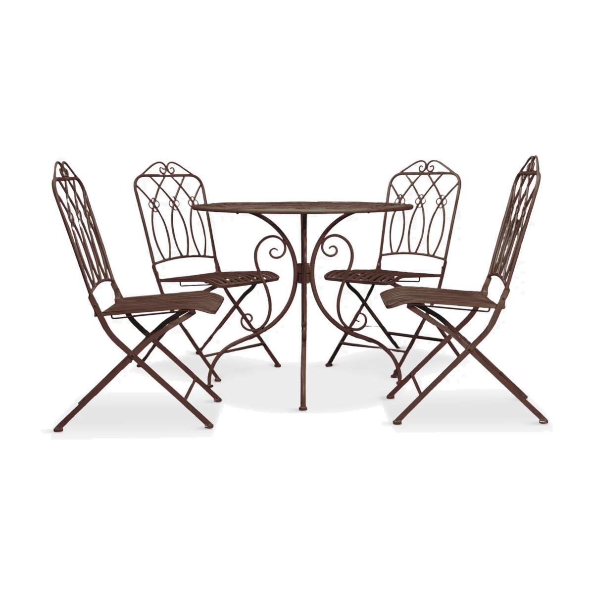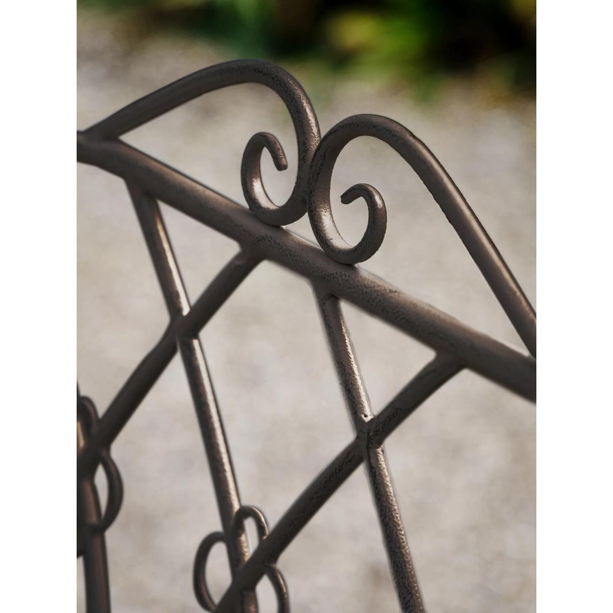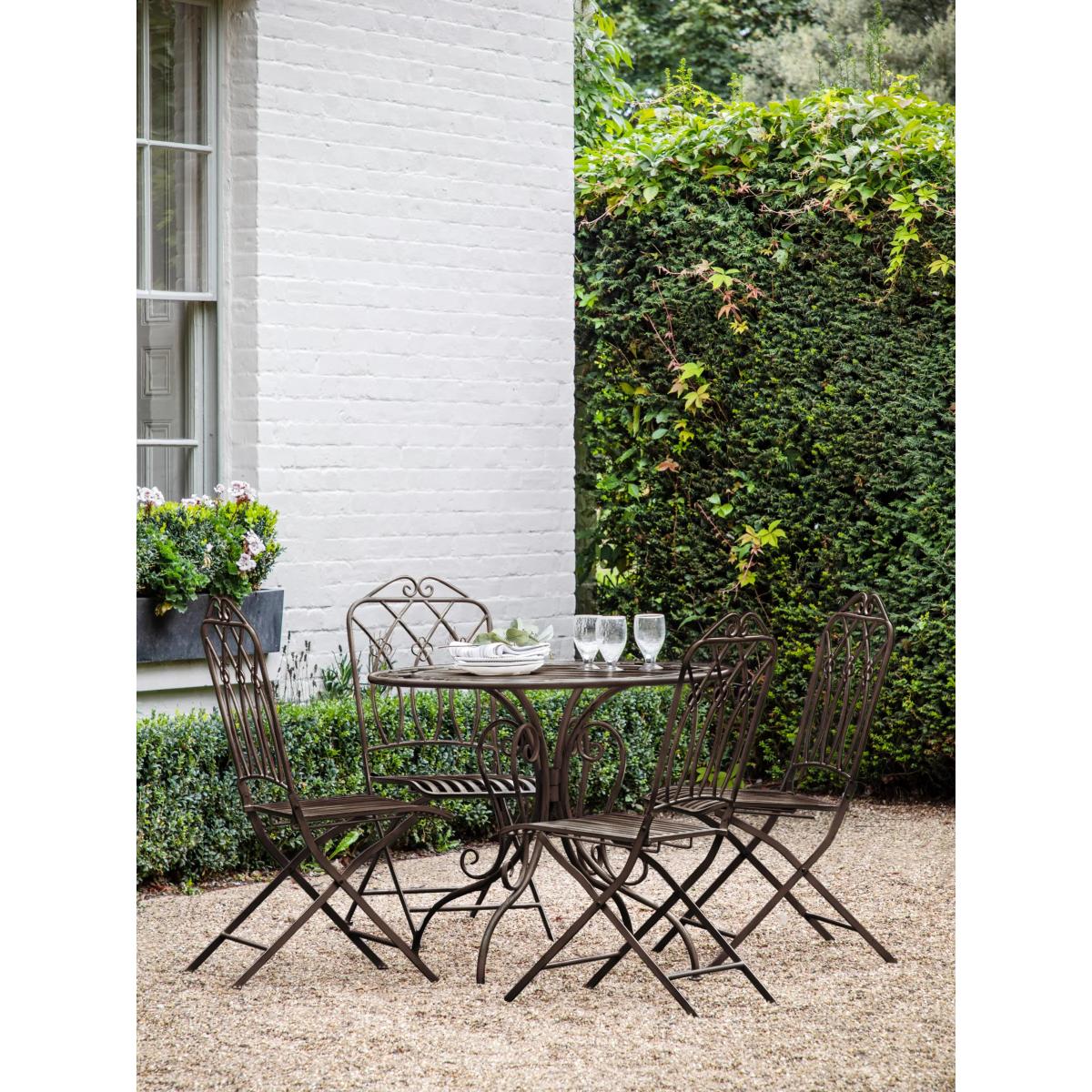 A pavement café-style round table and chairs set seating up to four people in the garden. This Mally set from Gallery Direct features a flowing design crafted from intricate ironwork. It's available in a distressed soft white finish or a dark metal patina finish.