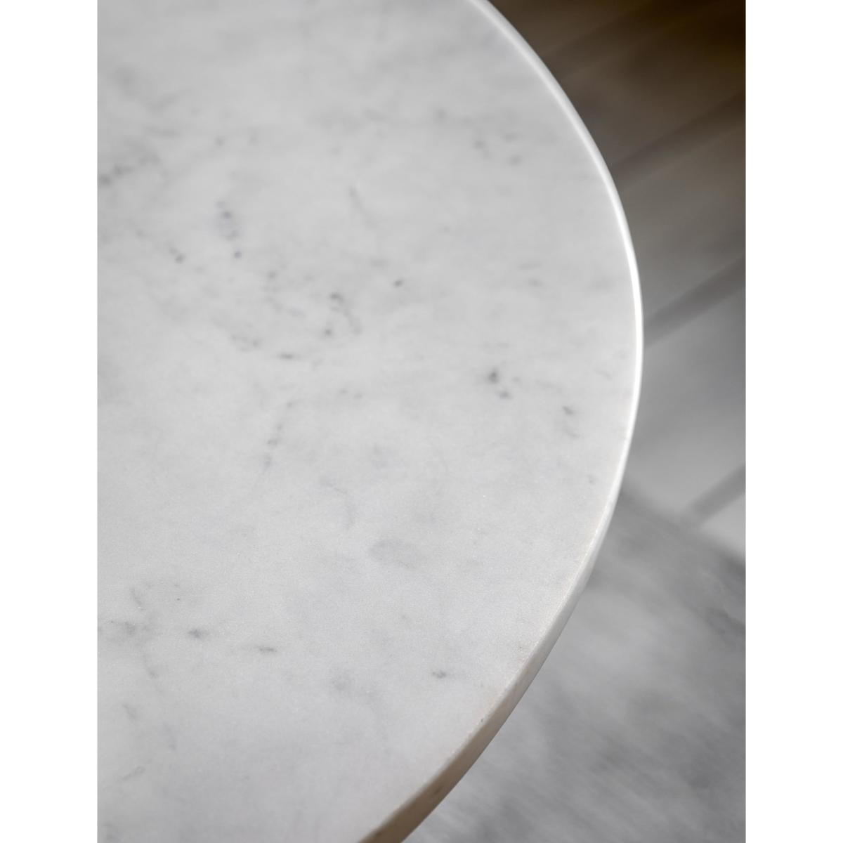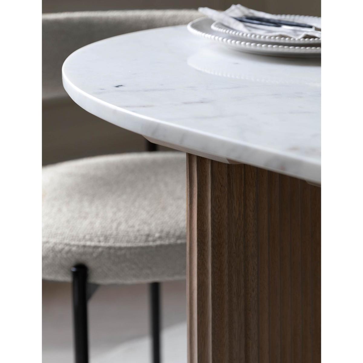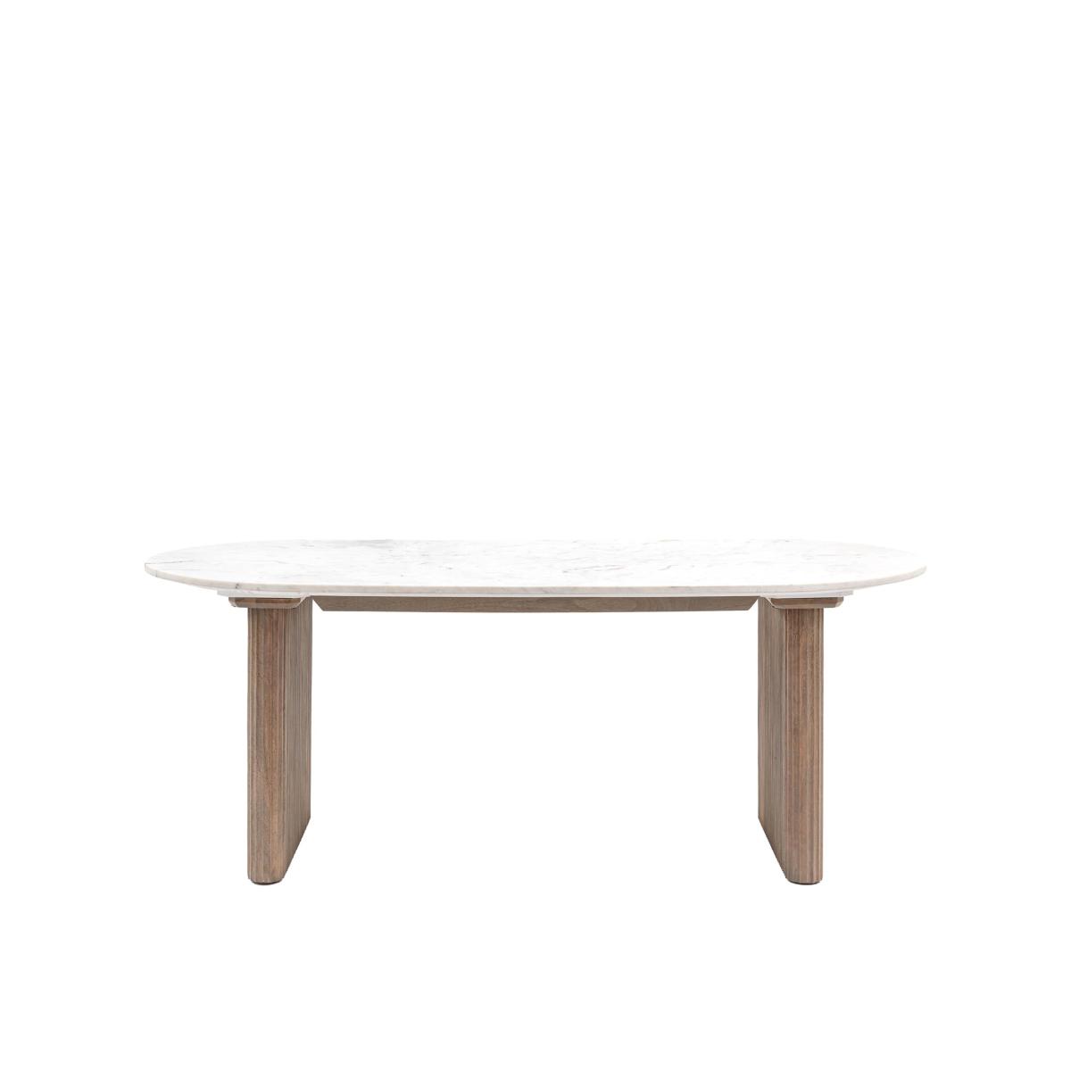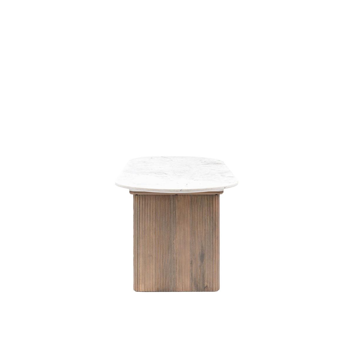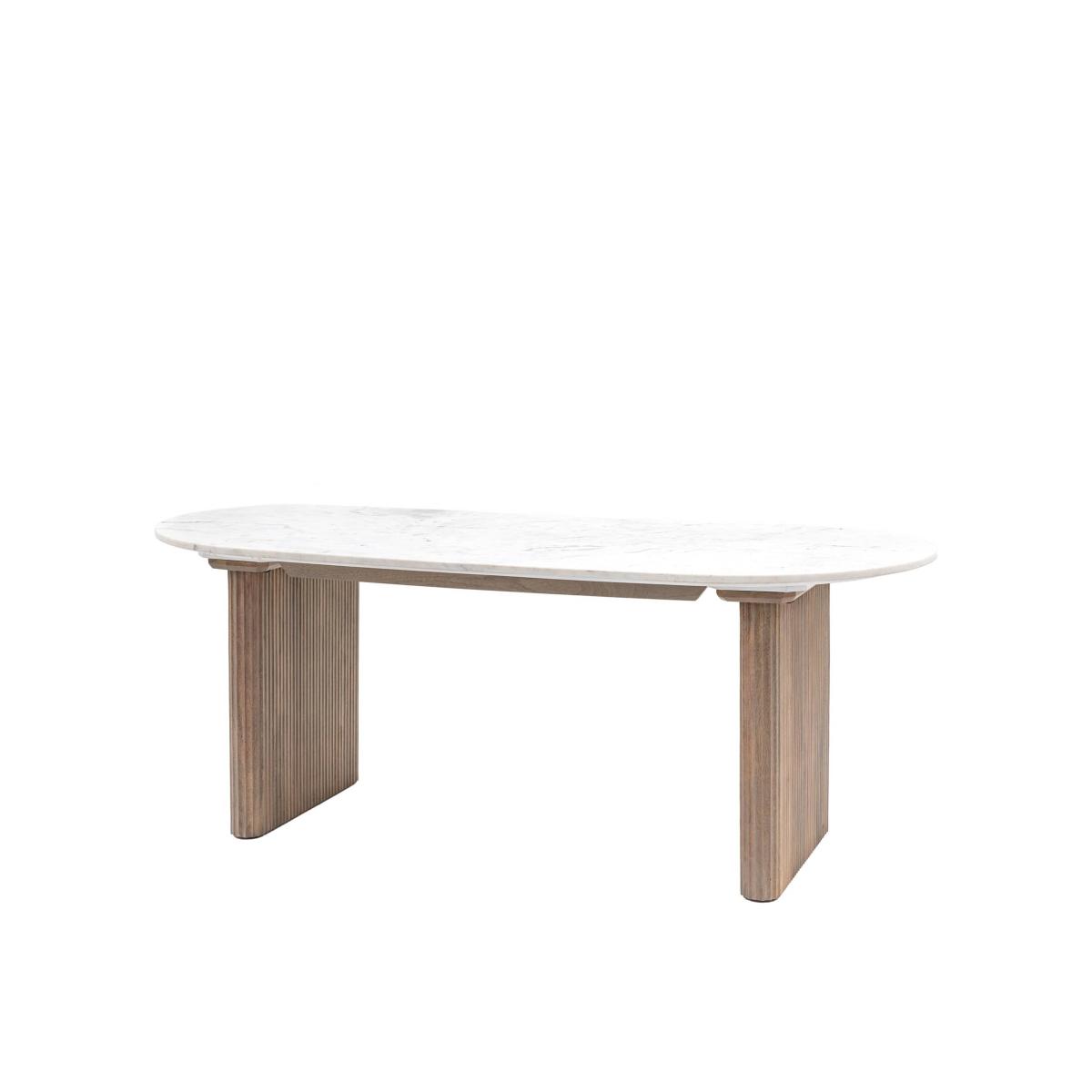 Welcome a touch of refined elegance to your home with Gallery Direct's Marmo dining table. A polished Indian Carrera marble top, marked with distinctive grey-blue veins, rests upon solid mango wood legs. These legs feature a striking vertical ribbed detail.1 year warranty