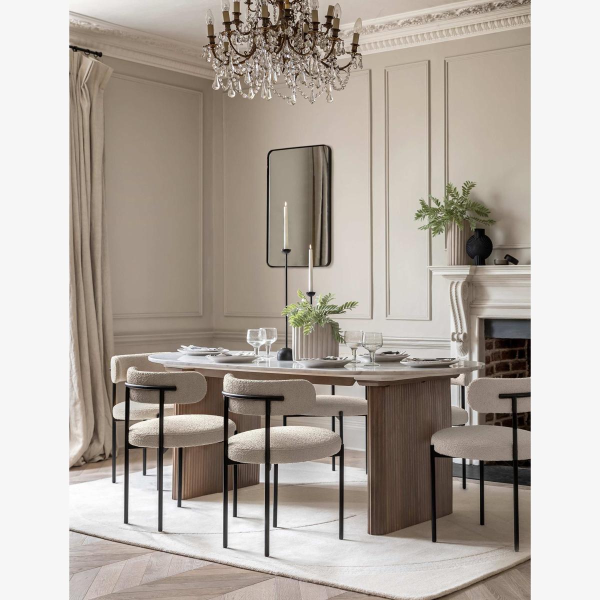 I love this marble-inspired table for its sleek, versatile look that adds a touch of sophistication to both contemporary and classic interiors. It’s an excellent choice for smaller dining spaces or open-plan kitchens, thanks to its understated elegance and neutral grey tone that pairs well with a variety of colour schemes. To style it effectively, consider contrasting textured or coloured chairs to break up the grey and add visual interest. Incorporating greenery or statement tableware can also elevate the look, making it perfect for both everyday dining and more formal occasions. Its modern yet timeless appeal makes it a reliable focal point that will suit a wide range of interior styles.