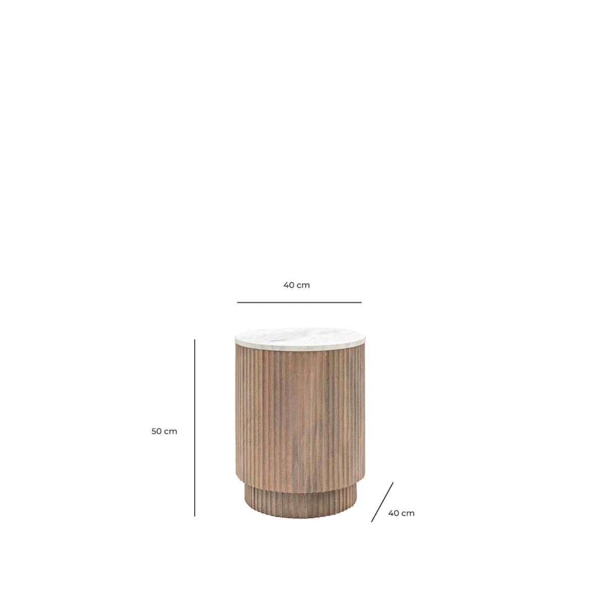 Introduce a tactile element to your space with the beautiful textures of Gallery Direct's Marmo side table. Solid mango wood forms the striking ribbed drum base. A polished Indian white marble top rests above, displaying classic grey-blue veins that contrast with the rich wood.
