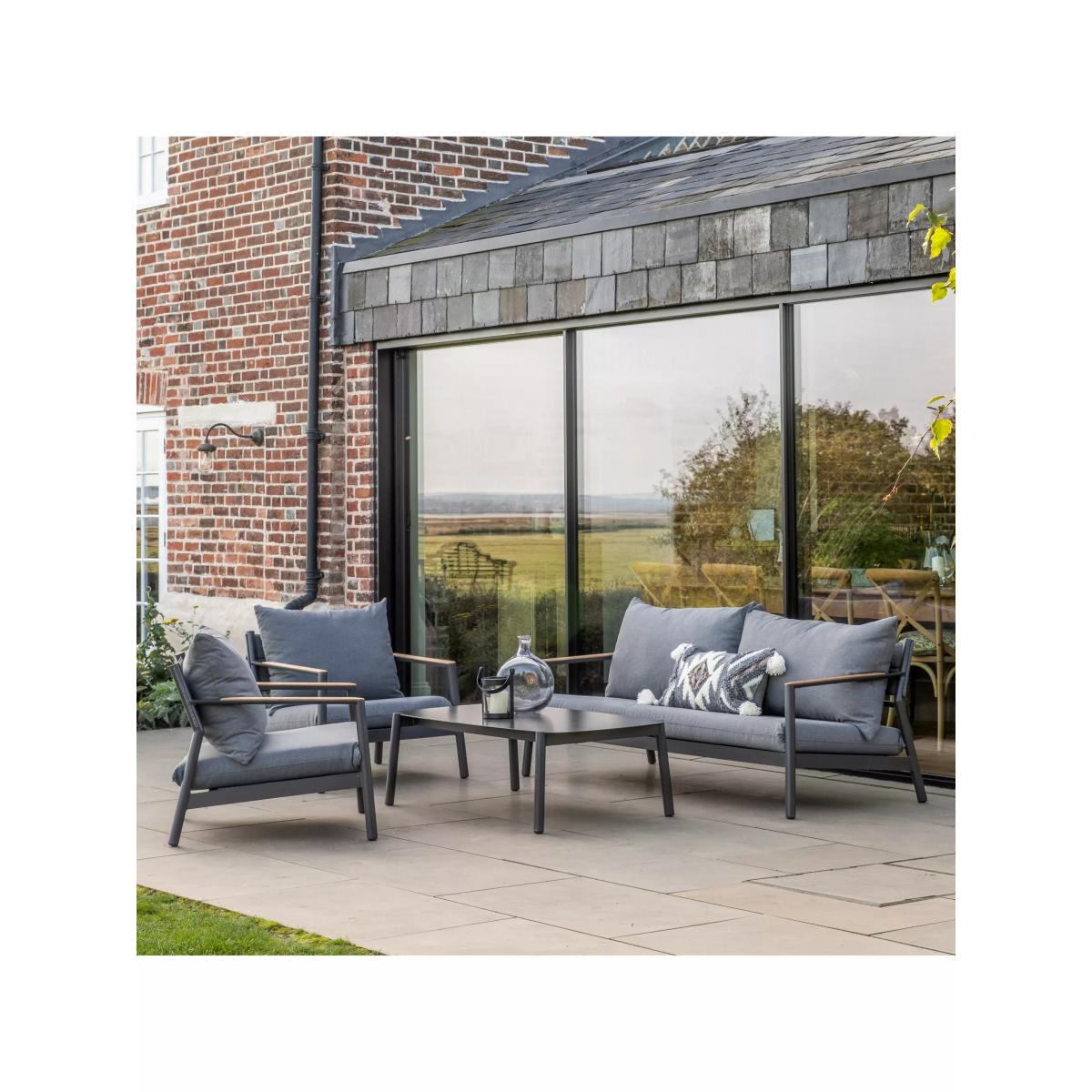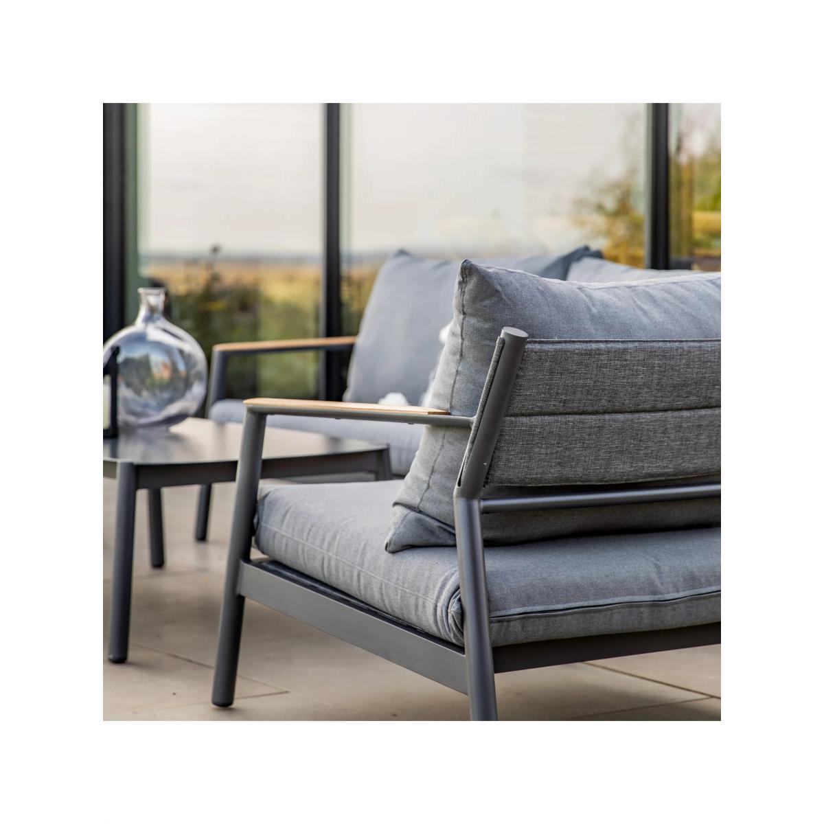 A contemporary design, this Mellini garden lounging set from Gallery Direct features two armchairs, a two-seater sofa and a rectangular glass-topped coffee table. The seat frames and the table are made from all-weather powder-coated aluminium with solid teak wood on the arms of the seats to add a stylish design feature. The seating is low to the ground at 25cm high, creating a comfortable lounging set. Luxurious showerproof seating and backrest cushions add to the comfort.