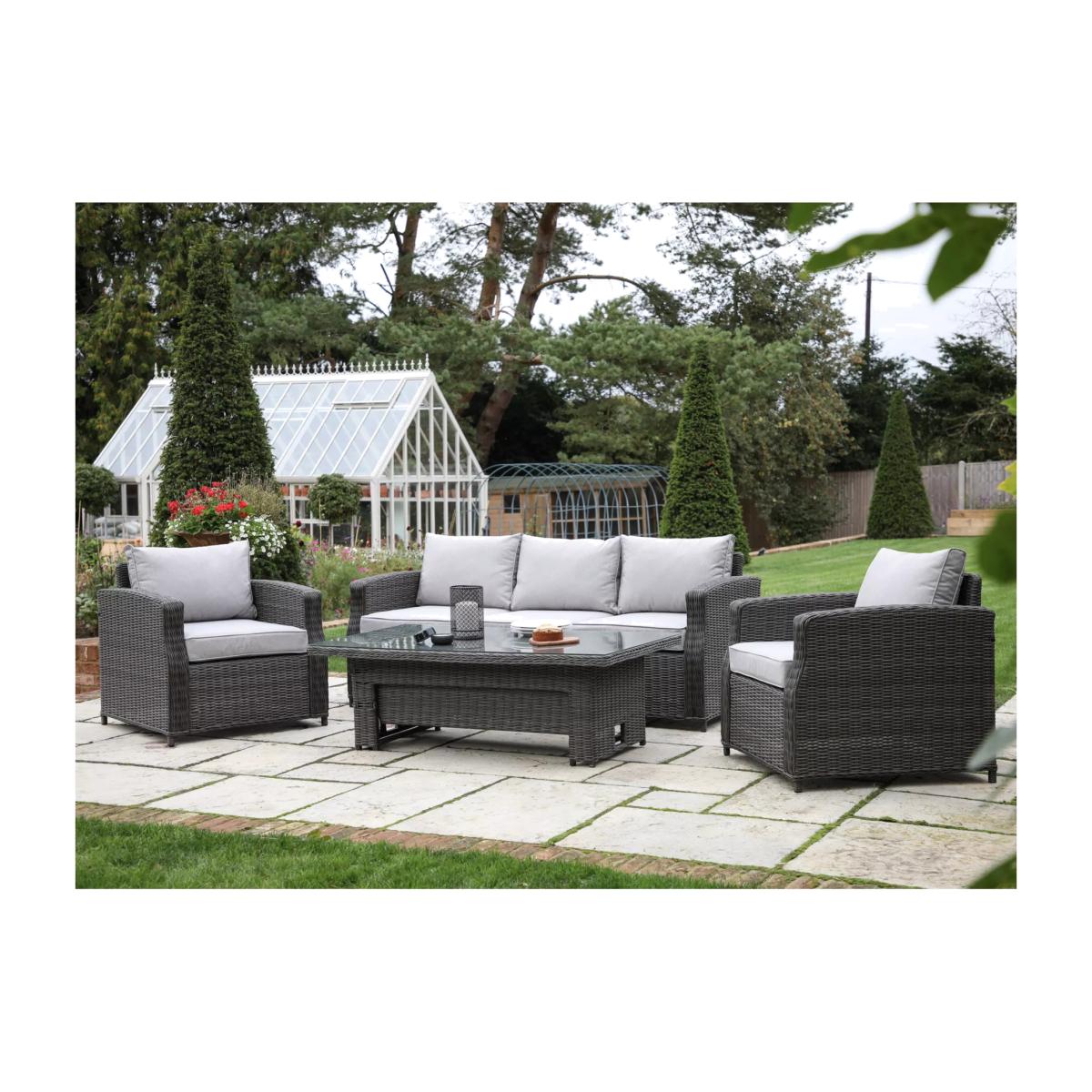 A versatile garden furniture design for eating and relaxing, this Milson five-seater dining set can be used as a lounge set by easily adjusting the height of the dining table and lowering it to a coffee table height. The set includes the riser table with a top made of tempered glass for strength, a three-seater sofa and a pair of armchairs. All pieces are crafted from all-weather 5mm synthetic rattan with a hand-woven mixed half-round/full-round weave. For comfort, the sofa and chairs have luxurious showerproof cushions complementing the colour of the rattan. The frames are made of weather-resistant powder-coated aluminium. Seat height: 46.5cm Want to see it first? You may want to see and get a feel for the product in one of our shops before ordering. We'll be able to tell you where the range you'd like to view is on display.