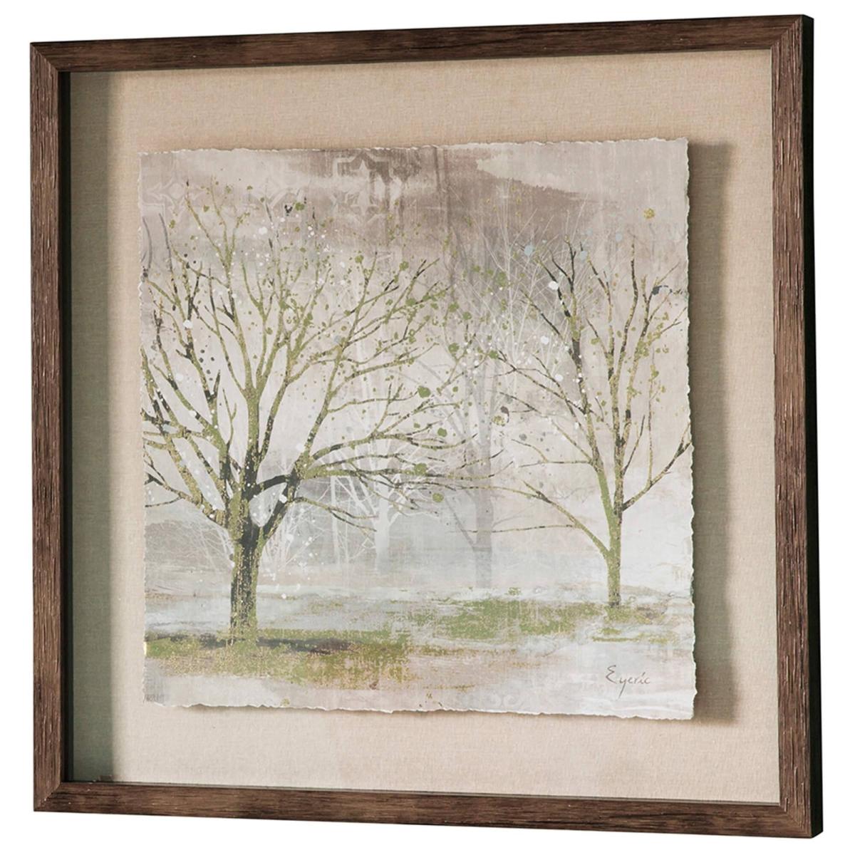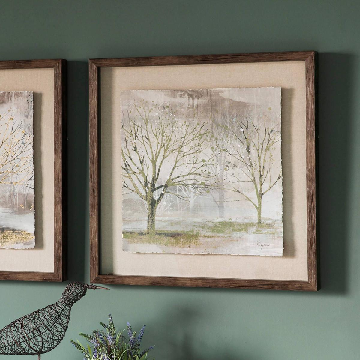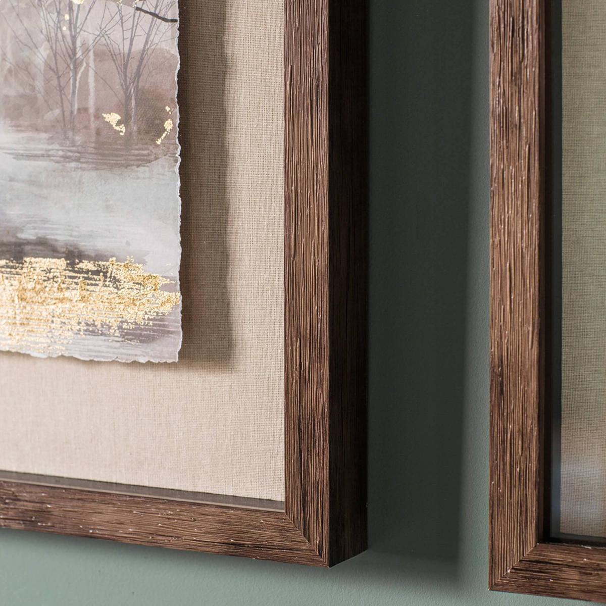 Traditional piece of wall art boasting a woodland design. A stunning piece of wall art which features an open grain effect wood frame, of which encases a delicate, woodland print. The tree print boasts gold foil highlights and is float mounted on a linen background which is natural in colour. It is ideal for homes boasting traditional home decor and is perfect for use in lounges, hallways, kitchens and dining rooms.