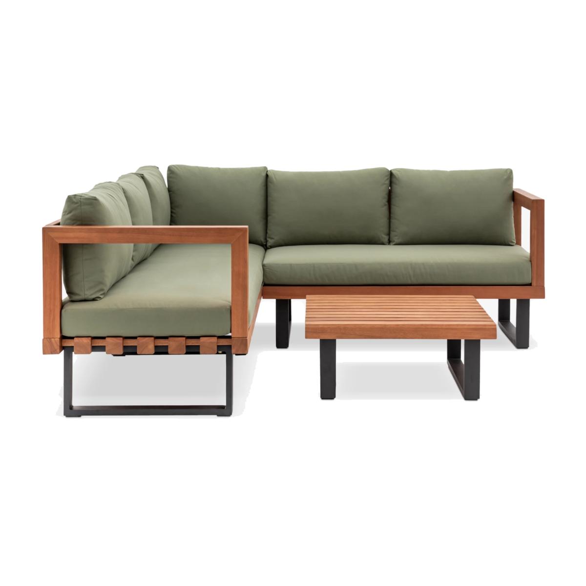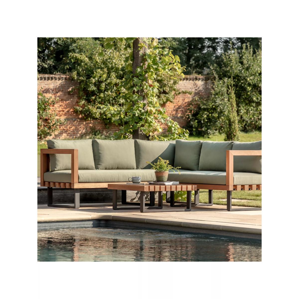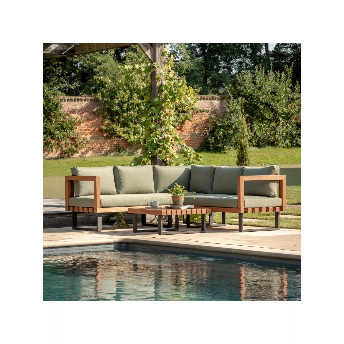 A modern corner sofa set from Gallery Direct with bold chunky lines and simple shapes, seating up to five people outdoors. Designed with a slatted eucalyptus wood square coffee table. The frames are made from eucalyptus wood with an oiled finish and robust powder-coated metal legs. Completed with green shower-resistant seat and backrest cushions.