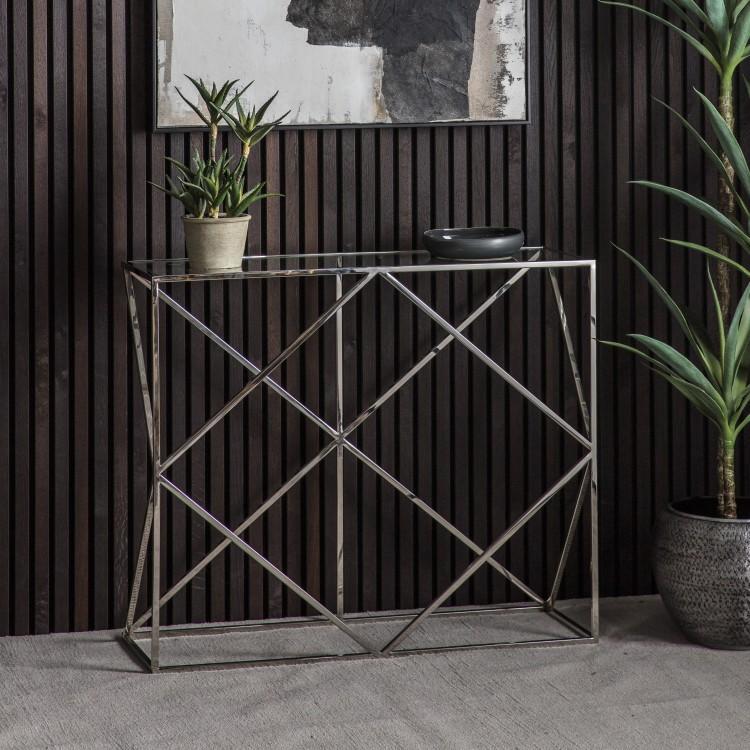 This beautiful, delicate-looking console table would look perfect in any hallway or living space when surrounded by modern or contemporary furnishings. Or place it alone for that minimalist look. This silver table has a solid glass top that is supported by an intricate criss-cross pattern made from silver metal and is finished with a silver rectangular base. The silver metal will add a touch of sophistication to your home. This is the perfect place to store your essentials such as your wallet, phone or keys or add the perfect ambience by placing a silver table lamp on top of it. *Moot Trading Ltd is not a lender and acts only as an introducer. The credit product is provided by Klarna Bank AB (publ). Credit is only available to permanent UK residents aged 18 and over, subject to status. Terms and conditions apply. Please note that the following products are not regulated by the FCA: Pay in 30 days and Pay in 3 instalments. Read More.