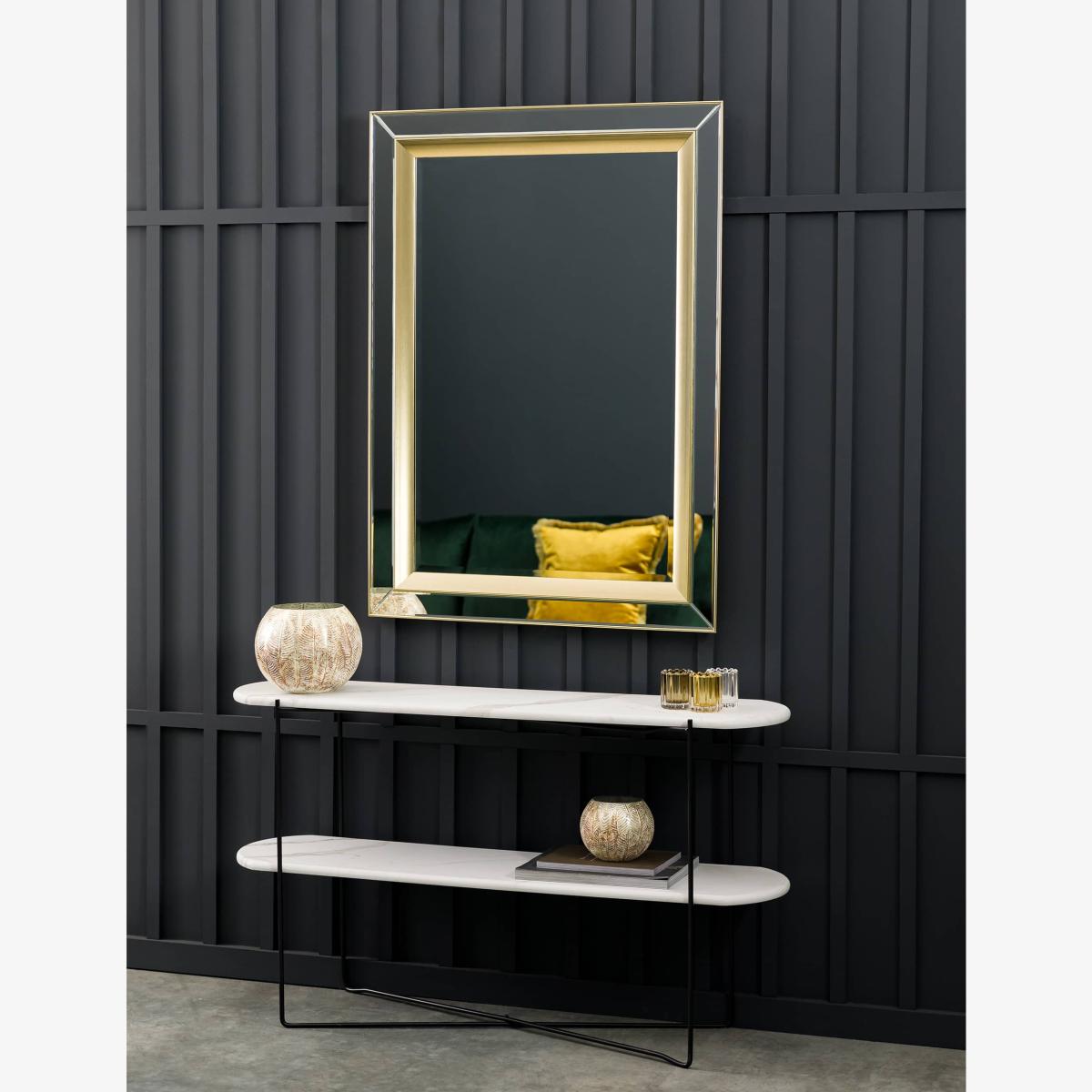 This wall mirror by Gallery Direct will make a sophisticated focal point for any space. The extra large rectangular design is framed by a contemporary bevelled edge that's detailed with an elegant gold-tone inlay and is ready to hang in a portrait orientation.