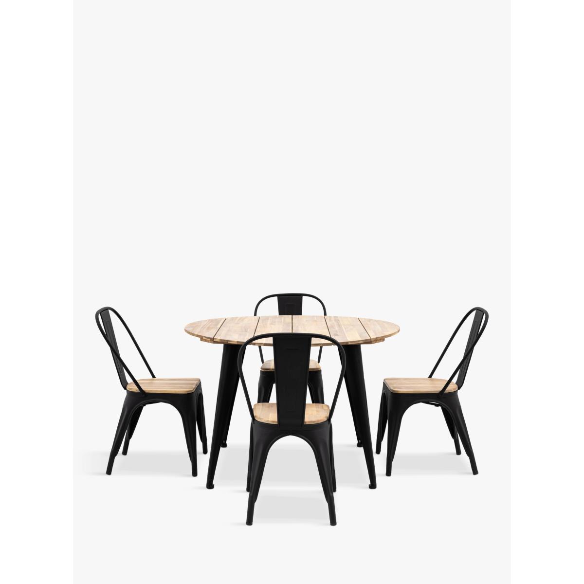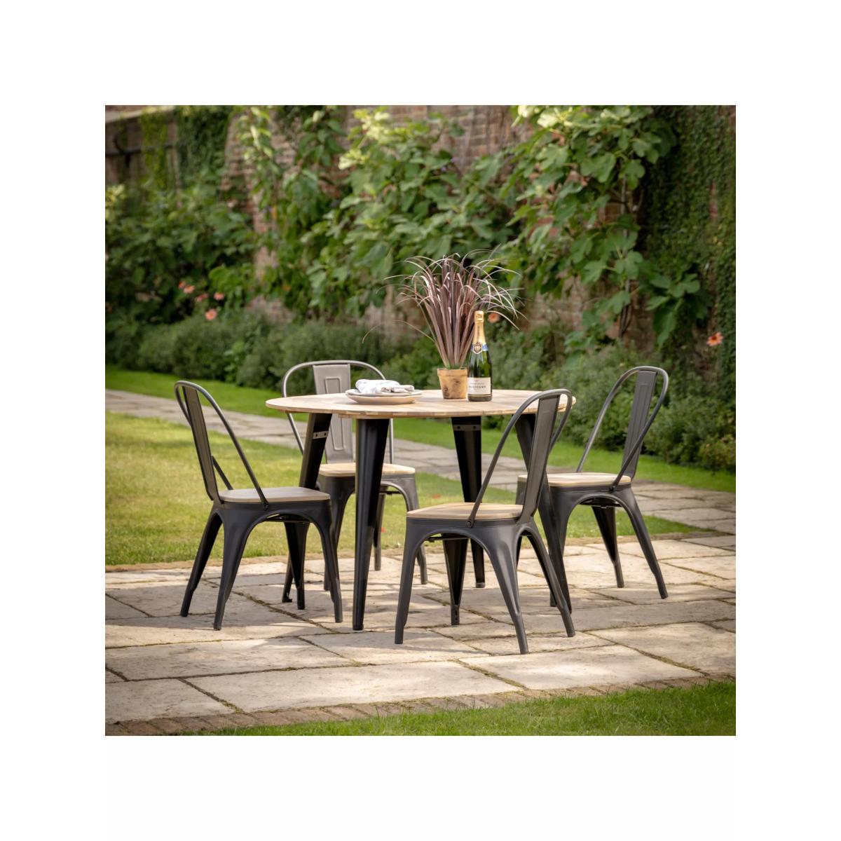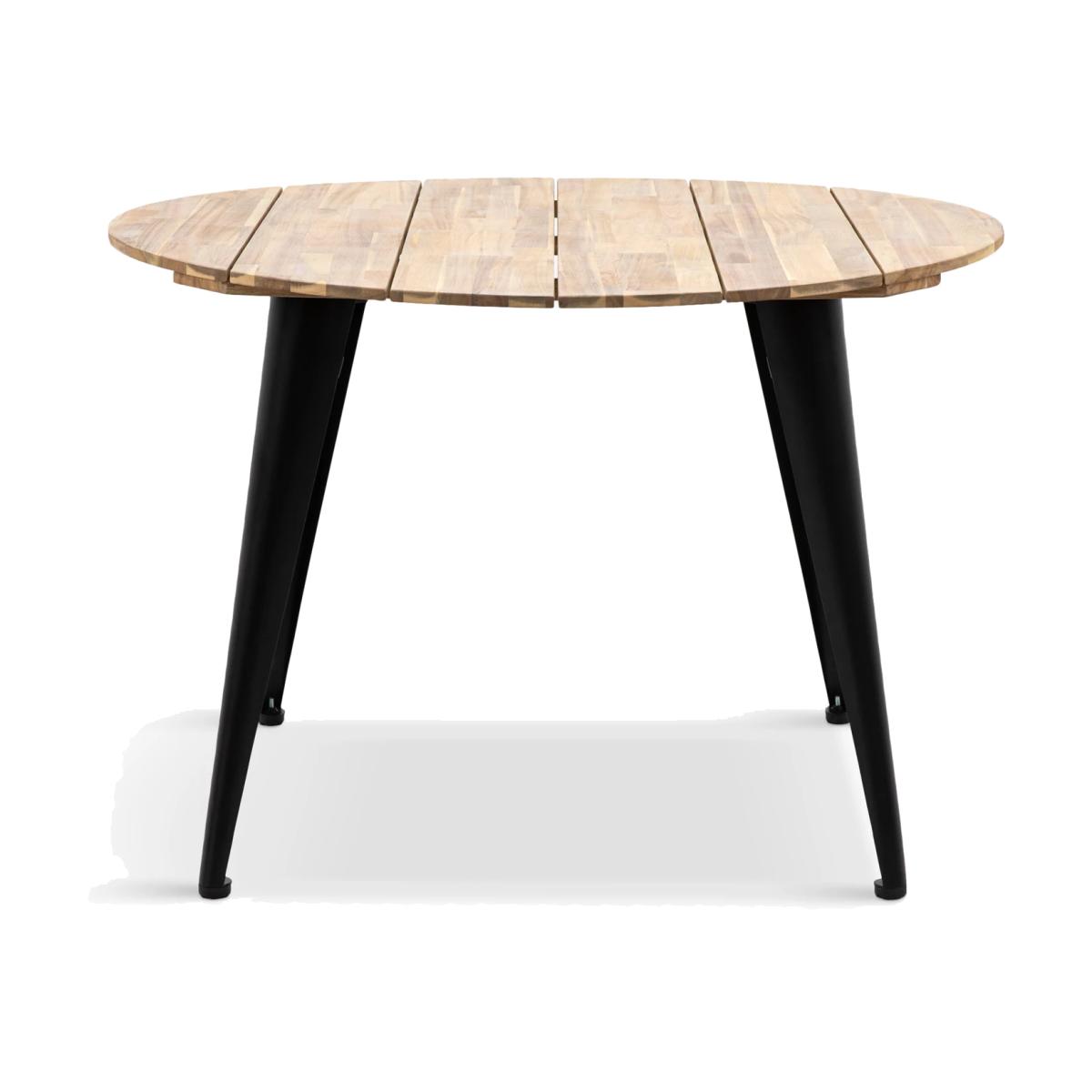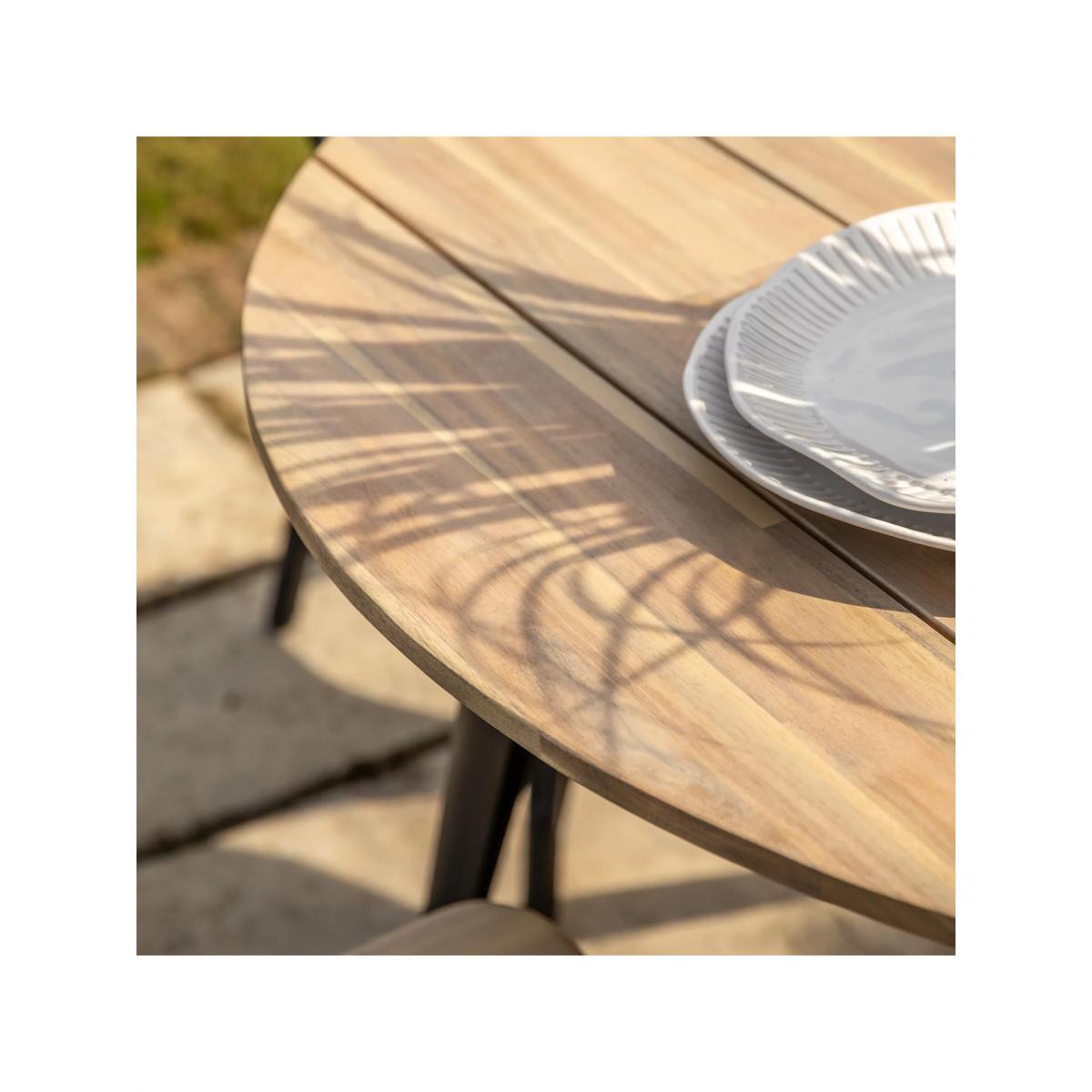 A modern industrial look for your outdoor space. This Ponza garden dining table from Gallery Direct has a round slatted acacia wood top that's naturally weather-resistant and has a natural finish. This design is completed with contrasting industrial-style powder-coated iron legs. The table seats up to four people comfortably.