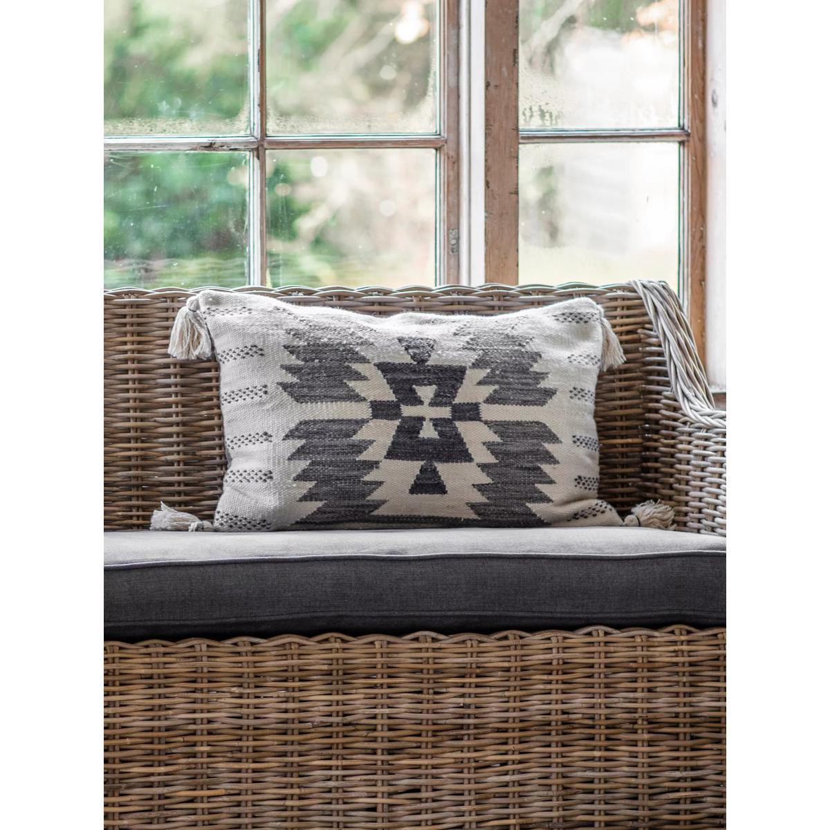 A blend of Aztec and Nordic styles, woven in natural grey and charcoal tones and featuring chunky corner tassels. Feather filled.