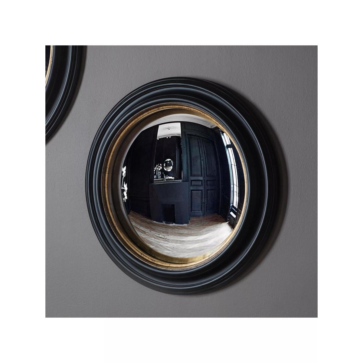 Classic round convex wall mirror. The traditional-style carved wooden frame is painted black with a gold-toned border in an antique finish. Have you thought about wall hooks and fittings?