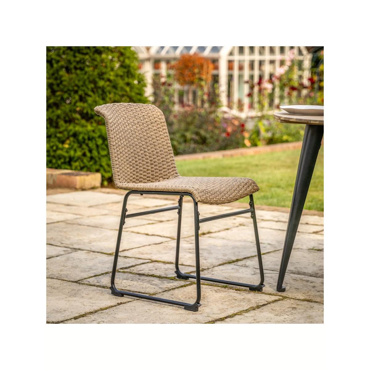 Sapri garden dining chair from Gallery Direct designed to complement a variety of outdoor dining tables. Made with a simple yet robust powder-coated steel frame and weather-resistant woven polyrattan seat and backrest.