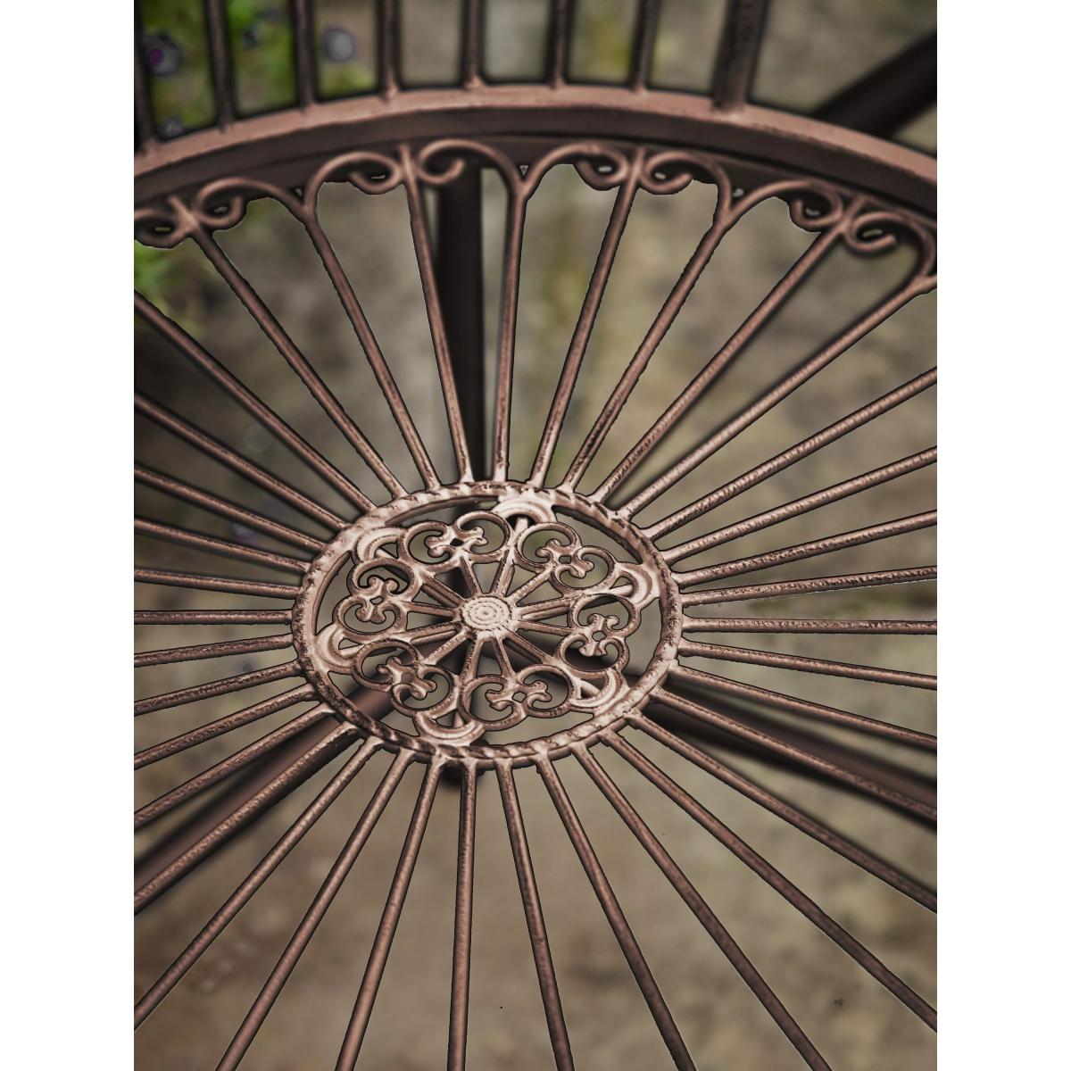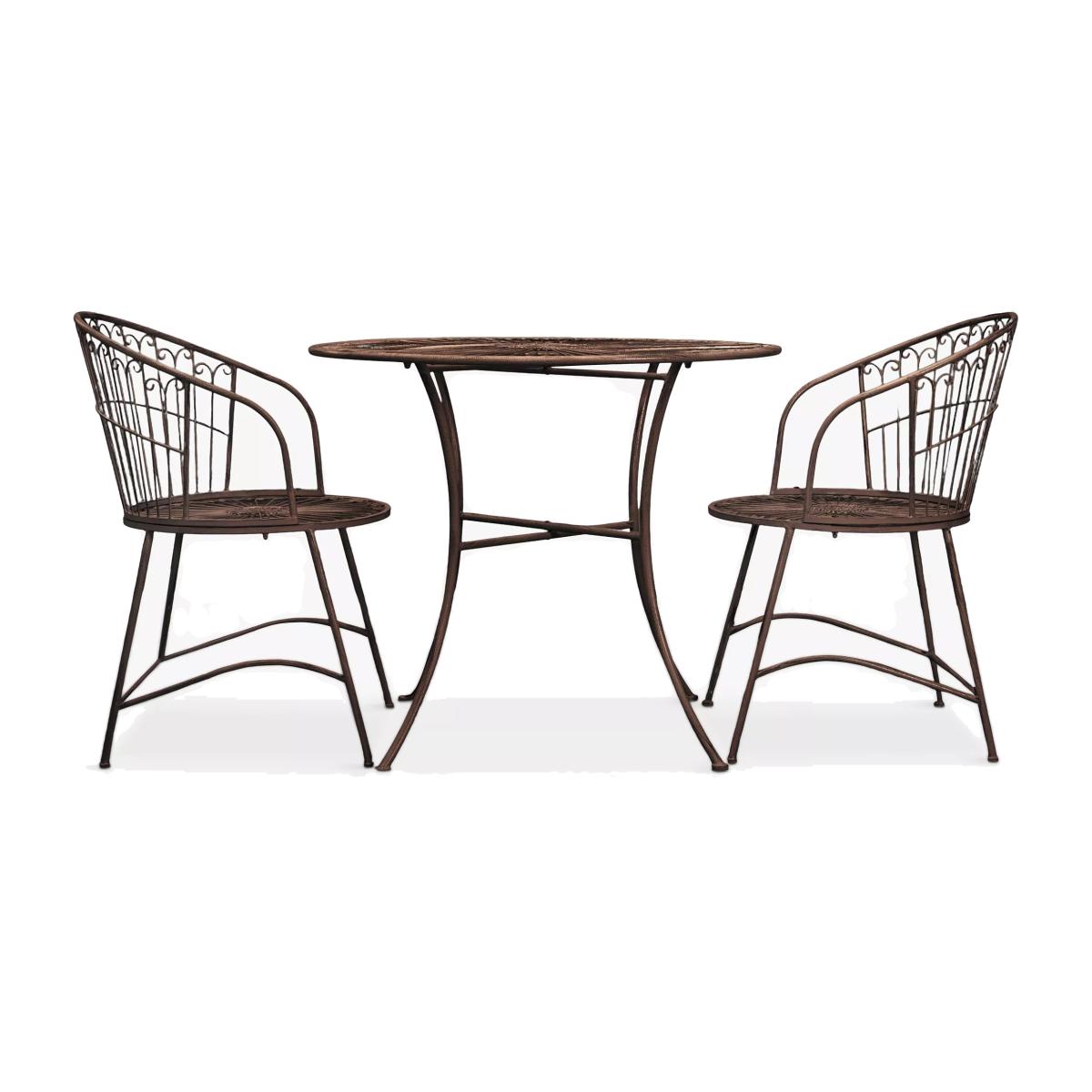 Two-seater Scada garden bistro set from Gallery Direct made from durable iron with intricate detailing and a choice of a dark metal patina finish or a distressed soft white finish. The flowing design on the round bistro table is echoed in the round seats and curved backs of the two chairs.