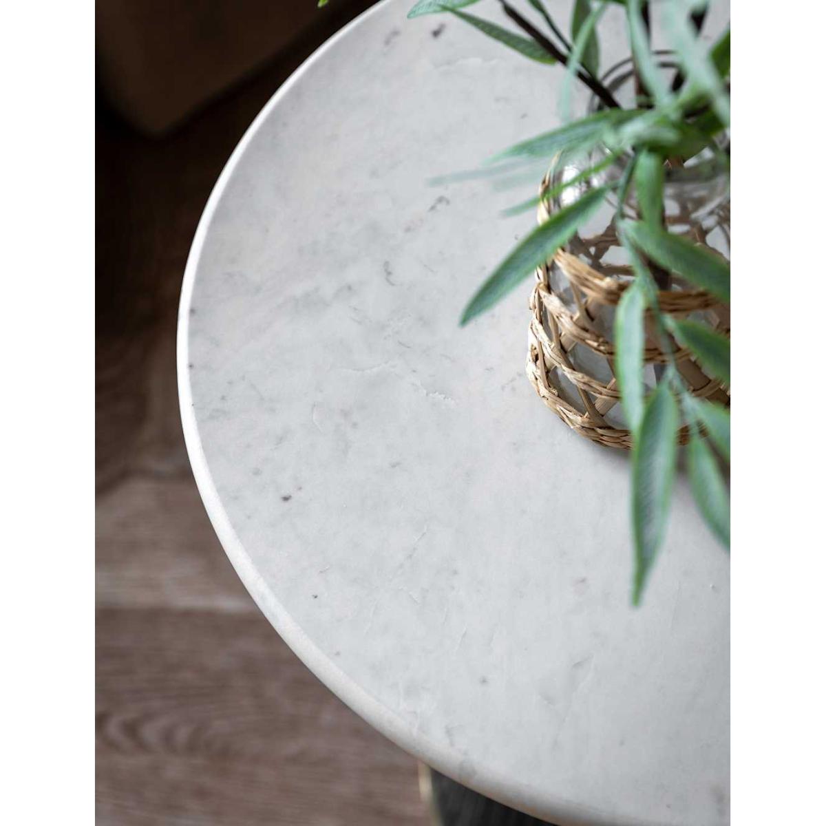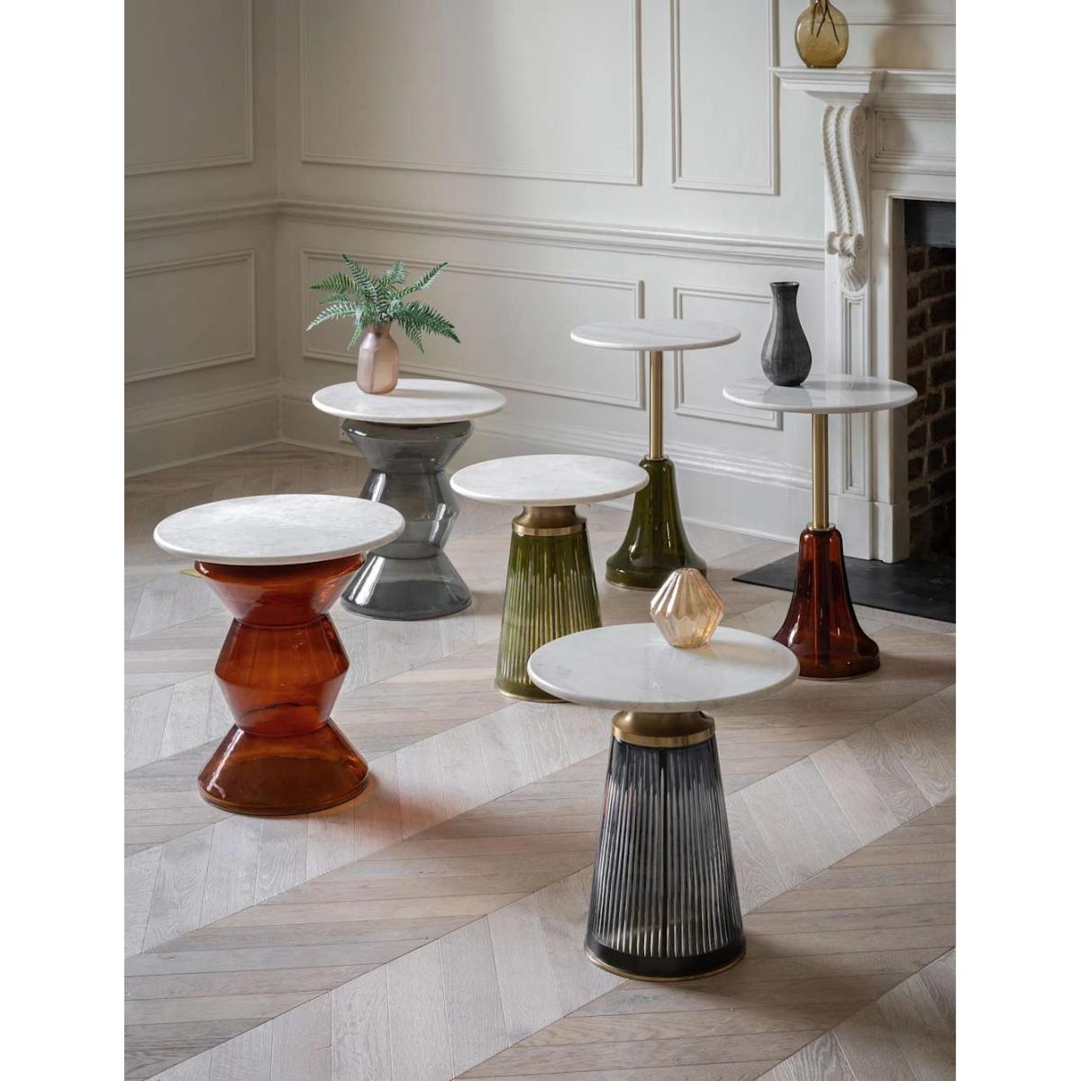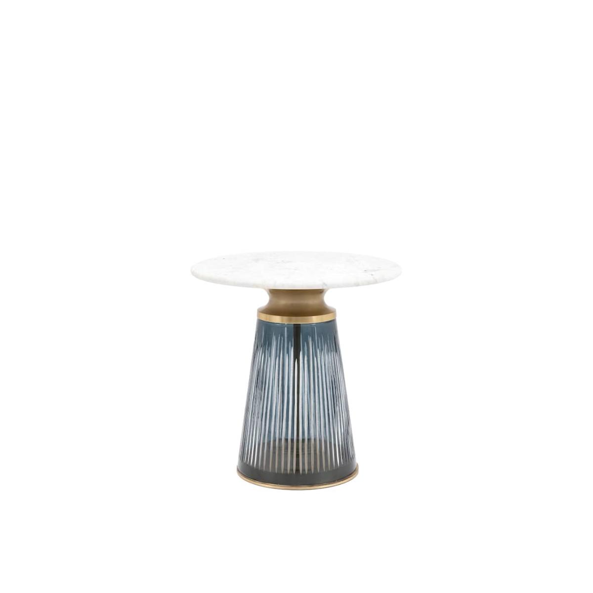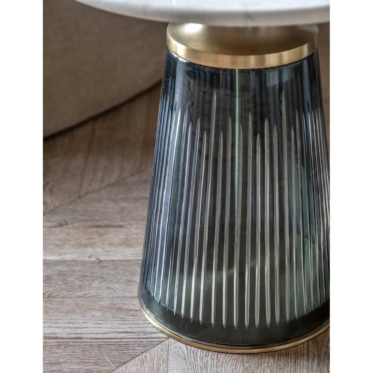 This Gallery Direct side table captures a vintage-inspired sense of glamour in its compact form. The round top is made from gleaming marble and sits on a fluted glass base for a contemporary silhouette. Brushed gold-tone details enhance the eye-catching effect.1 year warranty