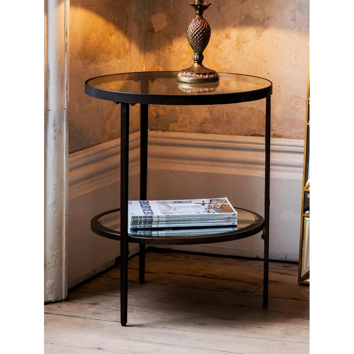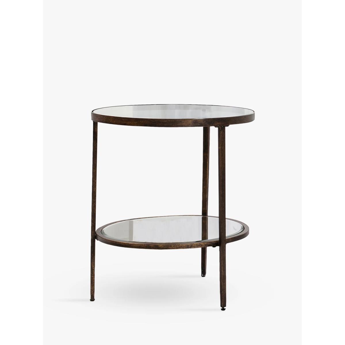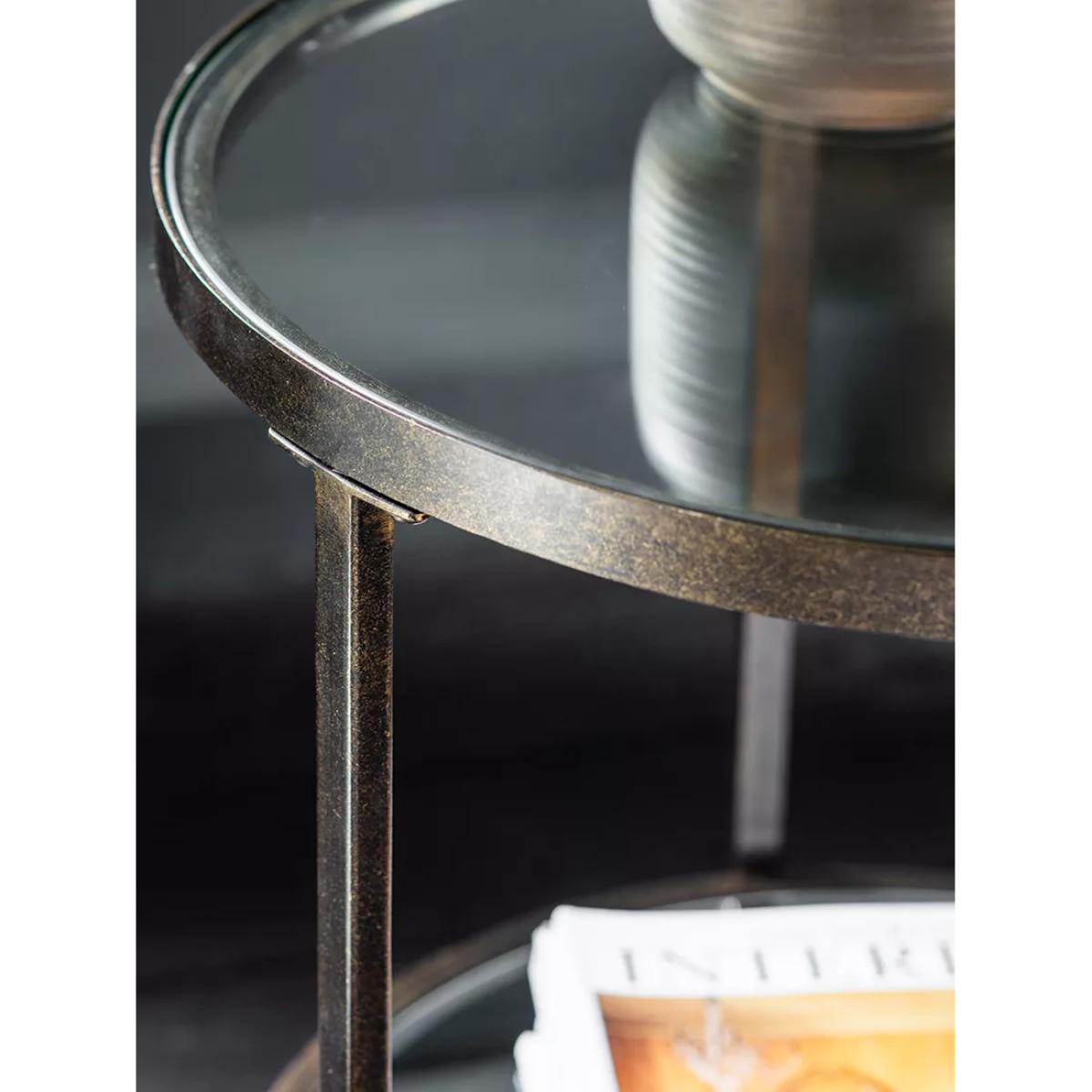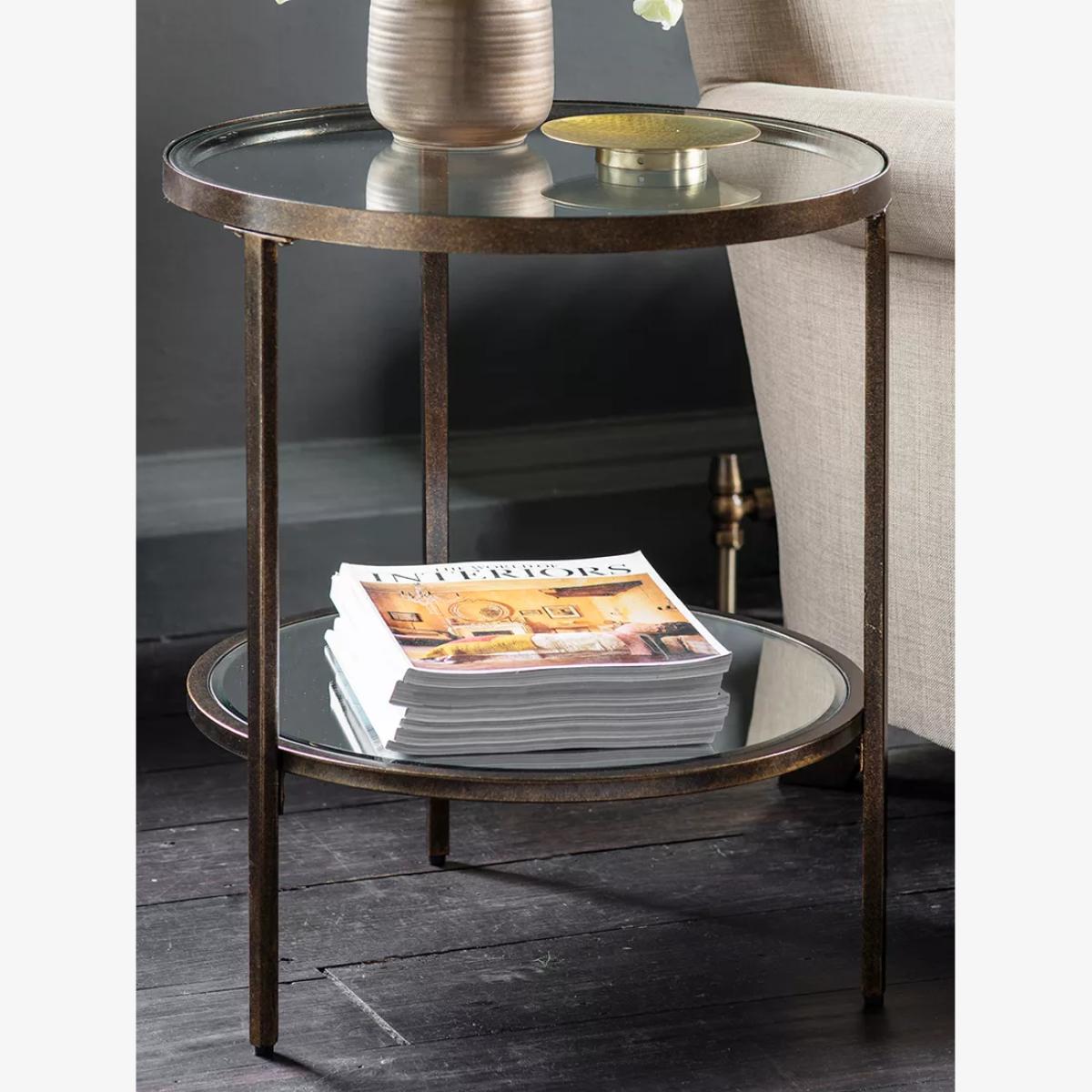 This round side table has an aged bronze finish with an inlaid, tempered glass top and mirrored shelf. Used as lamp table, the reflective surfaces will help bounce the light back into the room for a beautifully diffused glow, or place near a window to help catch and reflect natural daylight. Want to see it first? You may want to see and get a feel for the furniture in one of our shops before ordering. We'll be able to tell you where the range you'd like to view is on display.