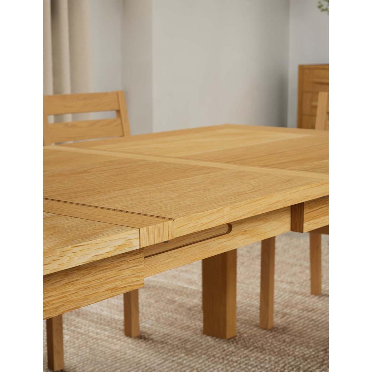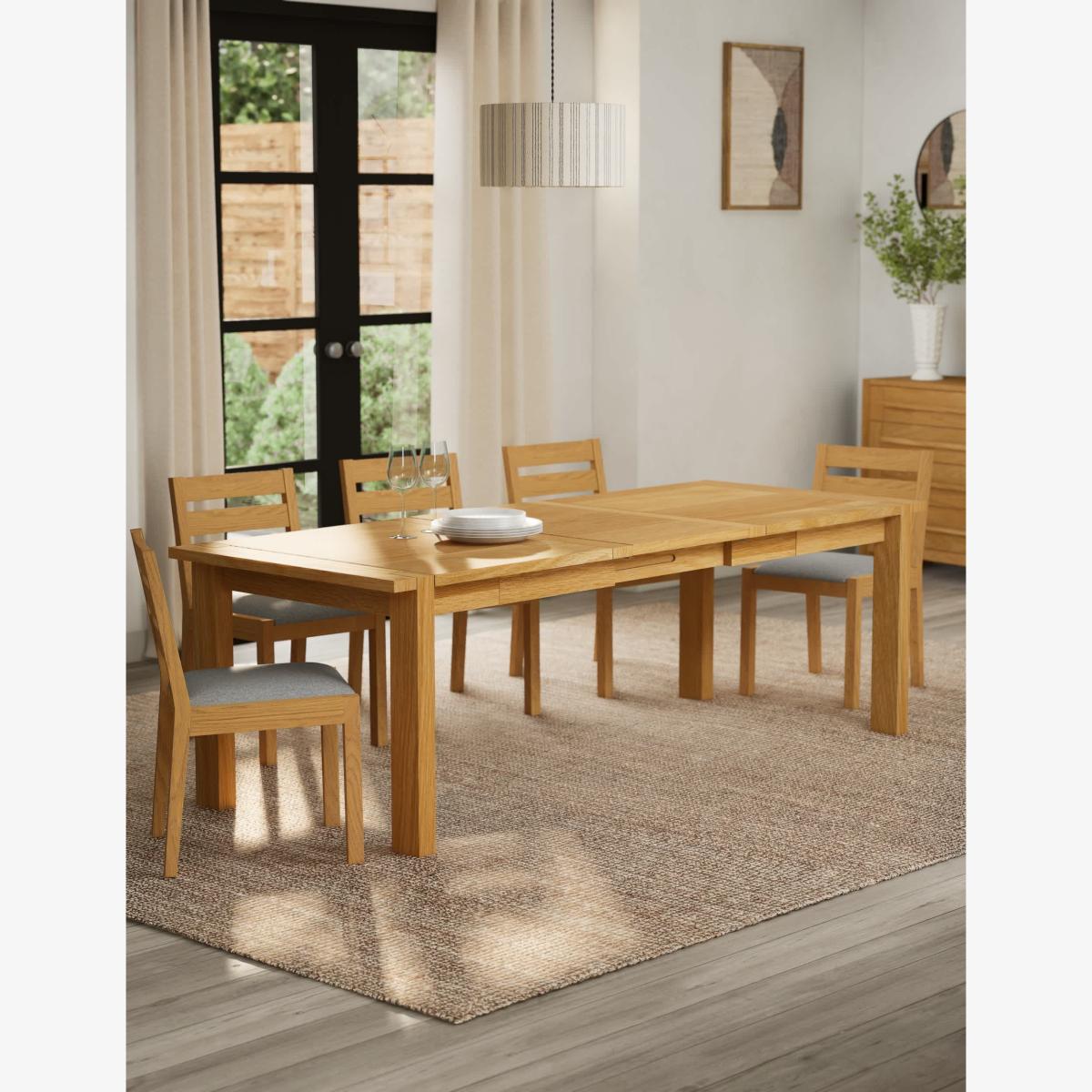 I love how the Sonoma extending table in oak combines clean lines with a warm, natural finish - perfect for both relaxed family meals and more formal dinner parties. Its simple silhouette works equally well in contemporary, Scandi-inspired or farmhouse settings and adapts easily as your guest list grows. For styling, keep the look fresh by pairing it with mixed seating (try a bench down one side and slim-backed chairs on the others) and layer a neutral linen runner or placemats to soften the wood grain. Add a low floral arrangement or a cluster of small ceramic vases in muted tones at the centre, and balance the warmth of the oak with a cool-metal pendant light hung centrally.