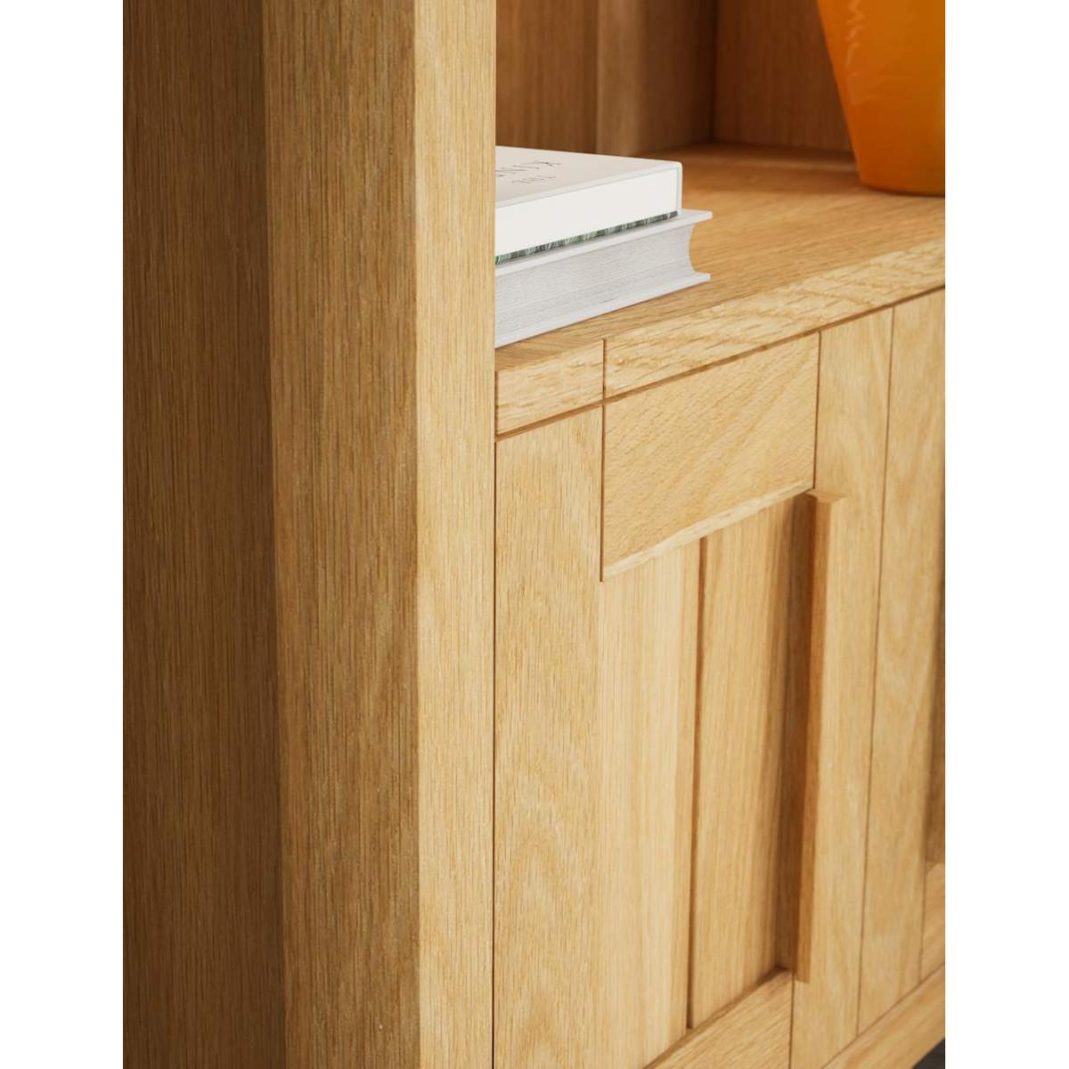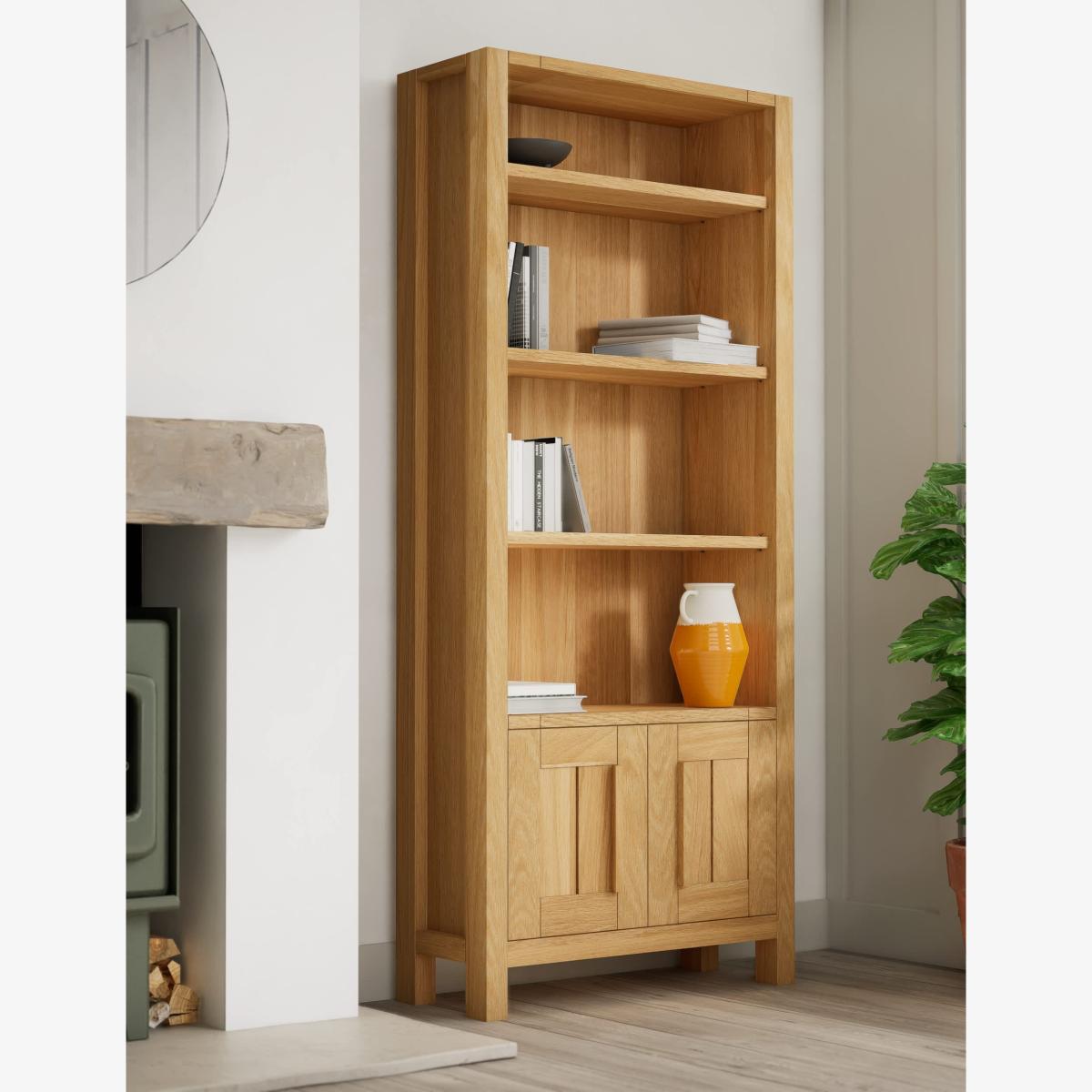 I’m a fan of this slim oak bookcase for its clean lines and warm, natural finish - it feels at home in Scandi-inspired, modern farmhouse or understated contemporary rooms. The soft oak tone brings in a subtle warmth without overpowering neutral or muted palettes. For styling, alternate books with decorative items such as ceramics or small plants, keeping a mix of heights to draw the eye upwards. Use the lower cupboard to hide less photogenic bits - think baskets of cables or paperwork - and leave a little breathing space on each shelf rather than cramming it solid. A couple of art books laid flat topped with a sculptural object adds interest, while a trailing plant softens the straight edges.