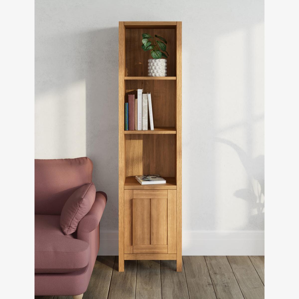 I love this narrow bookcase because it offers a sleek, tall profile that suits smaller spaces while still providing ample storage. Its oak finish adds warmth and versatility, making it a great fit for both modern and traditional interiors. It works particularly well in living rooms, home offices, or even bedrooms where space is limited. For styling, consider keeping it minimal with a few well-selected books, a decorative vase, or small indoor plants to add visual interest without clutter. Its narrow width makes it ideal for filling tight corners or placing alongside larger furniture pieces, helping to maximise storage without overwhelming the room’s layout.