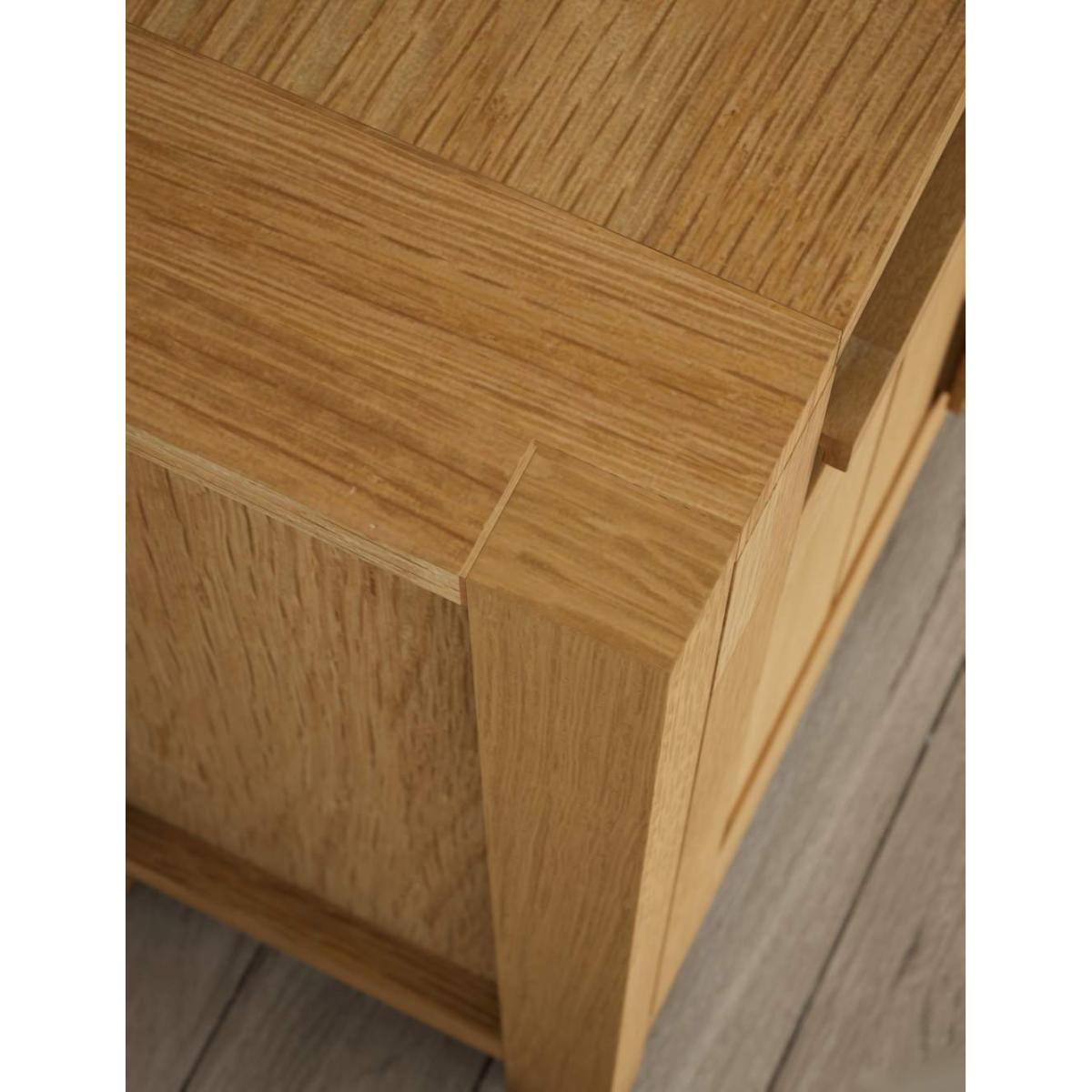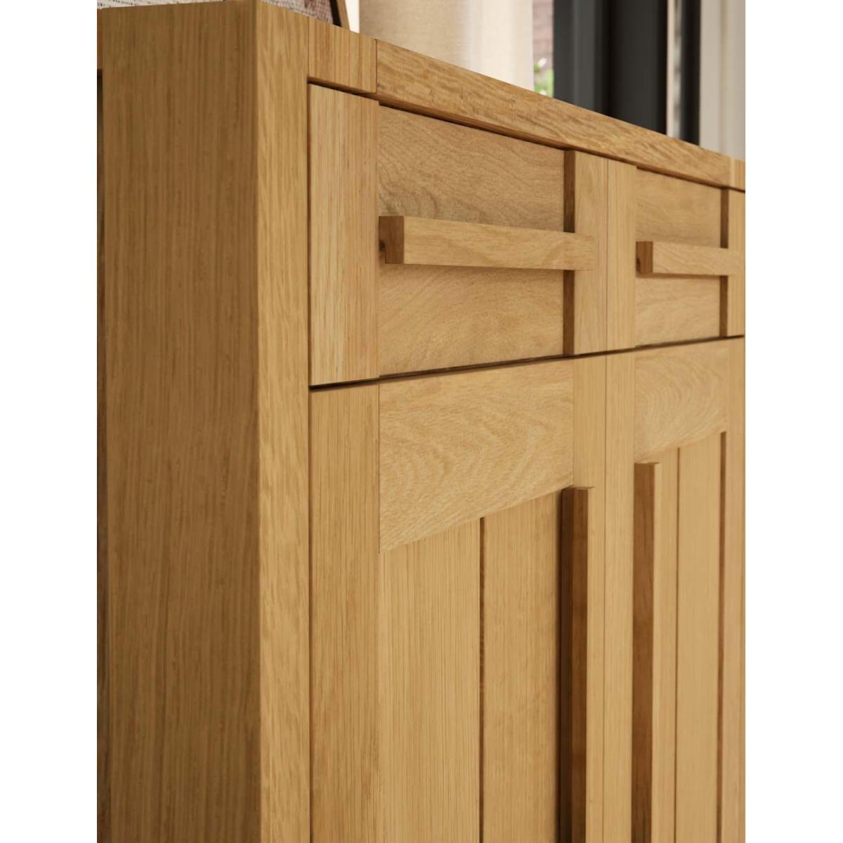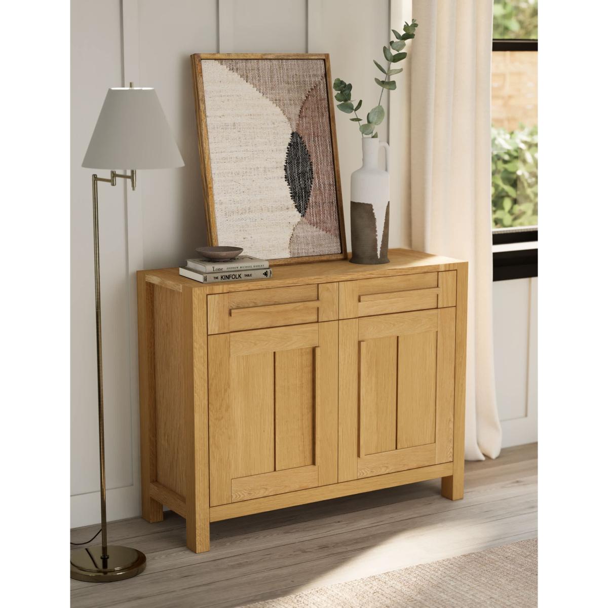 I love this sideboard for its clean lines and warm oak finish, making it a versatile piece that can complement both contemporary and traditional interiors. It works particularly well in living rooms, dining areas, or even a hallway, providing practical storage without feeling bulky. To style it, consider layering with a mix of ceramics, candles, or framed artwork on top to add visual interest. Keeping accessories minimal will highlight the craftsmanship of the oak, while a couple of colourful or textured accents can break up the natural tone and add personality. Overall, it’s a practical, timeless addition that keeps your space feeling warm and inviting.
