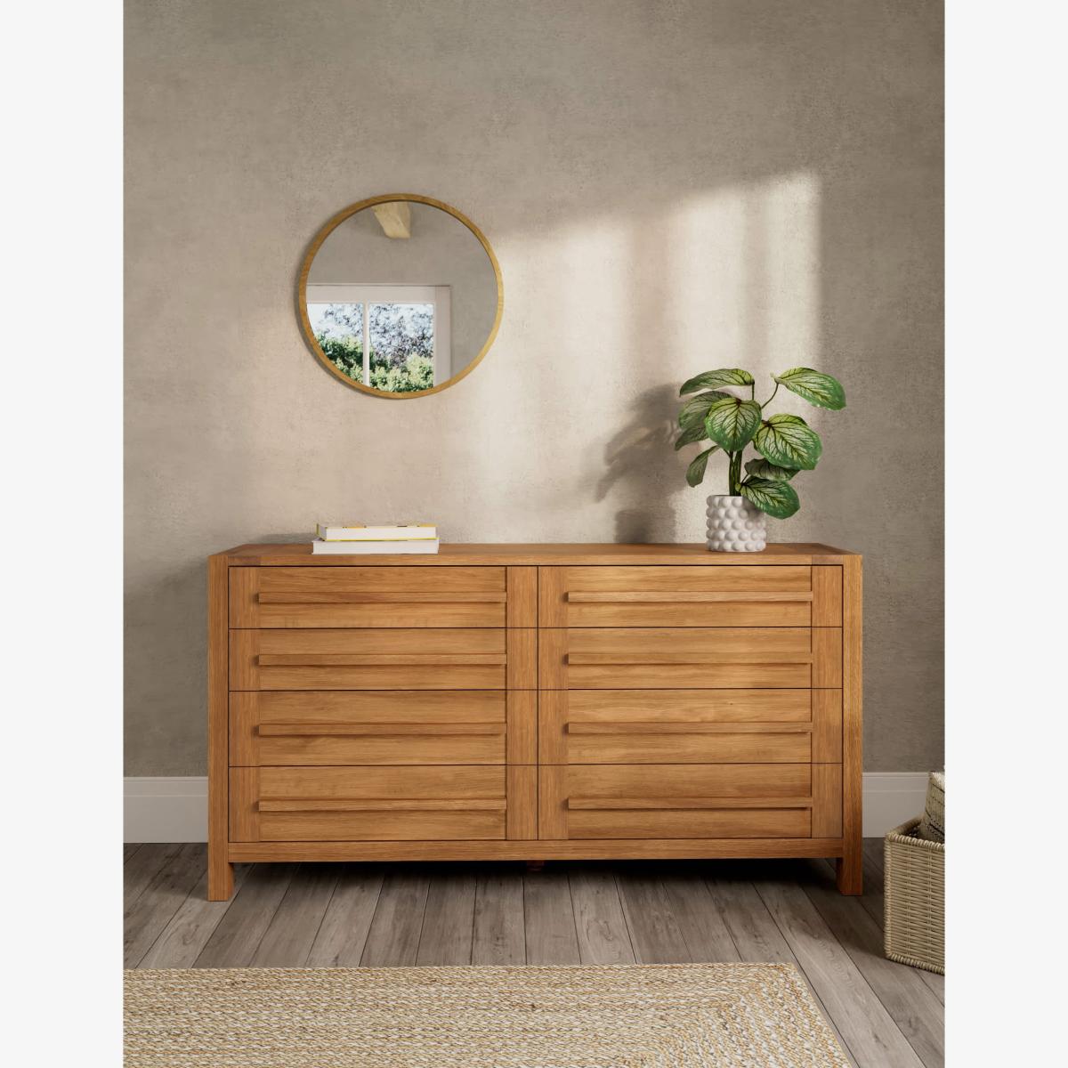 I love this piece for its clean, modern lines and warm oak finish, making it versatile enough to suit both contemporary and scandinavian-inspired interiors. It’s practical too, offering ample storage with its wide 8 drawers-ideal for keeping bedrooms neat or even doubling up as a stylish media storage unit in living spaces. For styling, I recommend pairing it with minimalist accessories, such as a simple table lamp or framed prints on top, to keep the look fresh. Incorporating natural textures or soft textiles nearby can enhance the warm wooden tone, making the space feel inviting and well balanced.