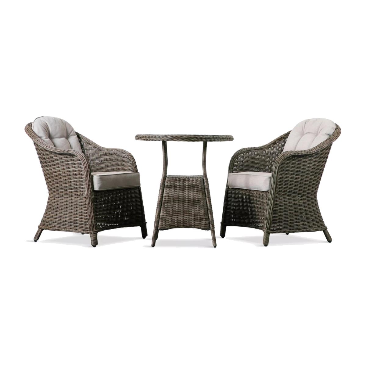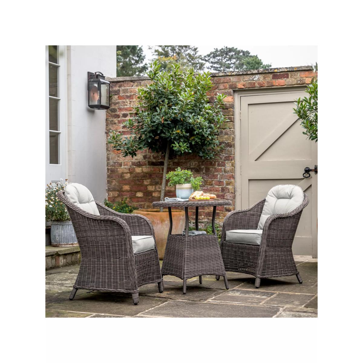 A traditional-style garden furniture design, this Sovera two-seater bistro dining set from Gallery Direct features two garden dining armchairs and a round bistro table. All pieces are crafted from all-weather 5mm synthetic rattan with a hand-woven mixed half-round/full-round weave. For comfort, the set has luxurious showerproof seat and backrest cushions complementing the colour of the rattan. The frames are made of weather-resistant powder-coated aluminium. Key features: Two garden dining armchairs Round garden casual bistro dining table All-weather 5mm synthetic rattan Robust yet lightweight powder-coated aluminium frames Shower-resistant seat and backrest cushions