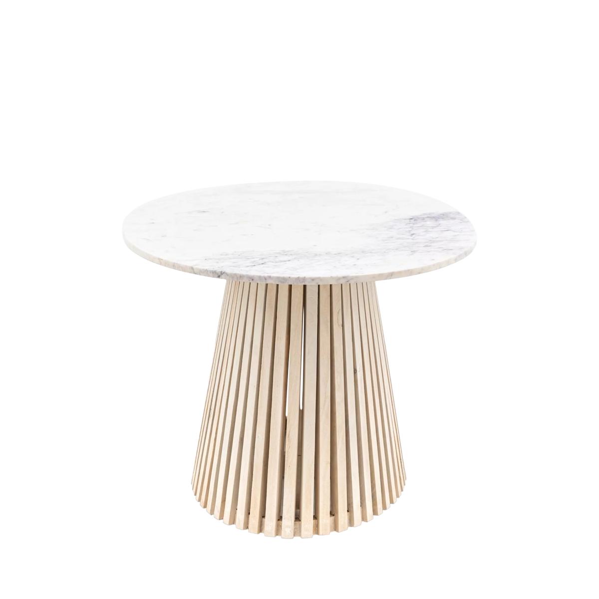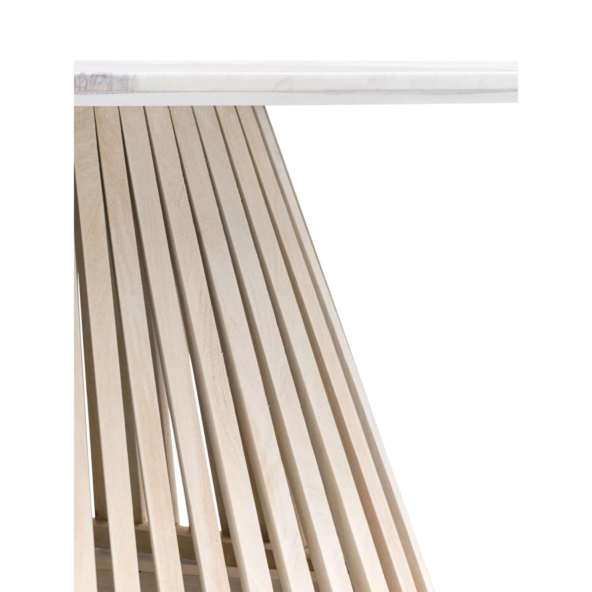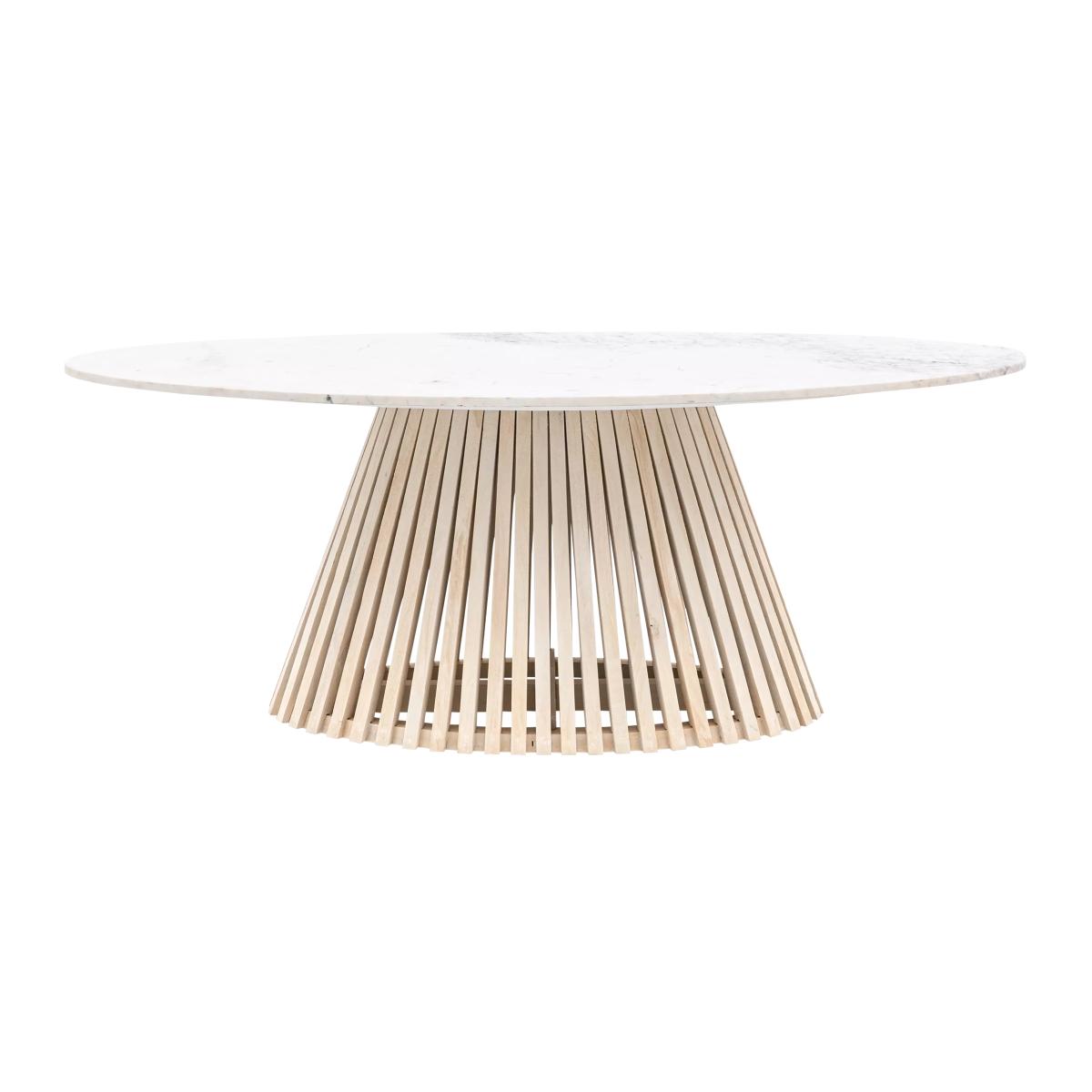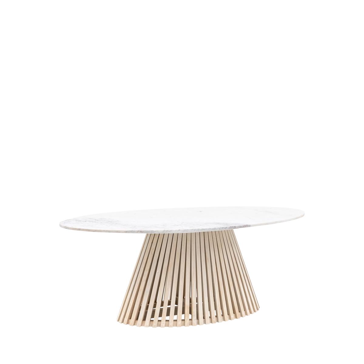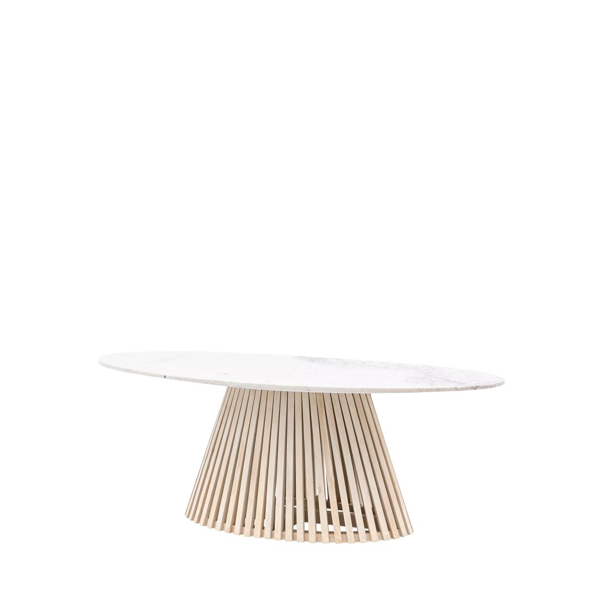 Offering stylish contemporary design, this beautiful oval dining table has a stunning white Indian marble top which is paired with a stunning base to create an elegant, classy table. The base is crafted from gently sloping slats of mango solid timbers with a white-washed, sand-blasted finish, creating a striking design feature. Want to see it first? You may want to see and get a feel for the furniture in one of our shops before ordering. We'll be able to tell you where the range you'd like to view is on display.