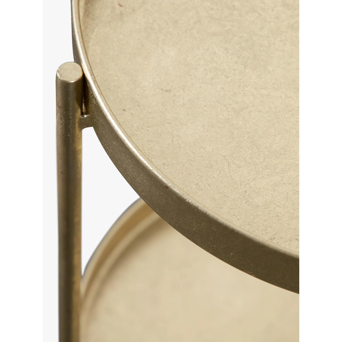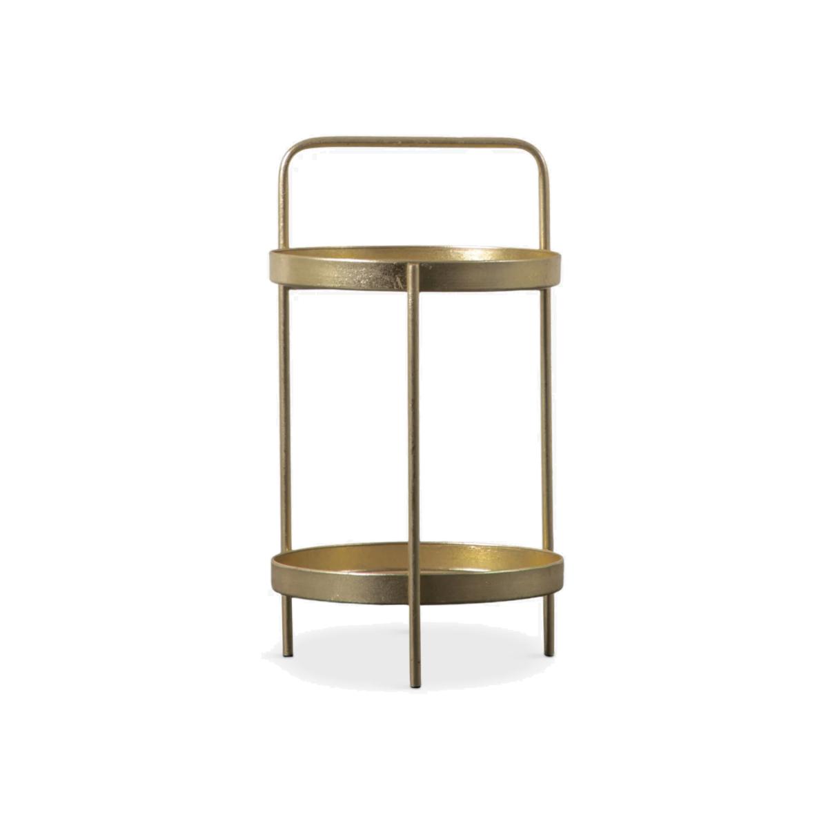 A compact side table, made from sturdy iron with a tray-style top and lower shelf. Its unusual design features a continuation of one section of the base, up and over the table to create the illusion of a handle. Available in a contemporary black or industrial gold leaf finish. Want to see it first? You may want to see and get a feel for the furniture in one of our shops before ordering. We'll be able to tell you where the range you'd like to view is on display.