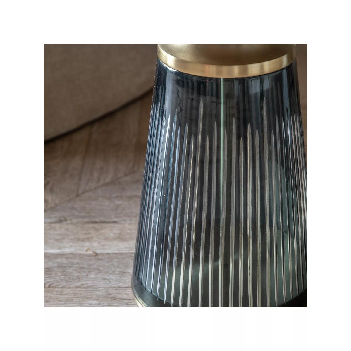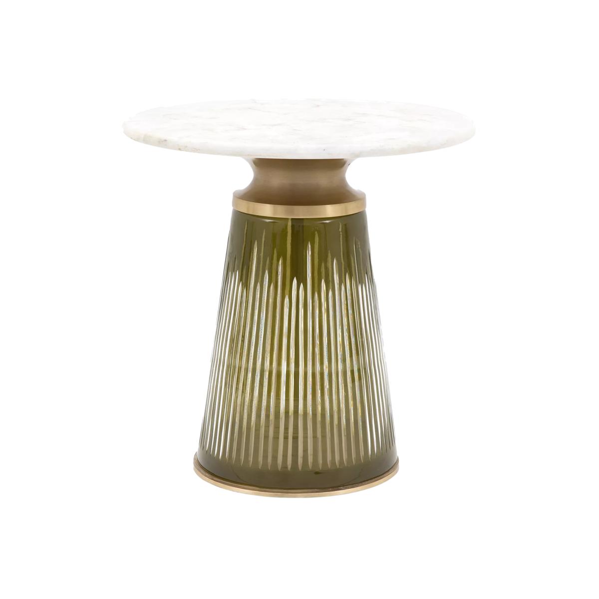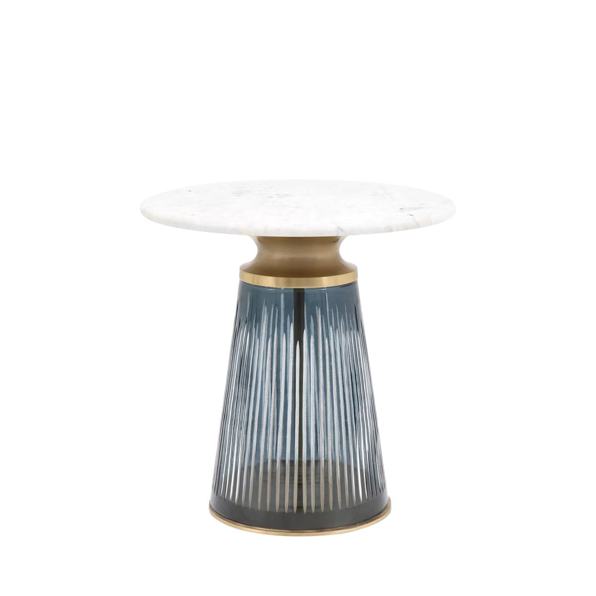 Add some luxe to your room with this unique side table. The incredibly stunning tonal glass base features a unique design of liner striations which is not to be outdone by the metal collars and the ultimate in luxury, a white marble table top. Want to see it first? You may want to see and get a feel for the furniture in one of our shops before ordering. We'll be able to tell you where the range you'd like to view is on display.