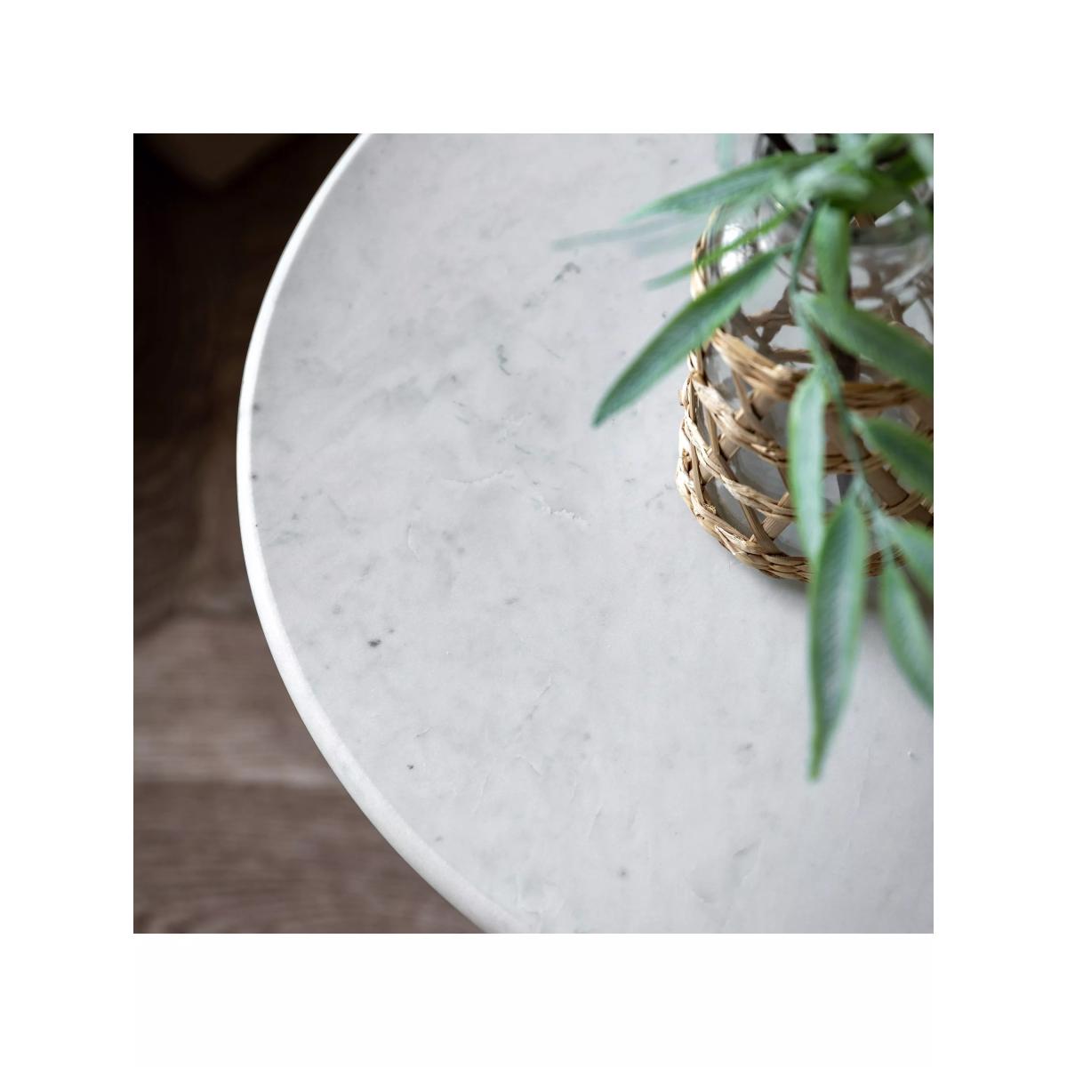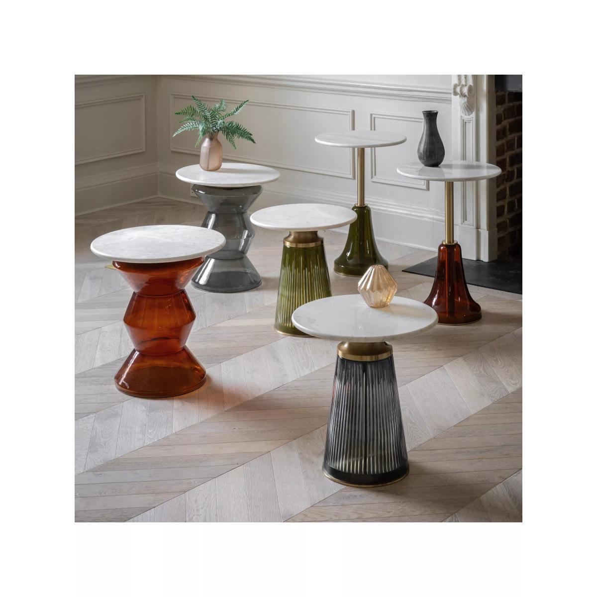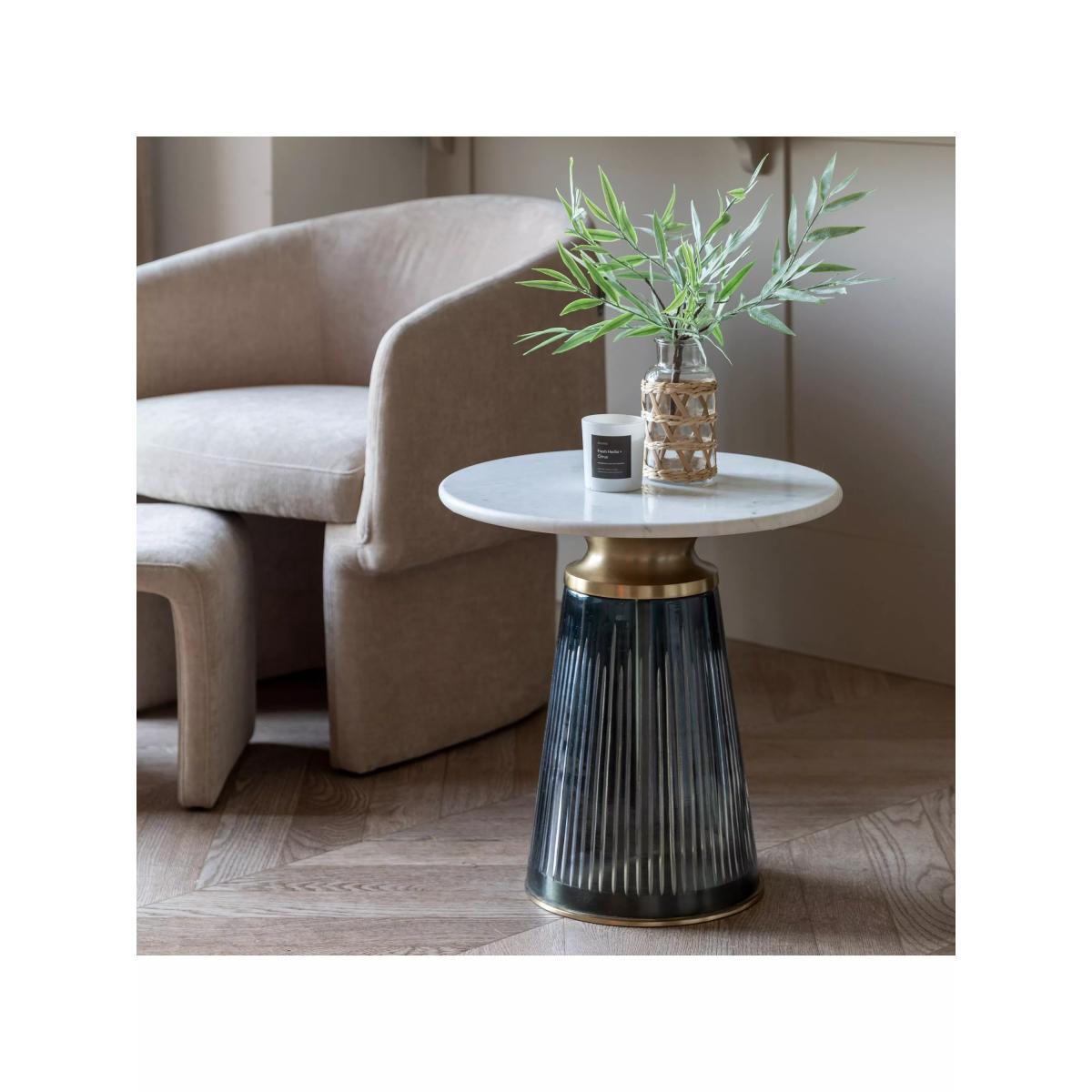 I love this piece because it combines elegant materials with a versatile silhouette, making it a great addition to both modern and eclectic interiors. The combo of the marble top and ribbed glass base adds visual interest without feeling heavy. It works particularly well in living rooms or bedrooms as a side table for lamps, books, or decorative accents. To style it effectively, consider pairing with metallic accessories or a small plant for colour contrast. It’s practical too-it offers a sturdy surface with a distinctive look that's perfect for gathered spaces or more minimal settings.