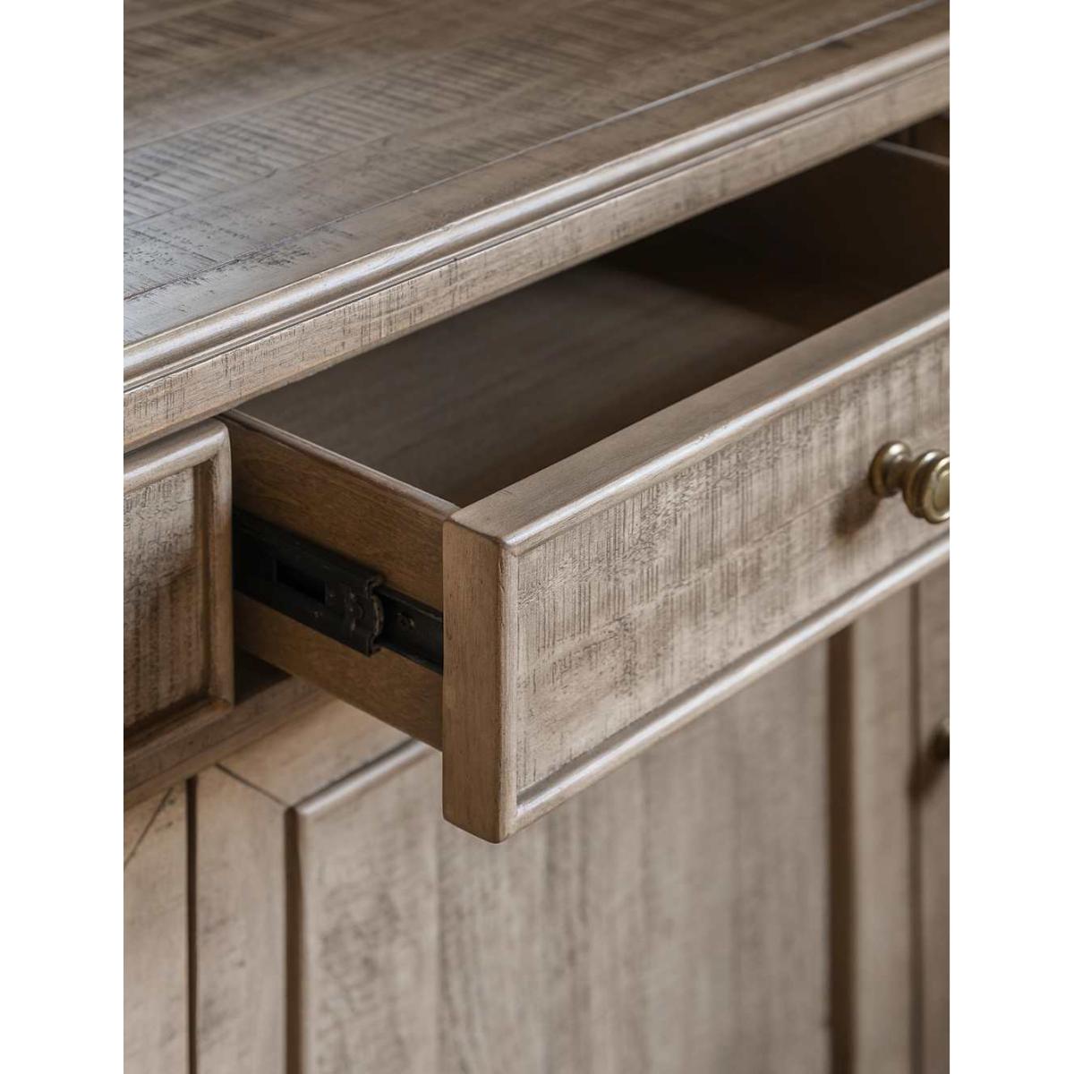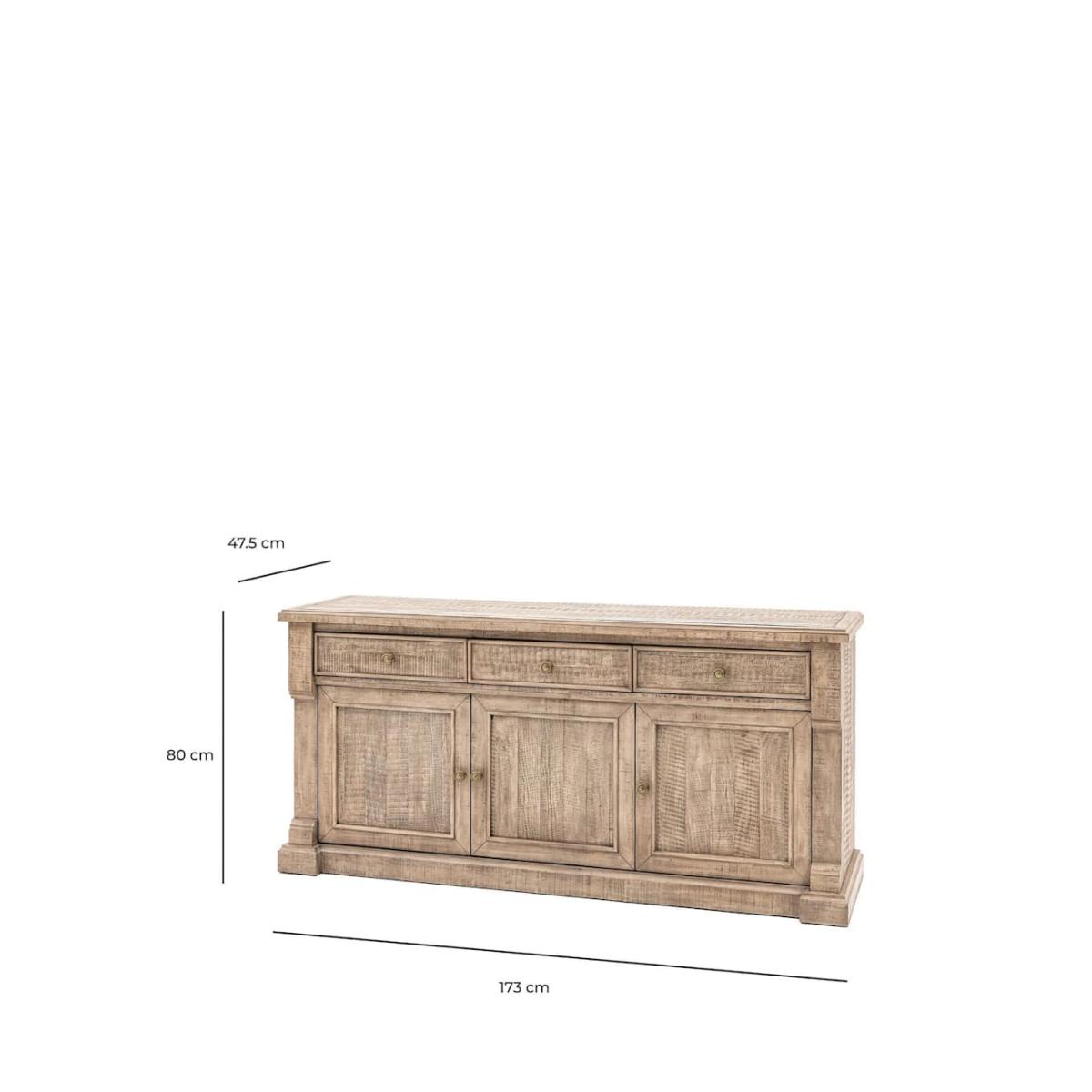 Gallery Direct's Vancouver sideboard is a practical and sophisticated piece that's full of rustic character. It's crafted from North American solid pine and pine veneers, with a tactile cross-sawn surface created by a mill-saw technique for a distinctive finish. The symmetrical three-door, three-drawer layout provides ample storage.