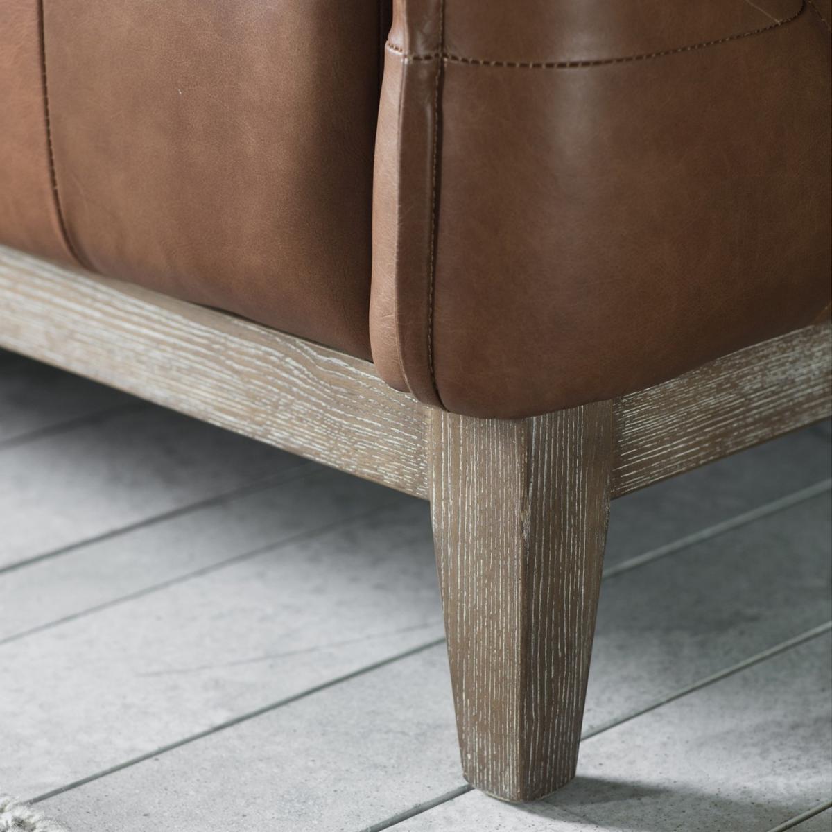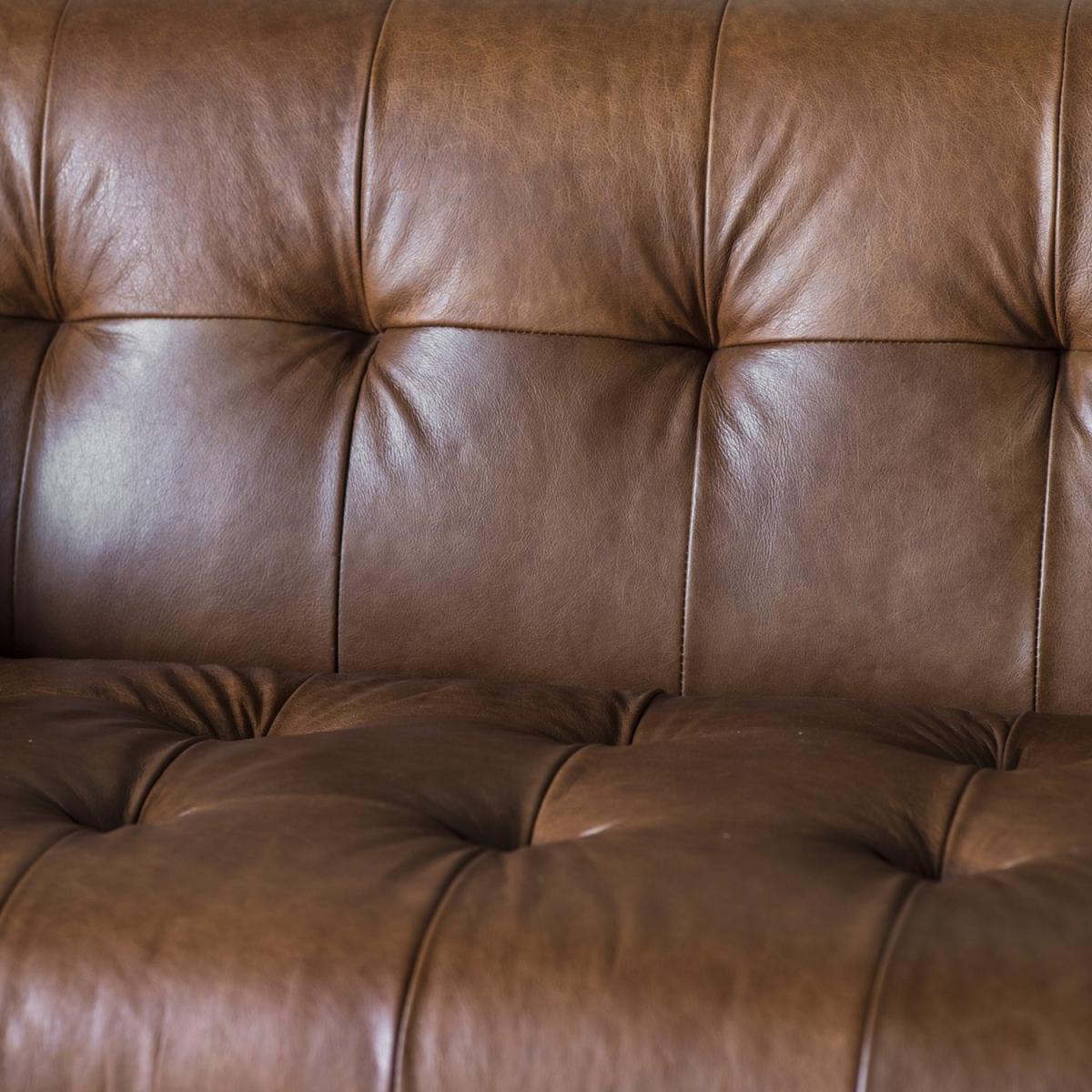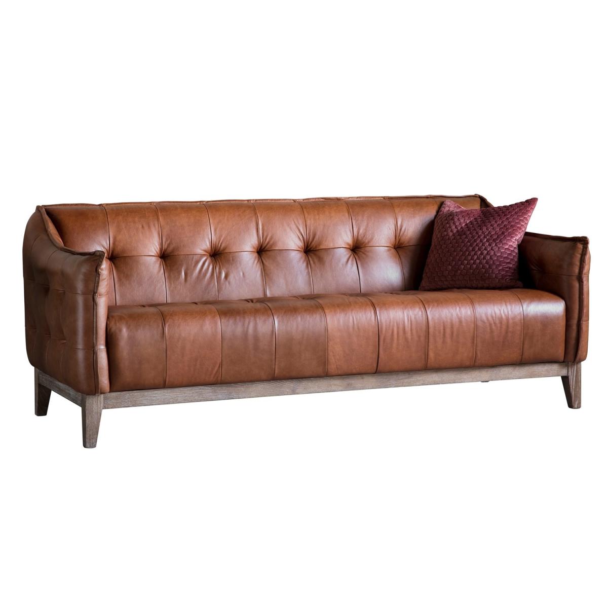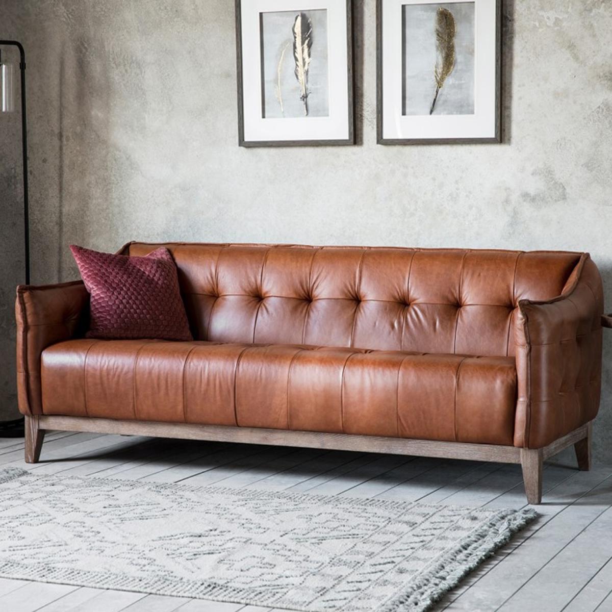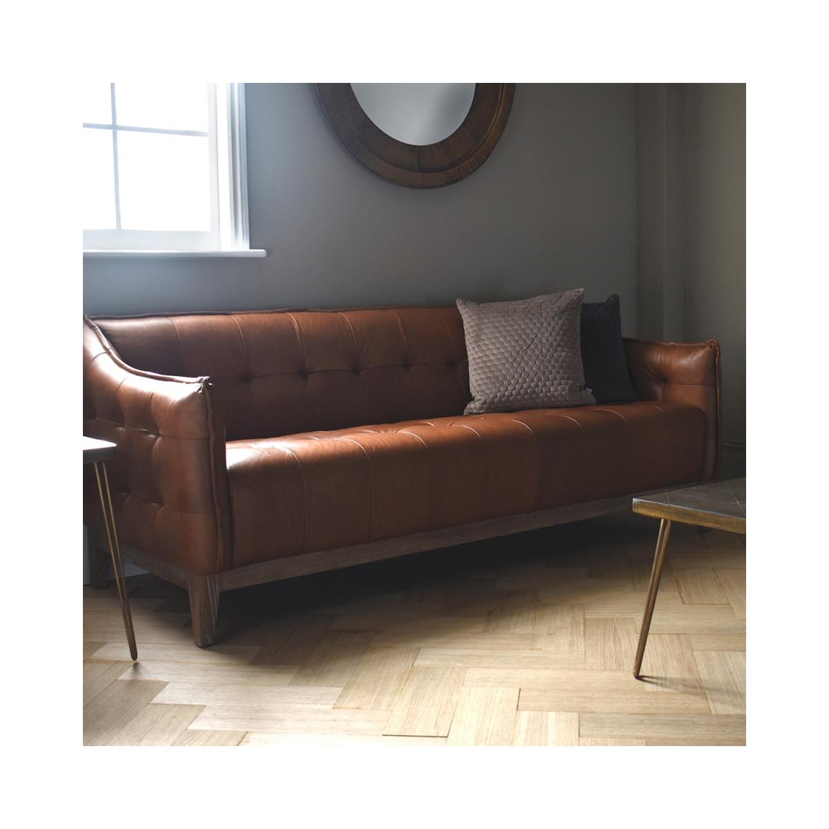 Features we love Interest Free Finance available on this sofa. Vintage style adds a warm cosy and rustic touch to your space Genuine top grain mellow brown leather finish lasts a lifetime. Solid ash frame and legs are highly durable as well as stylish. Decorative button detailing adds a plush look. Comfortably accommodates three. No assembly required All about me. This Ecclestone sofa is a beautiful fusion of contemporary and classical styling. The refined design is covered in beautiful top grain mellow brown leather that's soft and full of charm it's sure to enthuse your space with a rustic warm and cosy look. It features elegant button detailing on the back cushion and seat giving a plush look as well as a supportive and comfortable lounging experience. There's plenty of space to lounge on this sofa with its deep seats and it can comfortably accommodate three. The sofa has a premium build using solid ash timber for the frame which continues down to the stylish block feet. The tan brown finish will last a lifetime as its genuine top grain leather which showcases stunning natural features. Adding this statement piece to your home is easy as there's absolutely no assembly required. Need to know. Dimensions. H78 x W192 x D82 cm Material. Solid ash Finish. Top grain mellow brown leather Assembly required. No.