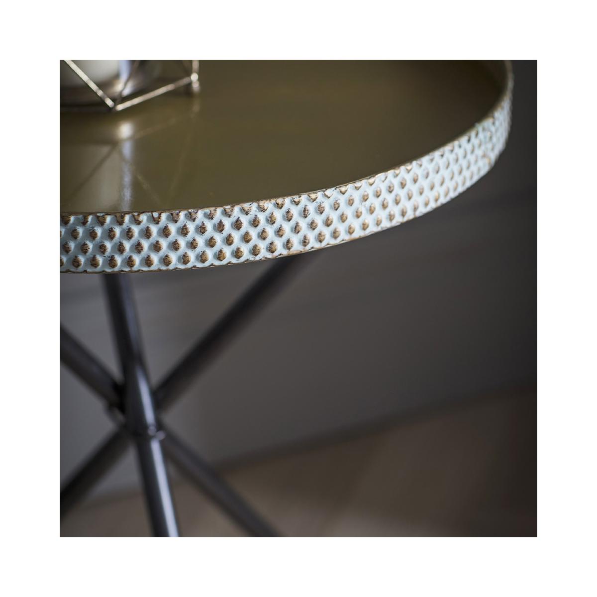 A unique bedside table with tripod legs, a high walled tray table top, a distressed white hammered finish, contrasting gold surface with extra gold detailing at the bottom of the legs.